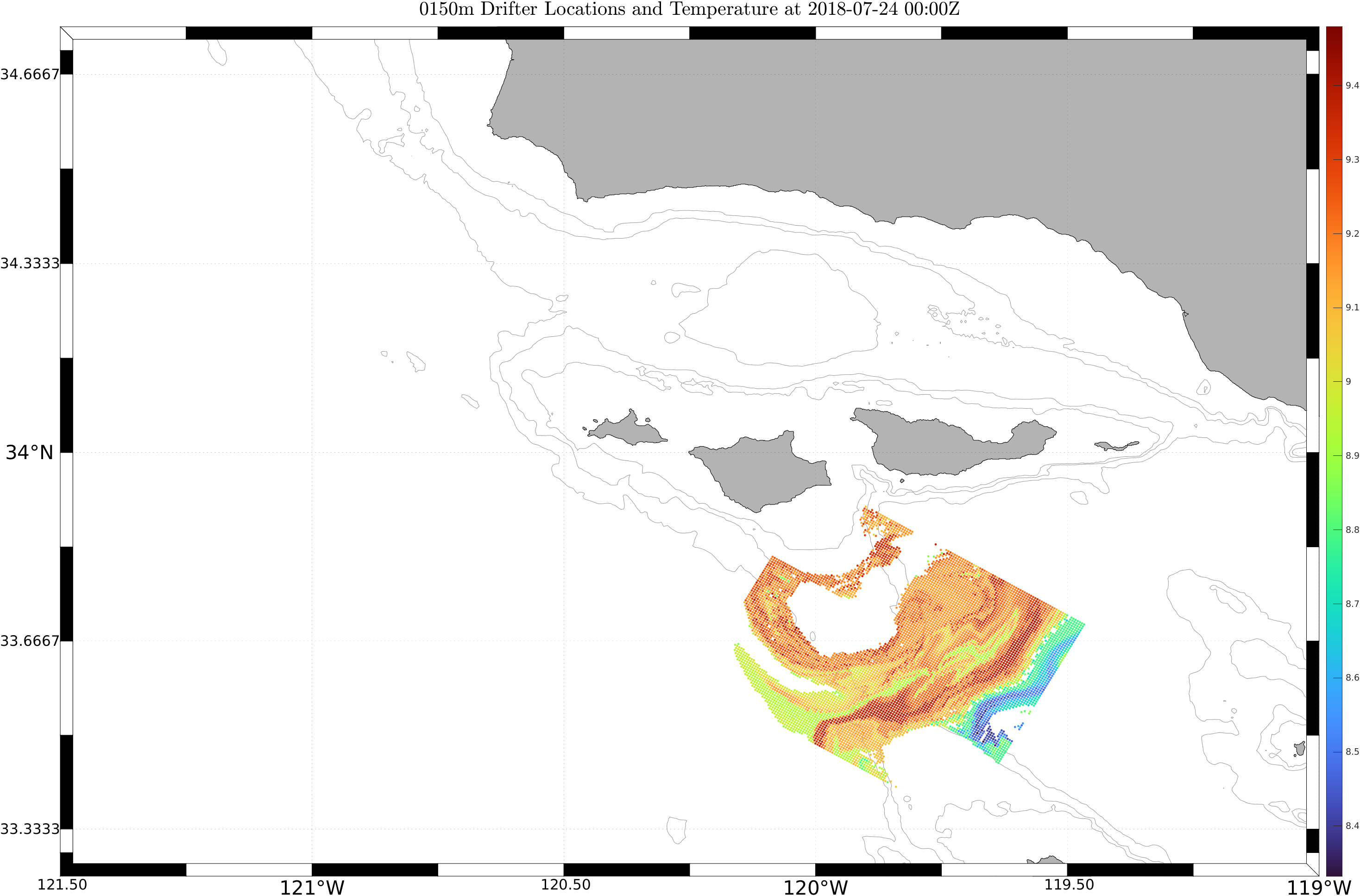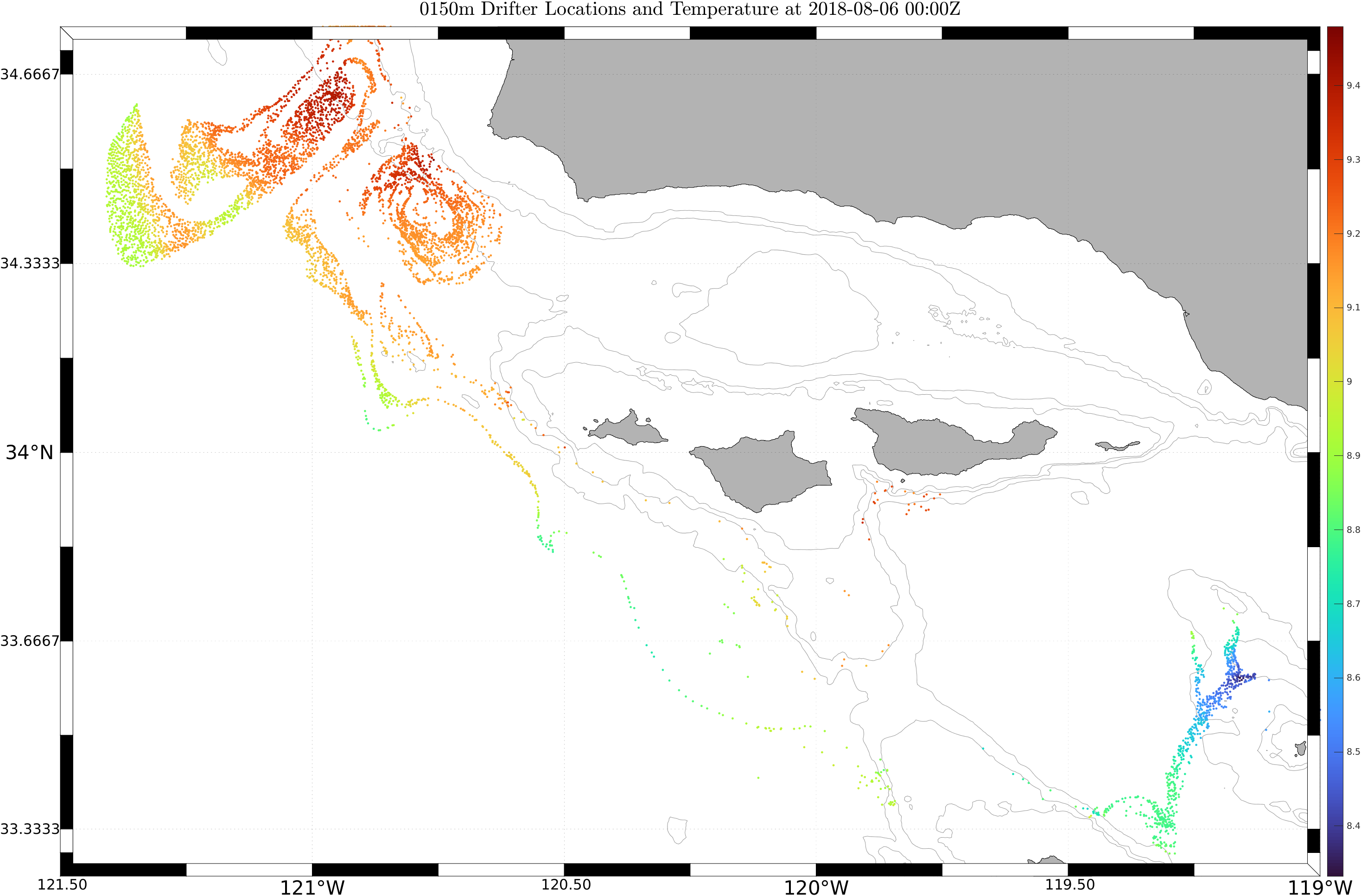 - Next, we show the initial 2018-07-24 00Z and final 2018-08-06 00Z locations of isobaric floats released at 150 m on 2018-07-24 00Z around the Santa Rosa and San Miguel islands, colored by their starting latitude (left two panels) and final temperature (right two panels).