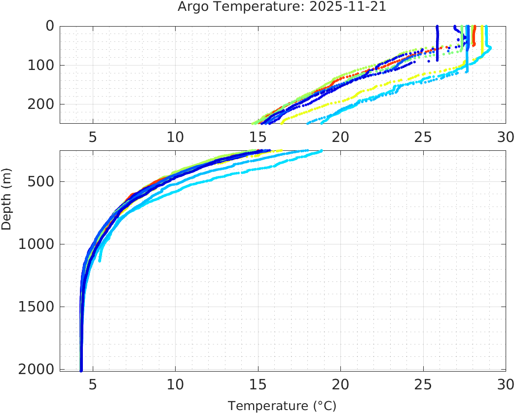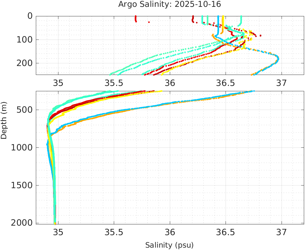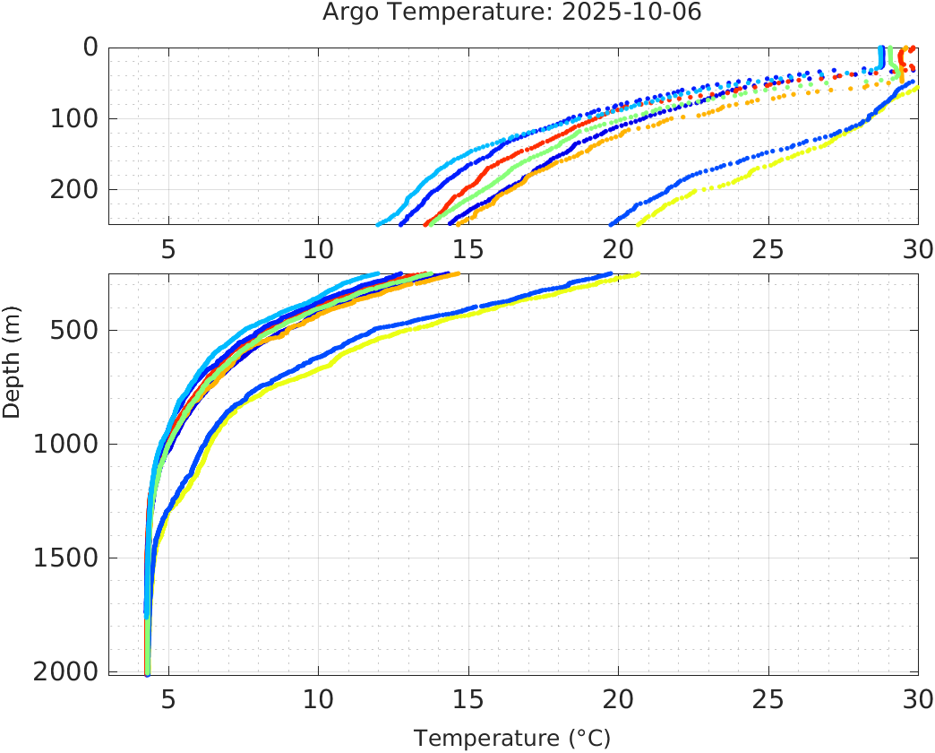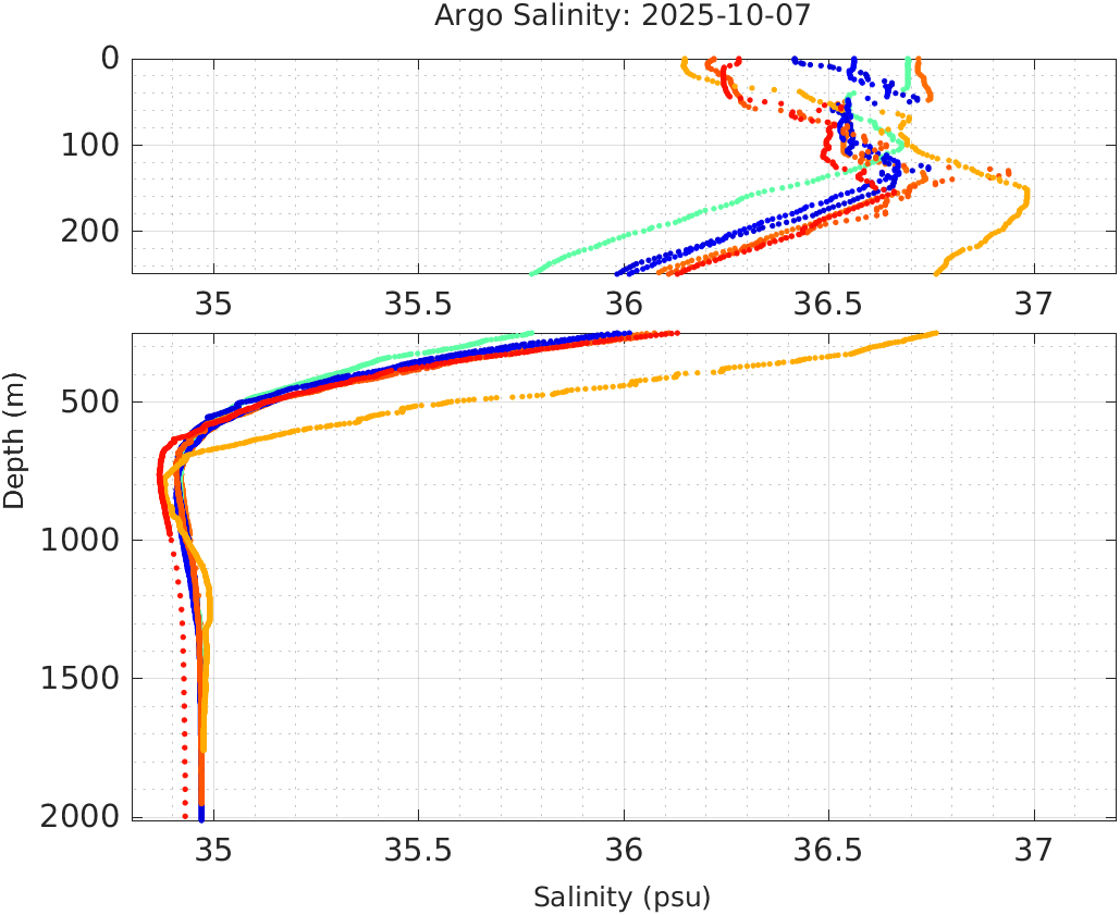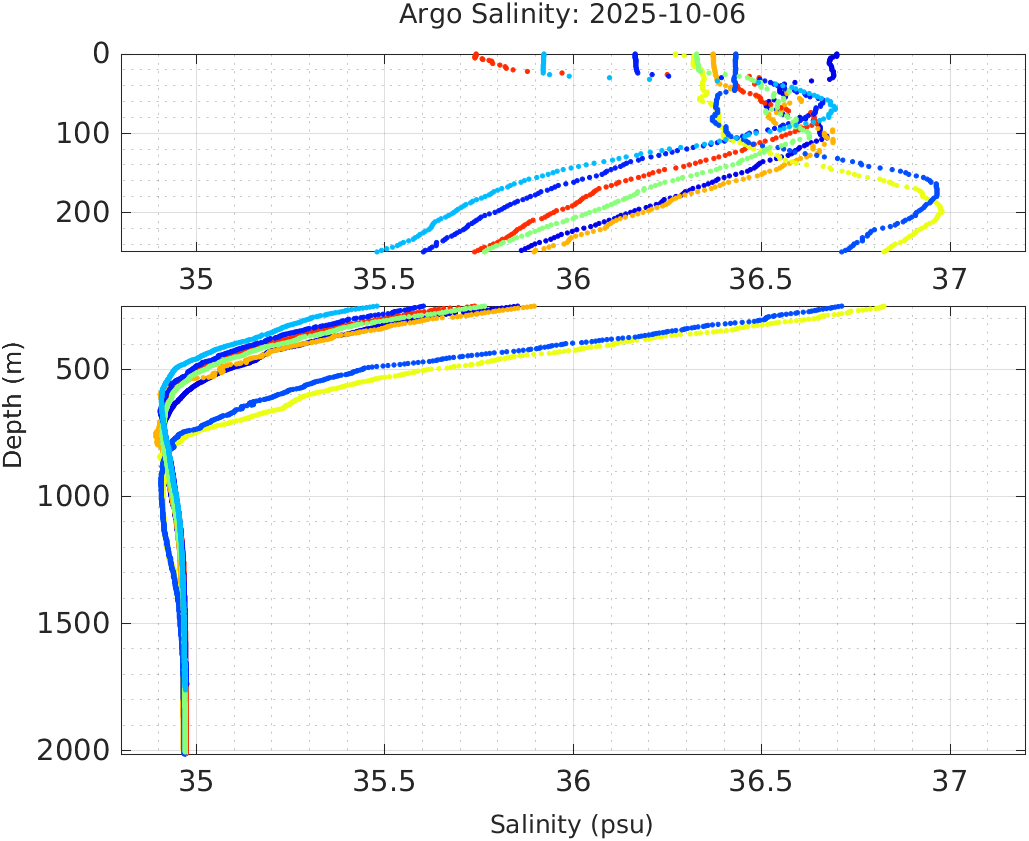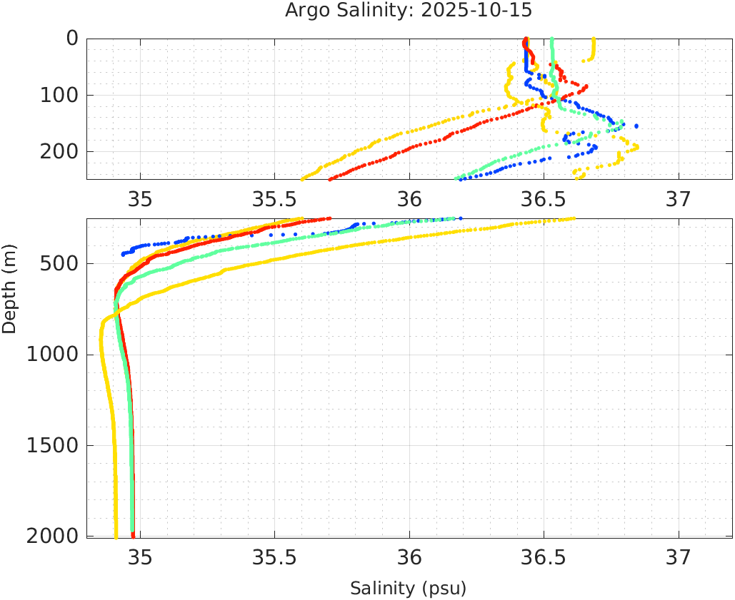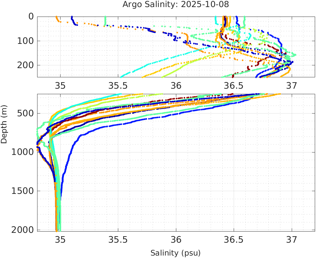 This page shows profile data collected by floats that are part of the global Argo program. The color of each profile corresponds to the time of day of the data (shown in the location map in column 1).