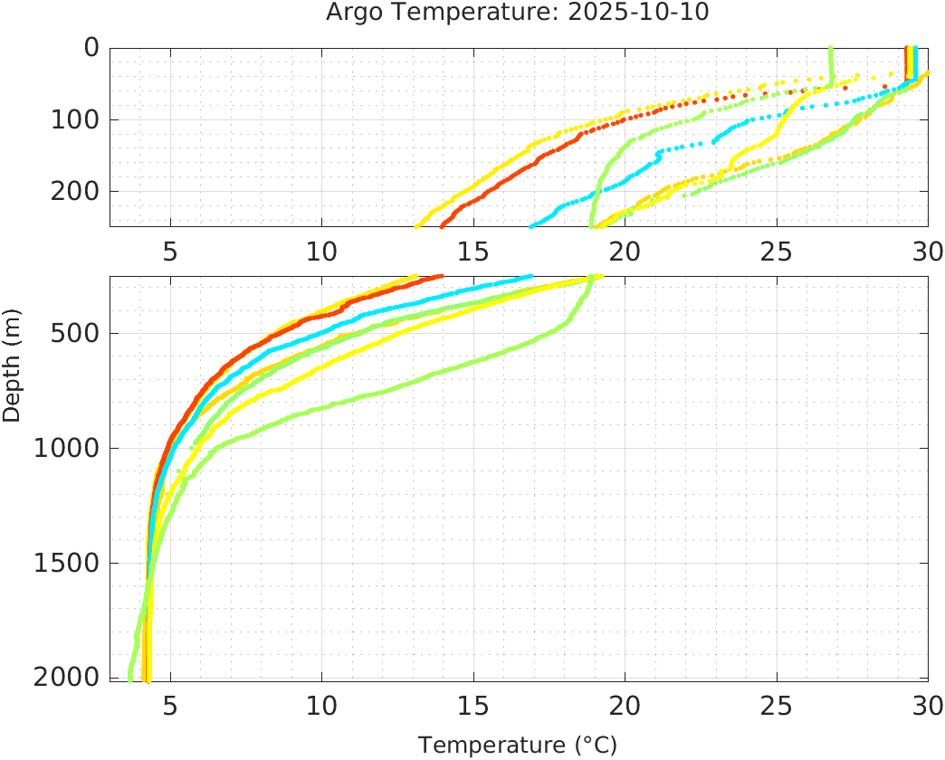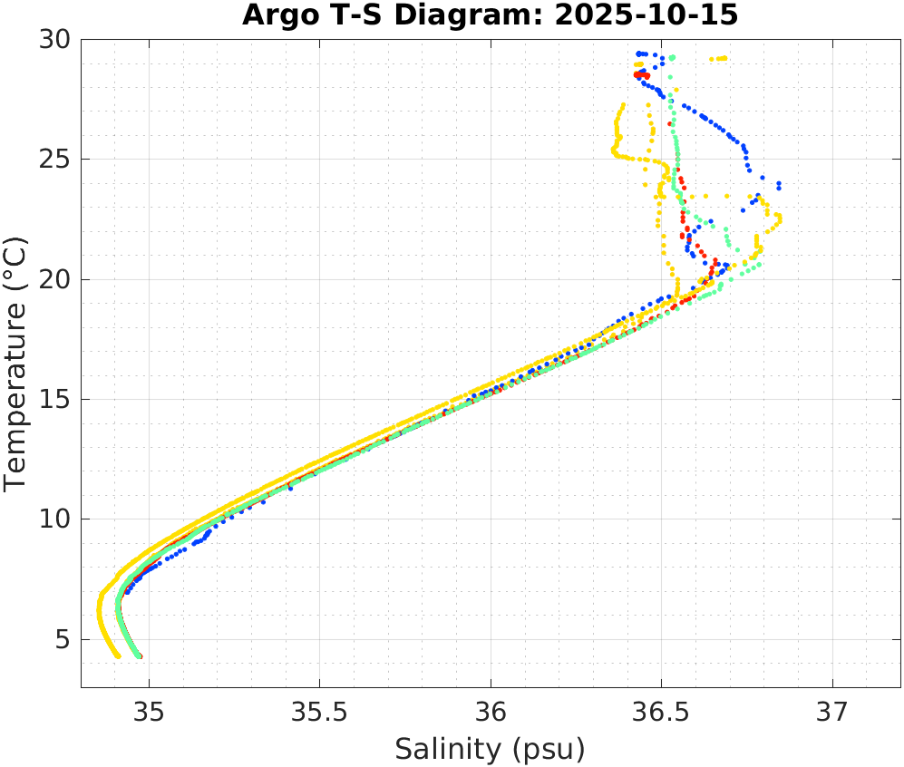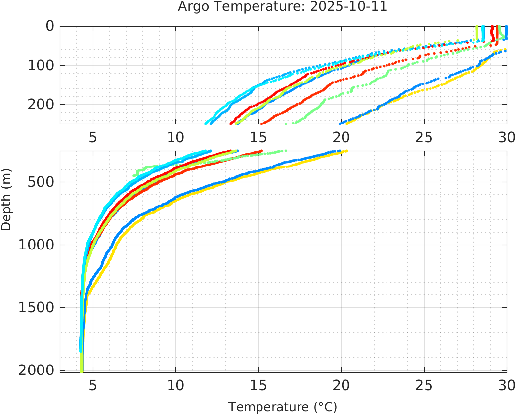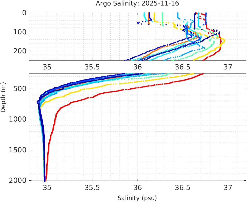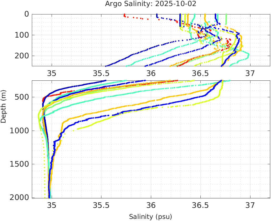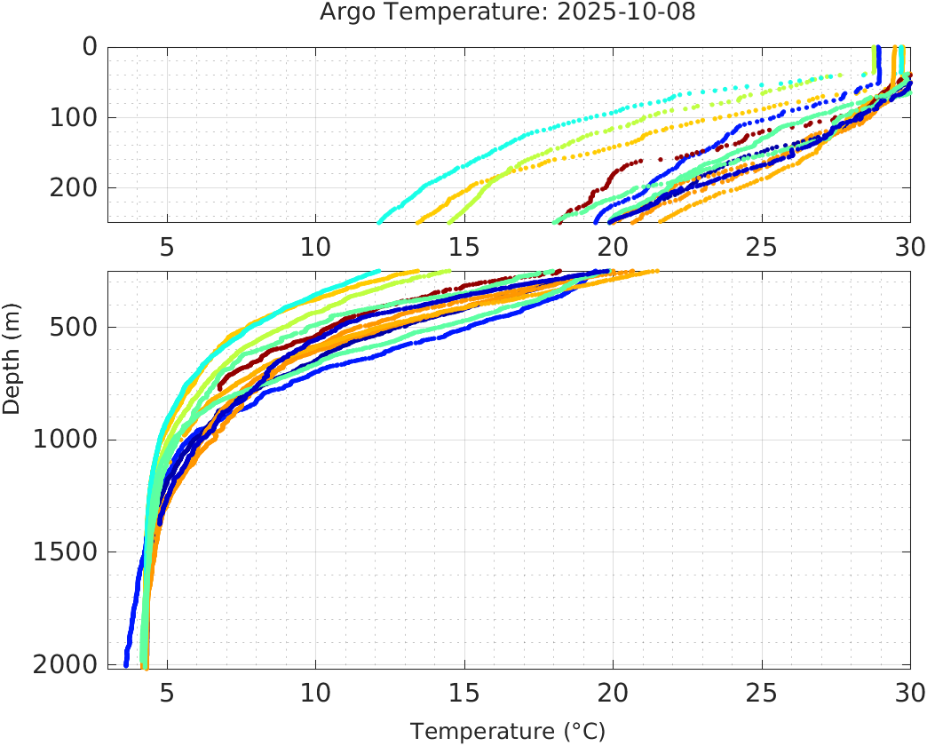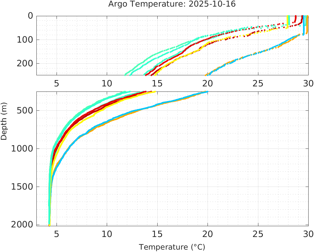 This page shows profile data collected by floats that are part of the global Argo program. The color of each profile corresponds to the time of day of the data (shown in the location map in column 1).