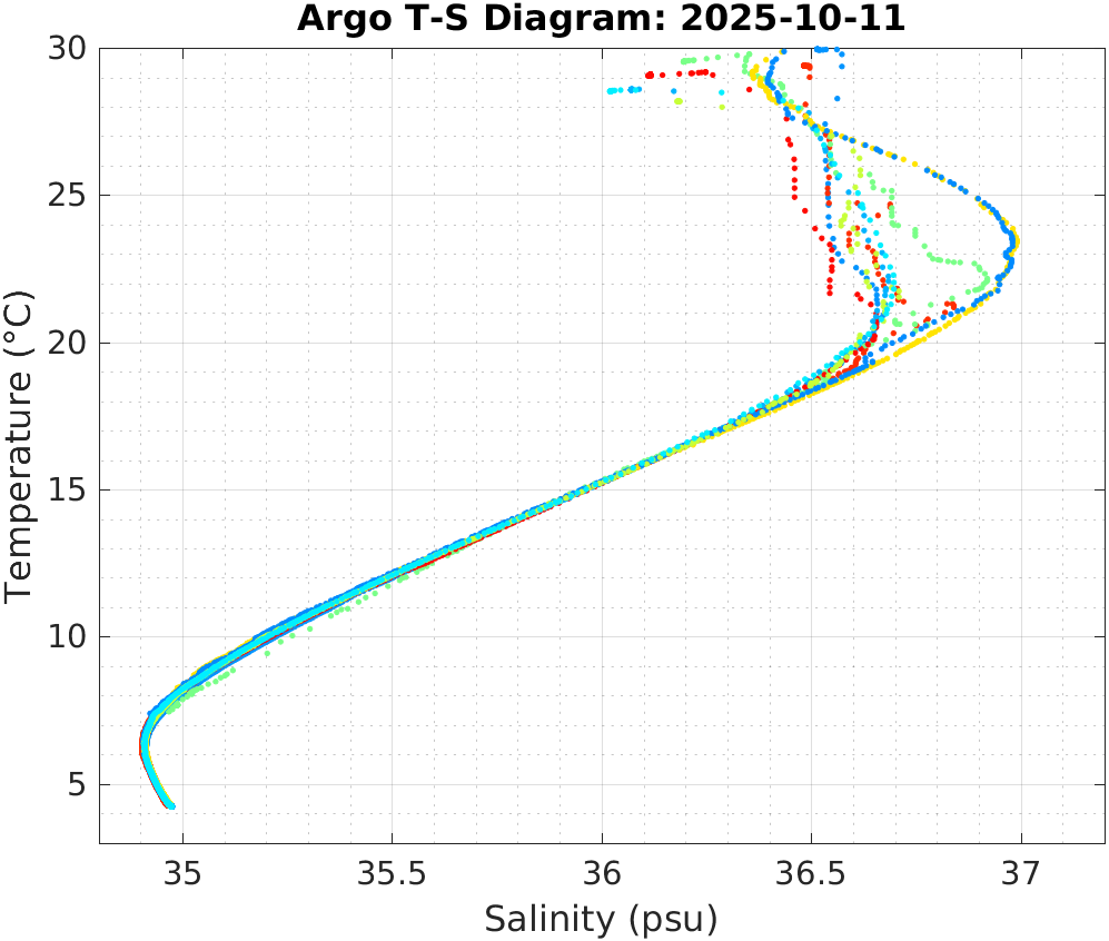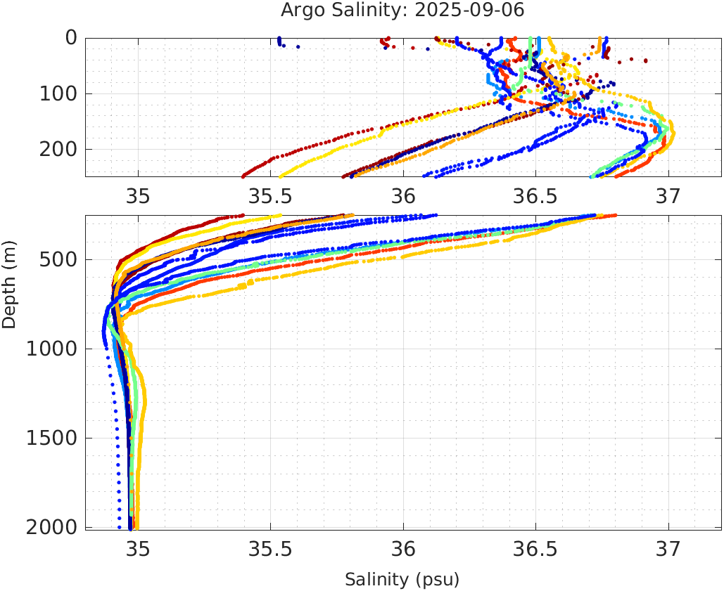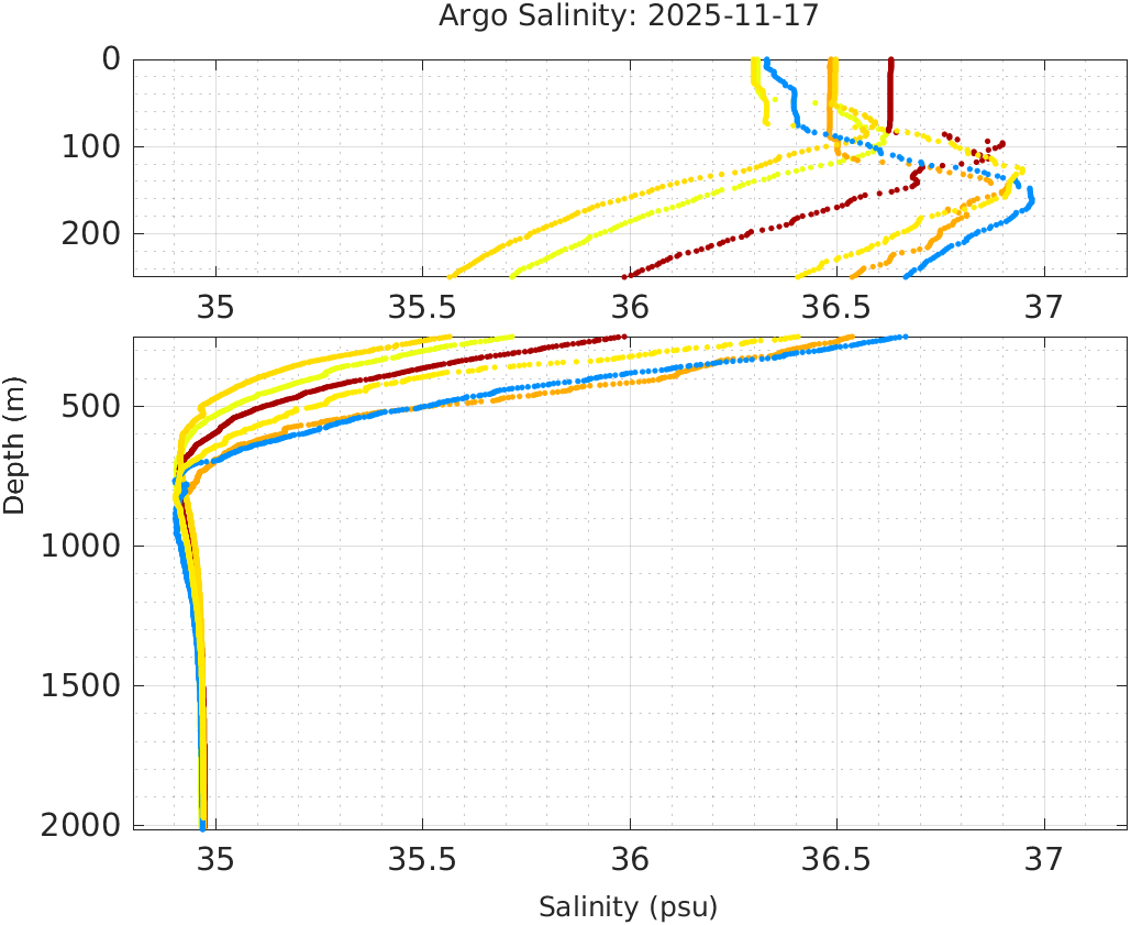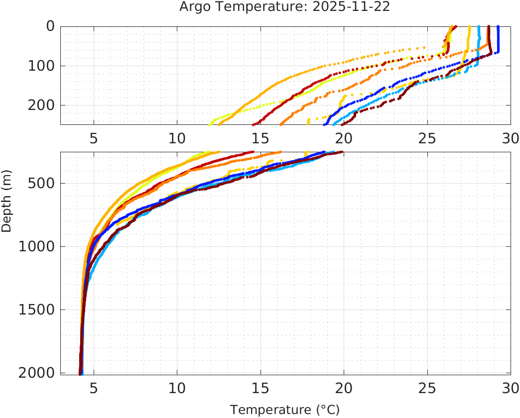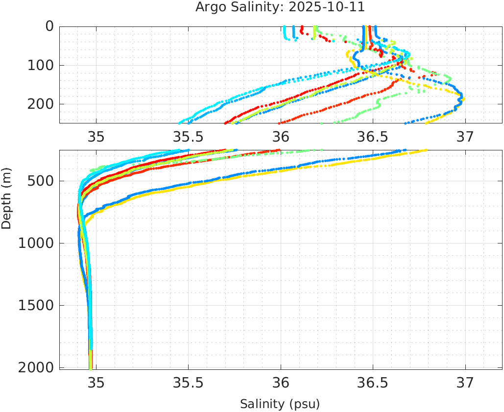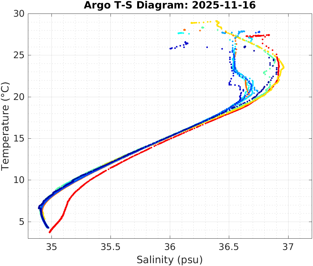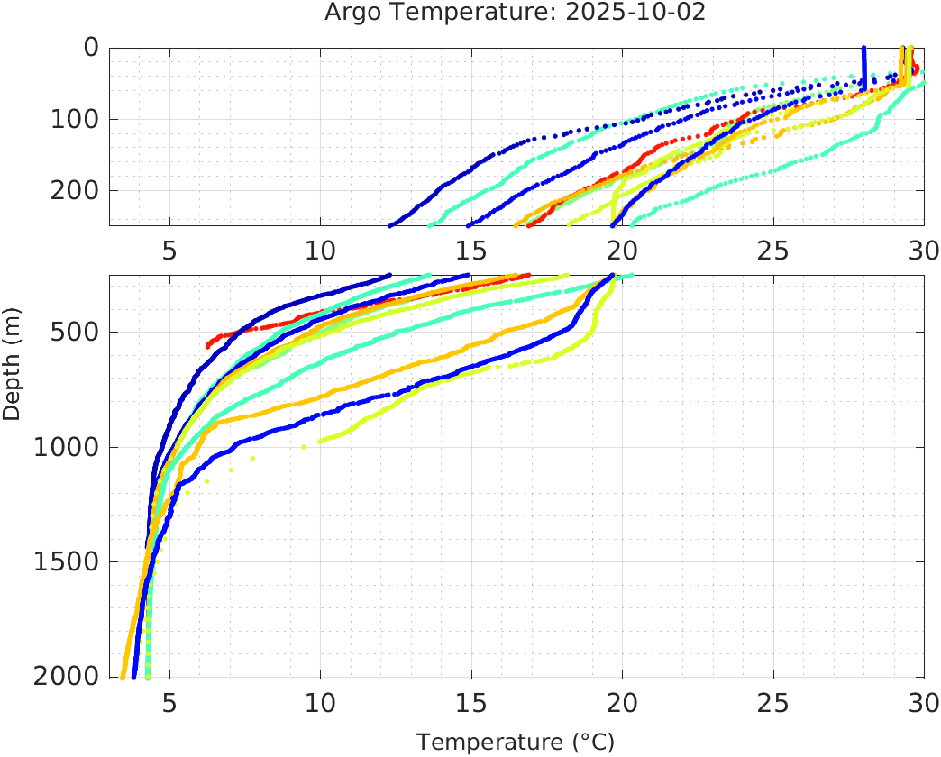 This page shows profile data collected by floats that are part of the global Argo program. The color of each profile corresponds to the time of day of the data (shown in the location map in column 1).