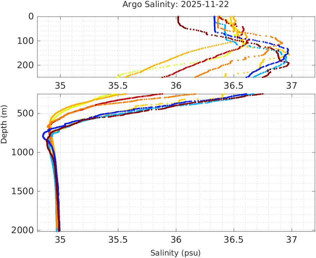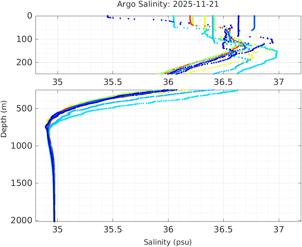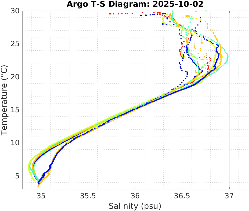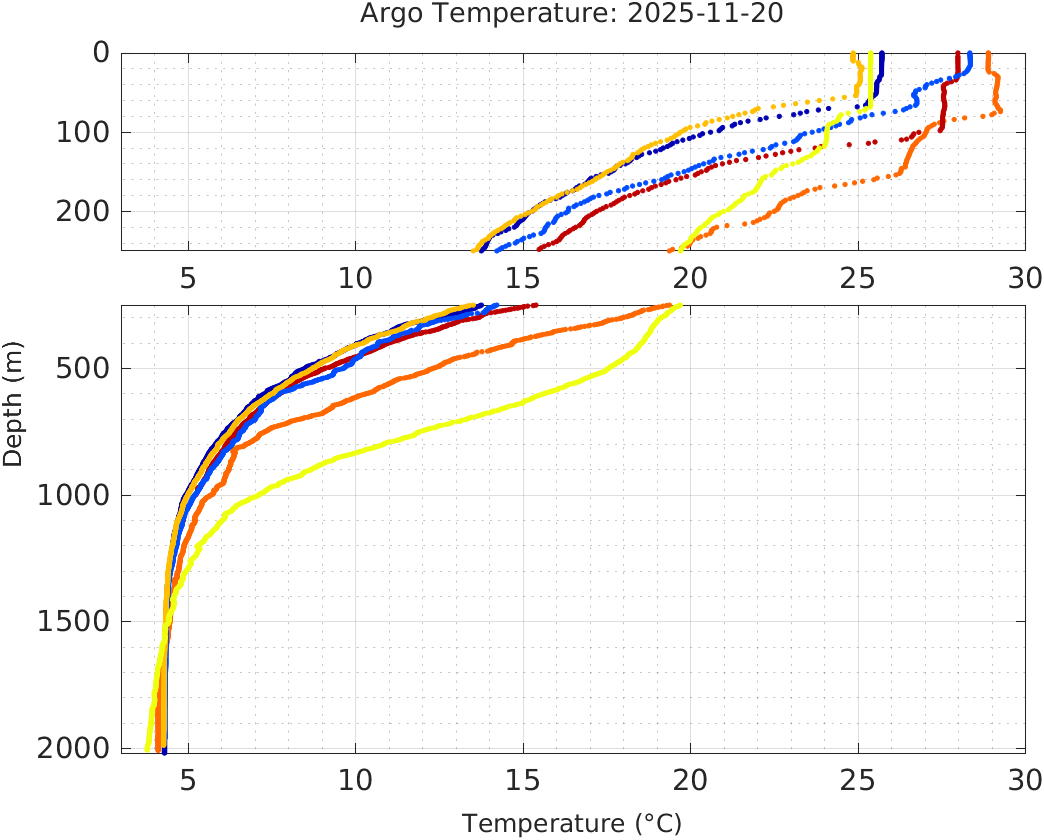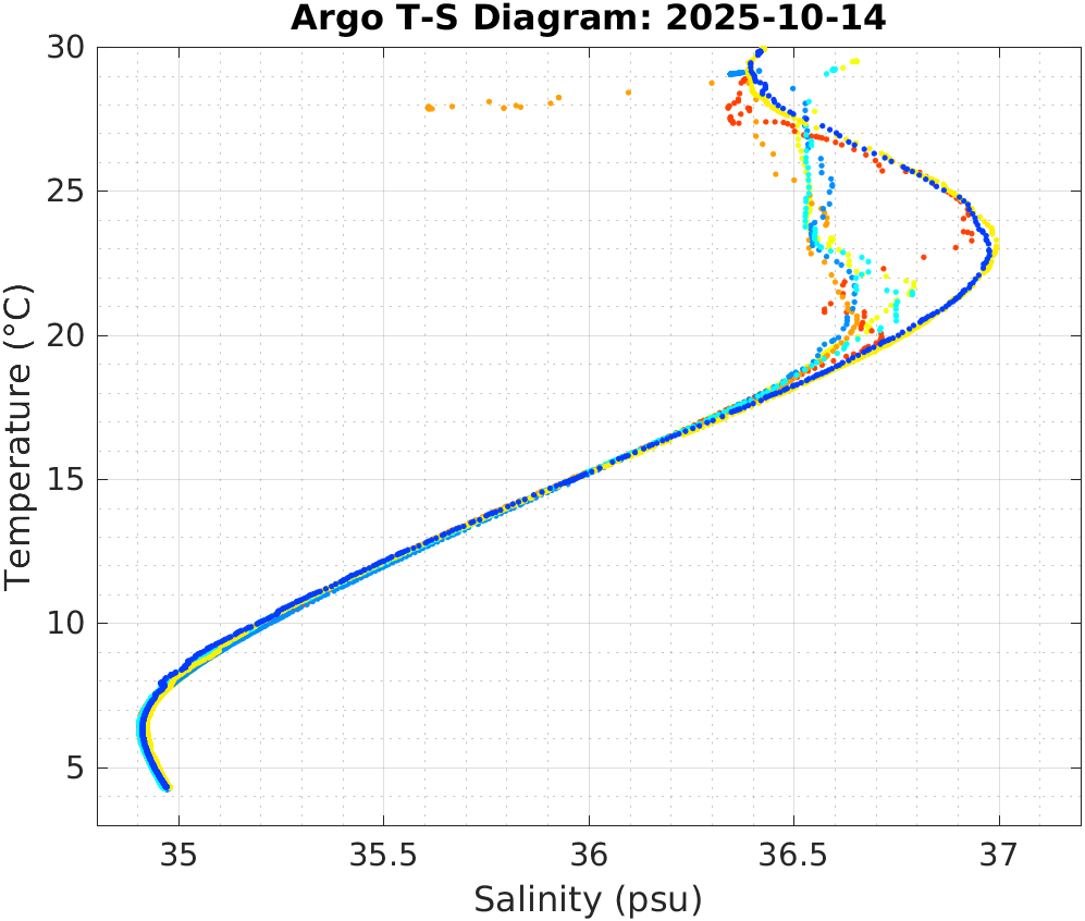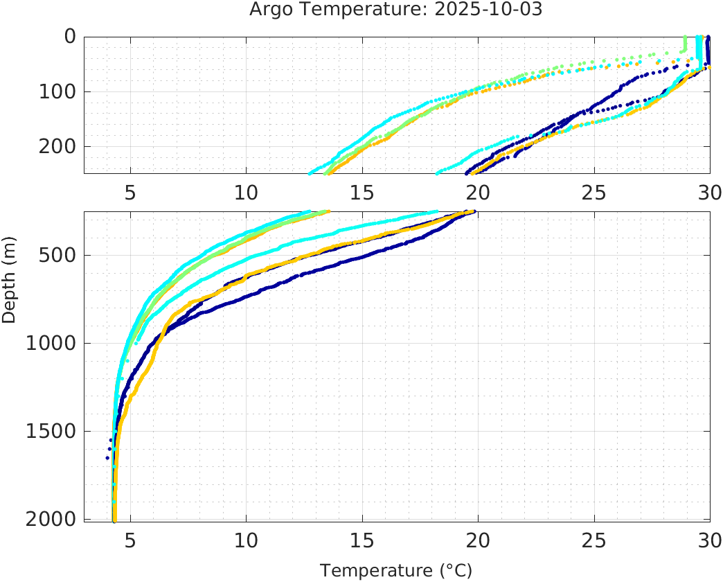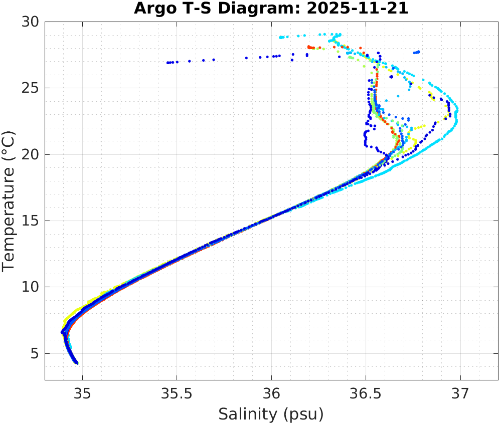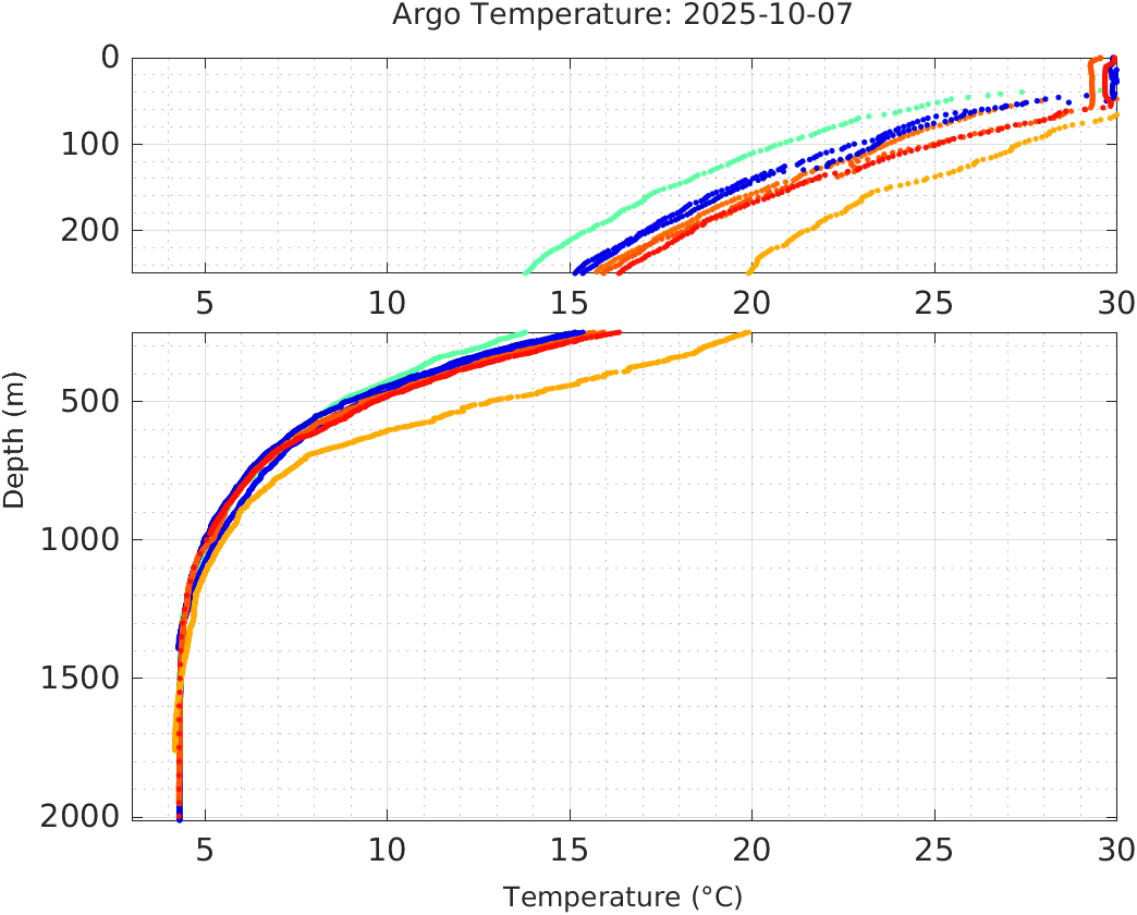 This page shows profile data collected by floats that are part of the global Argo program. The color of each profile corresponds to the time of day of the data (shown in the location map in column 1).