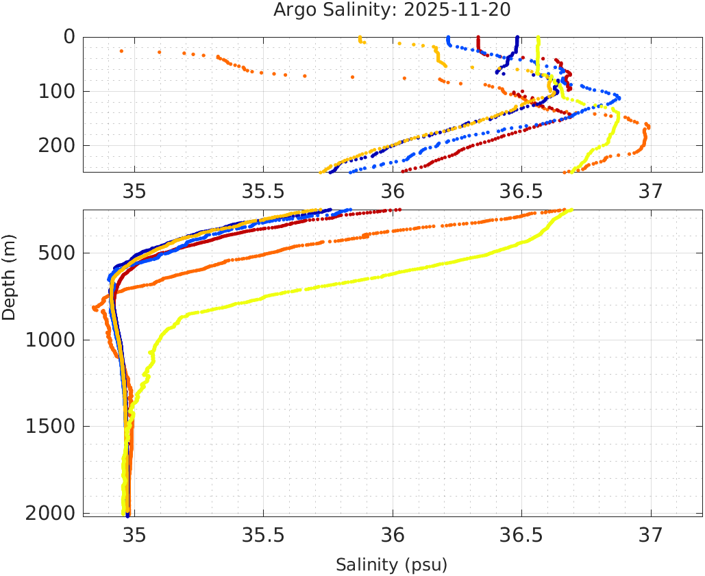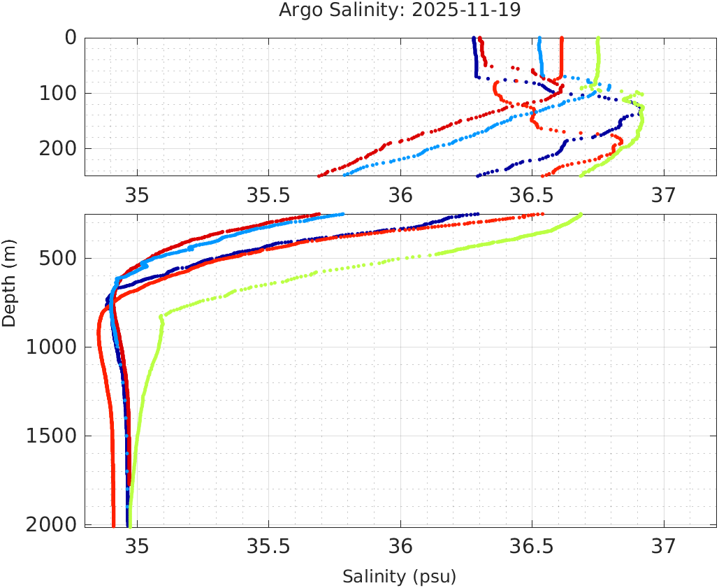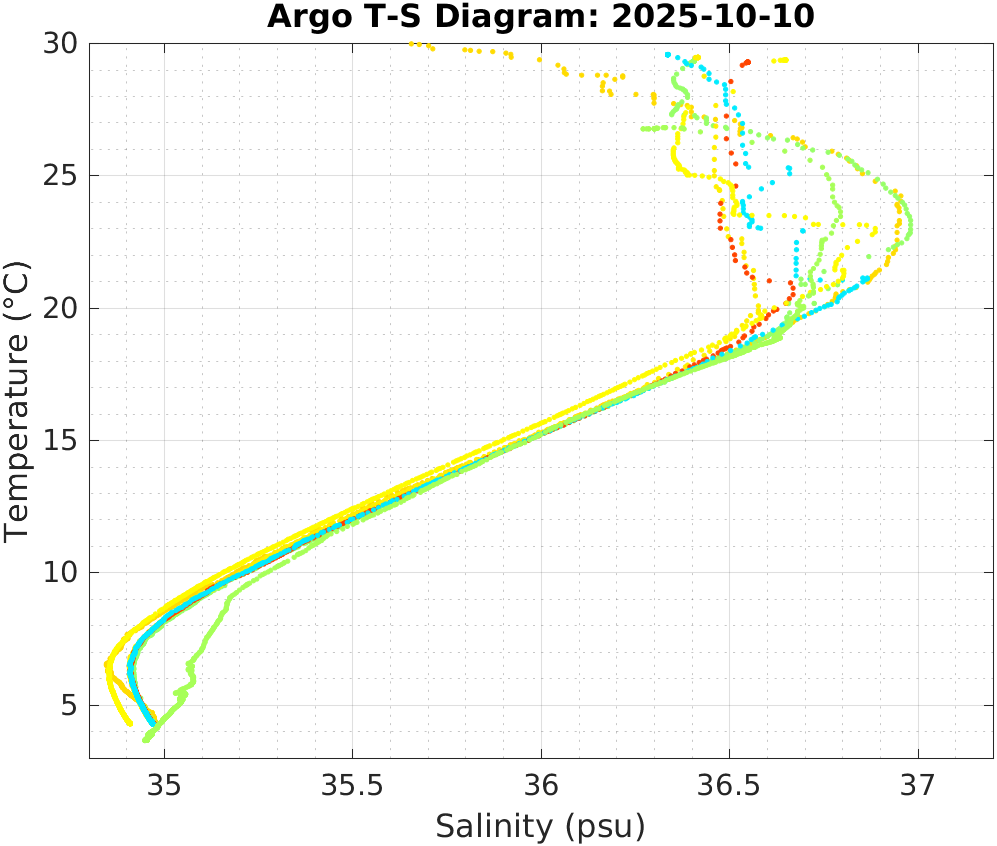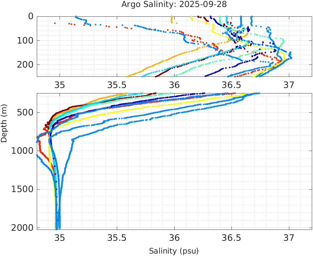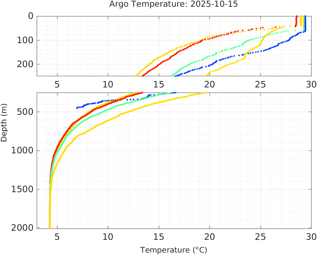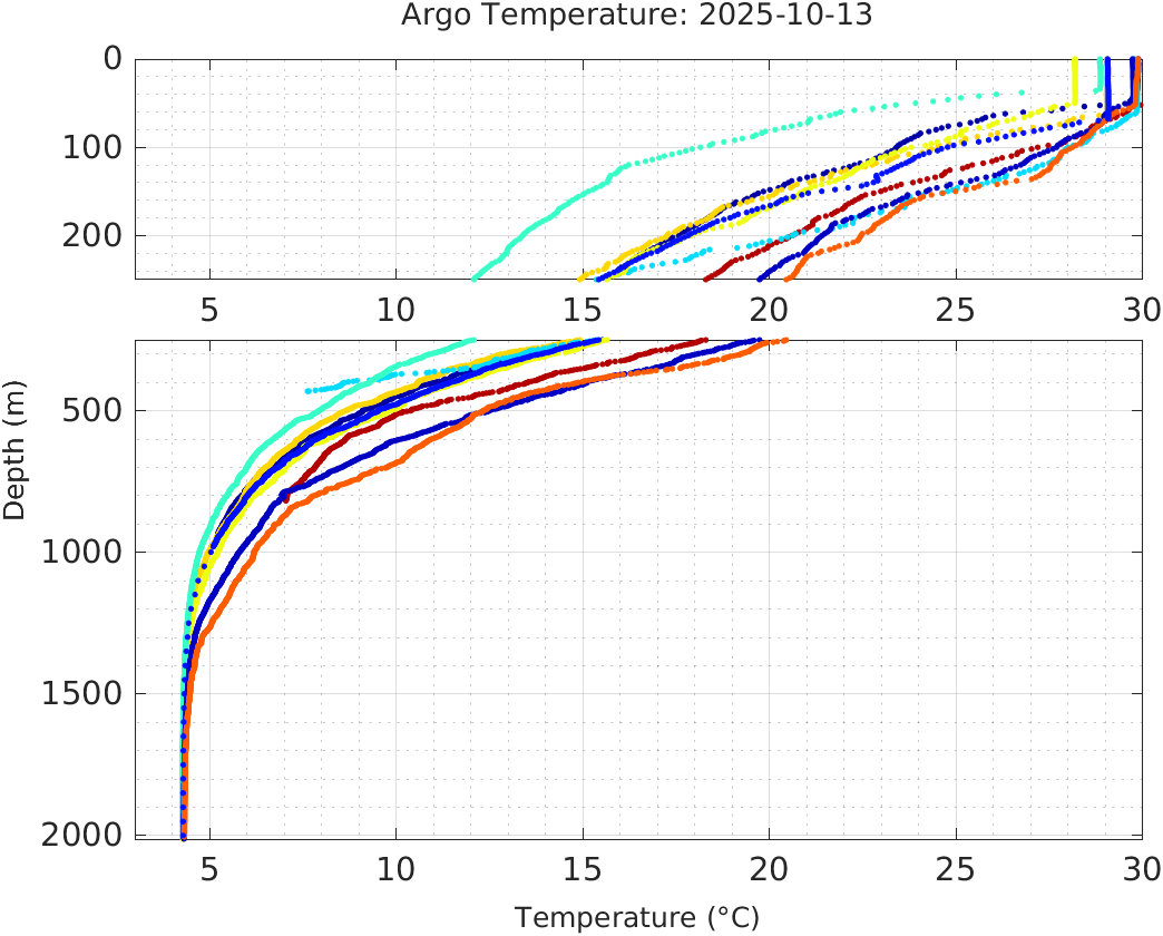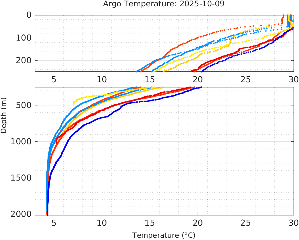This page shows profile data collected by floats that are part of the global Argo program. The color of each profile corresponds to the time of day of the data (shown in the location map in column 1).