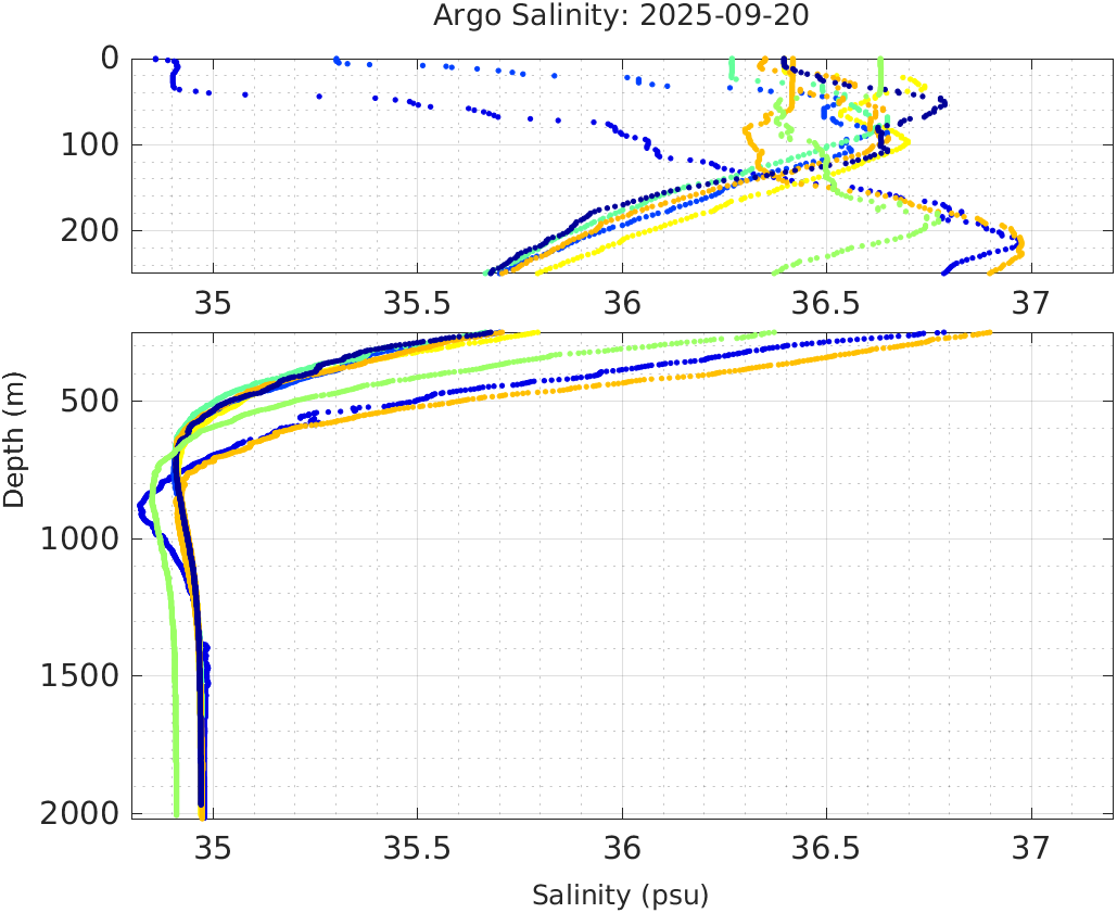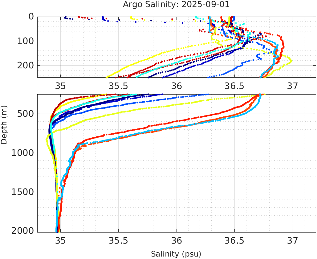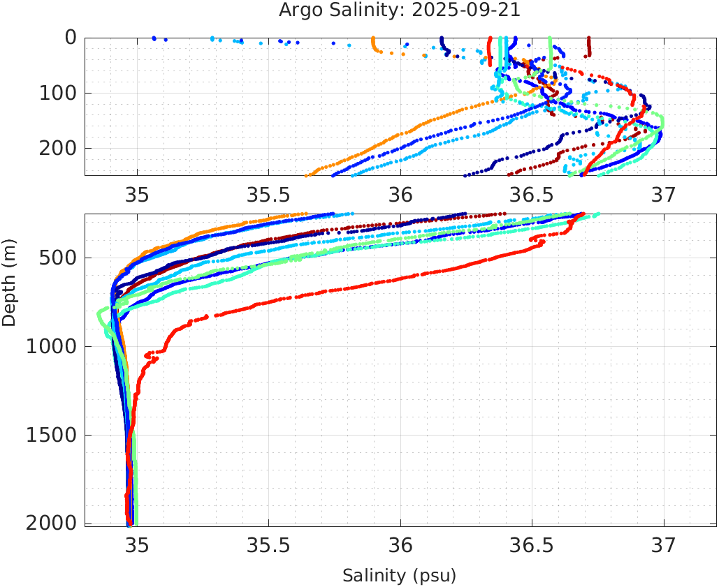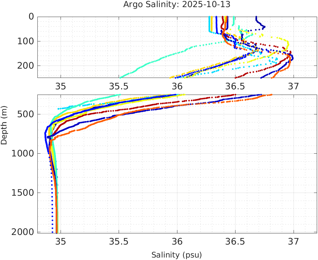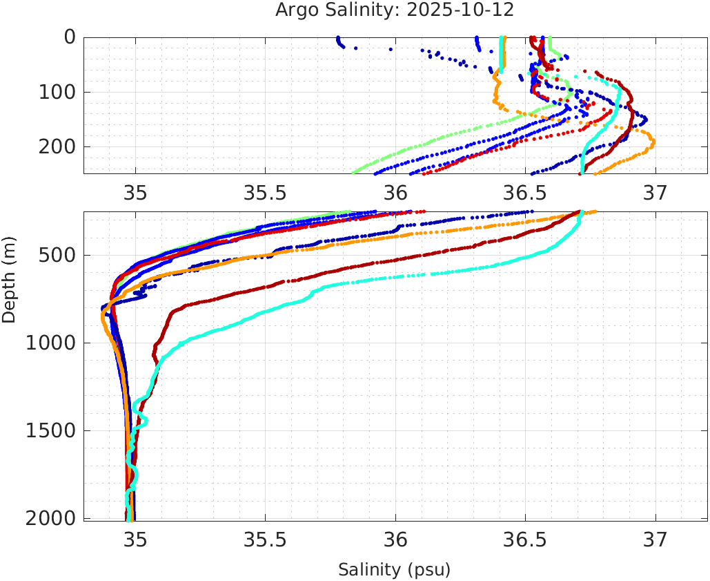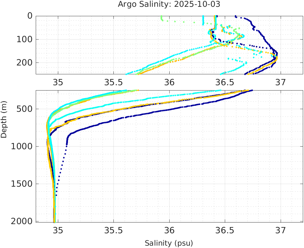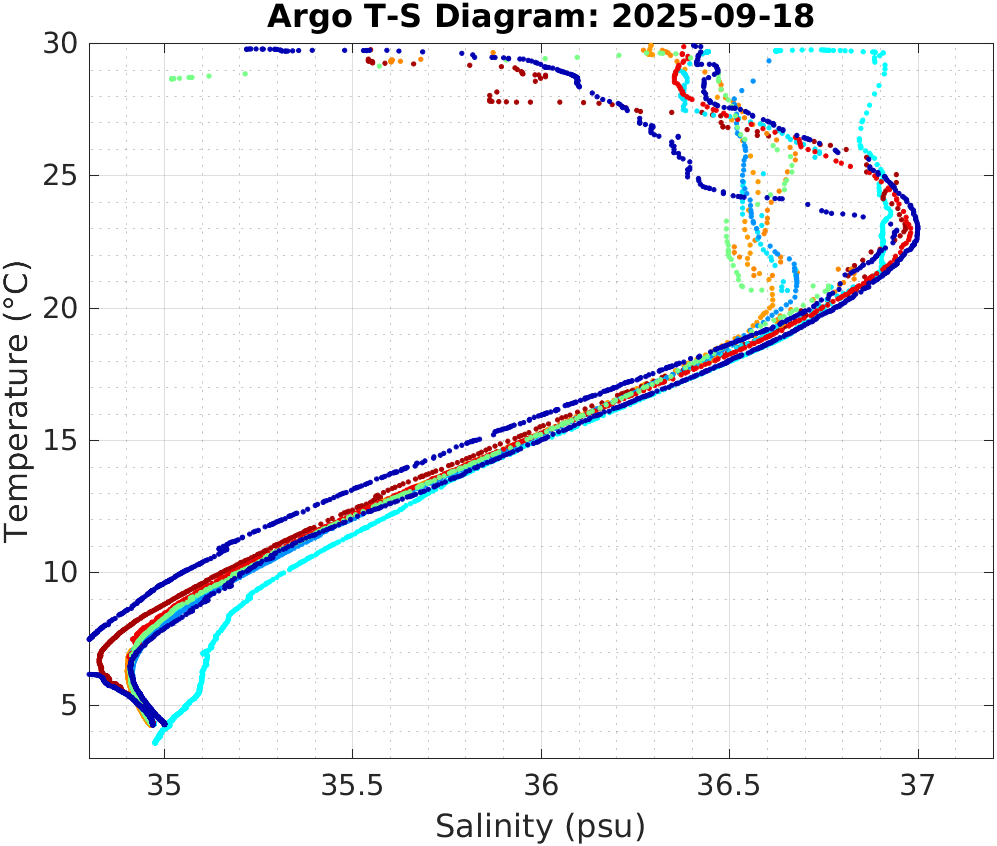 This page shows profile data collected by floats that are part of the global Argo program. The color of each profile corresponds to the time of day of the data (shown in the location map in column 1).