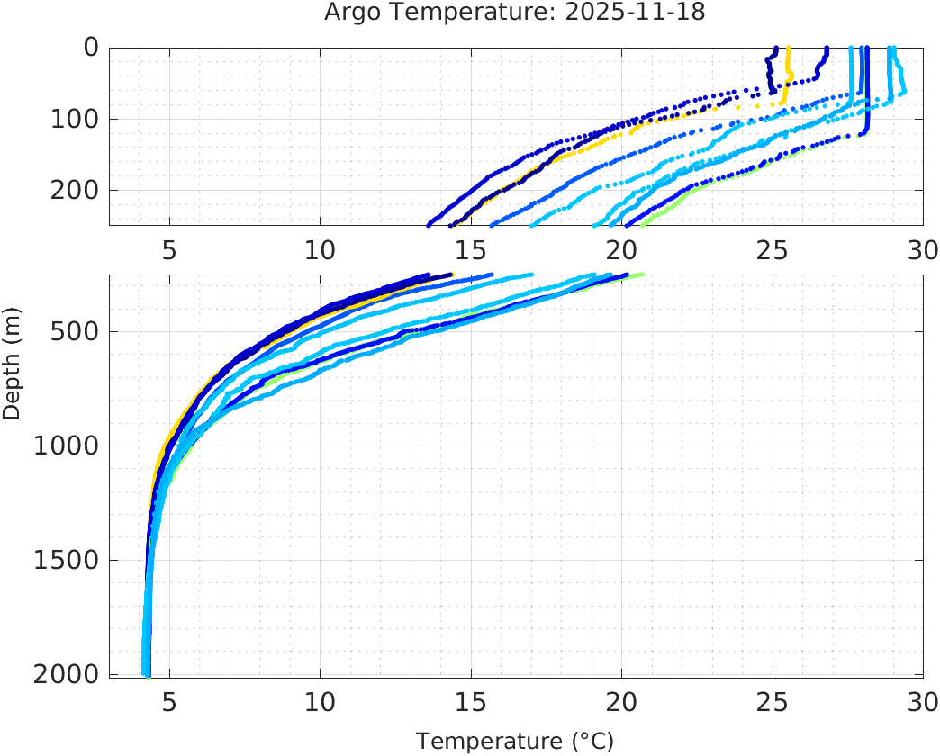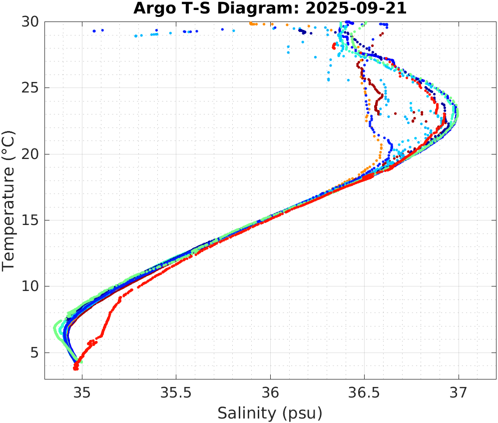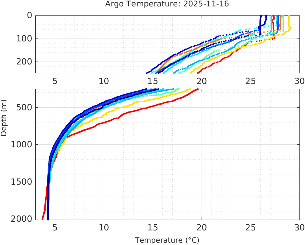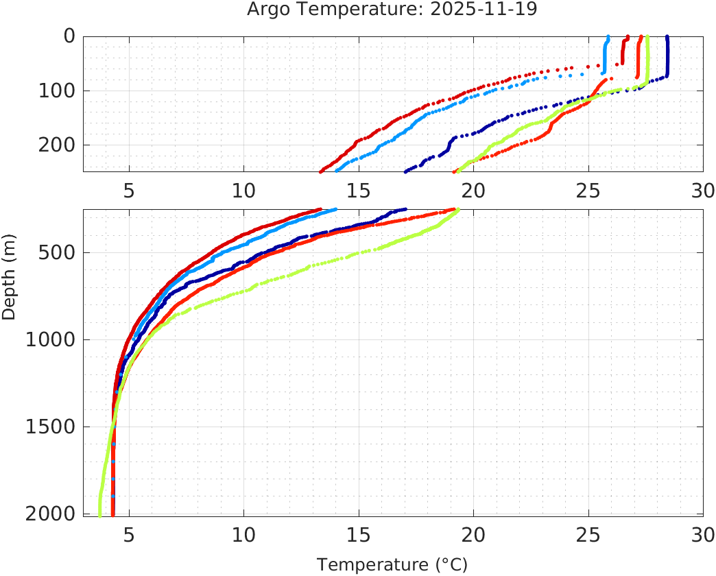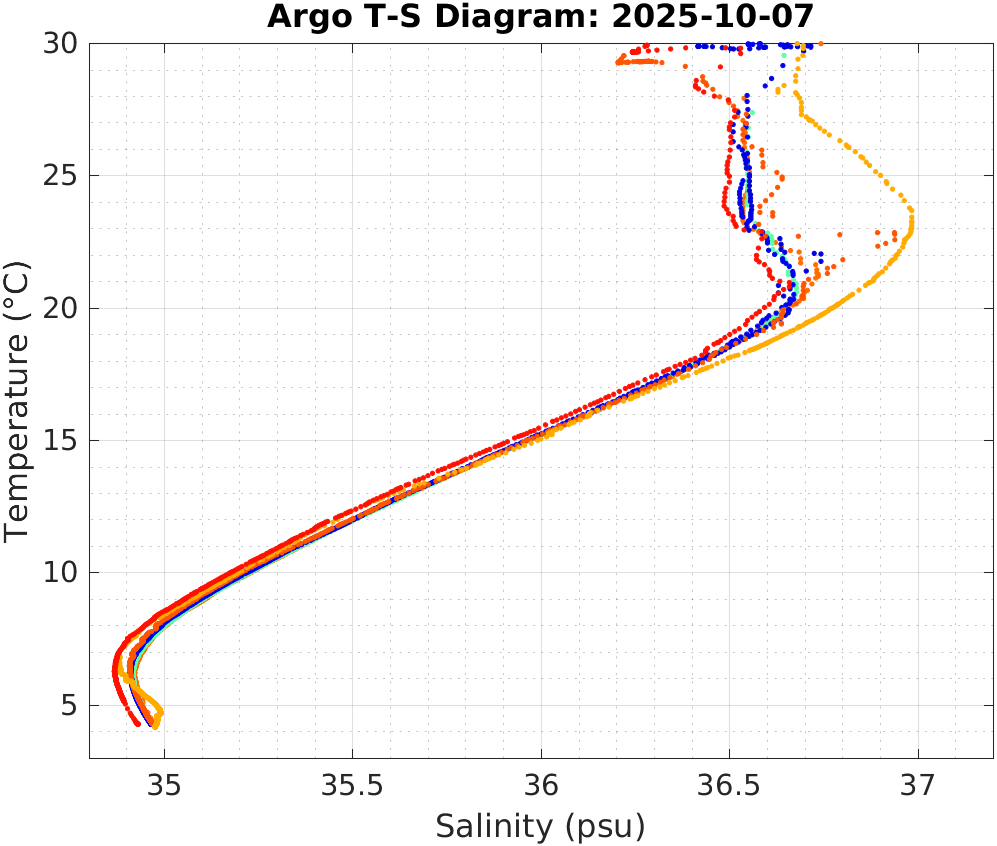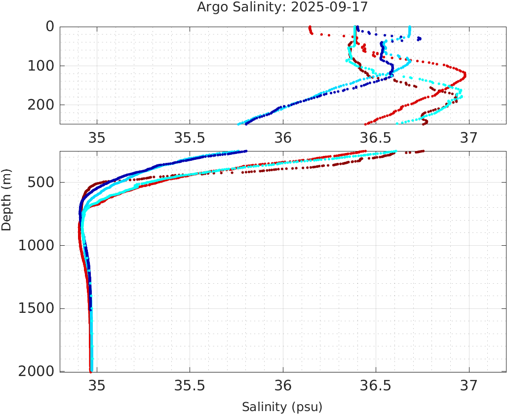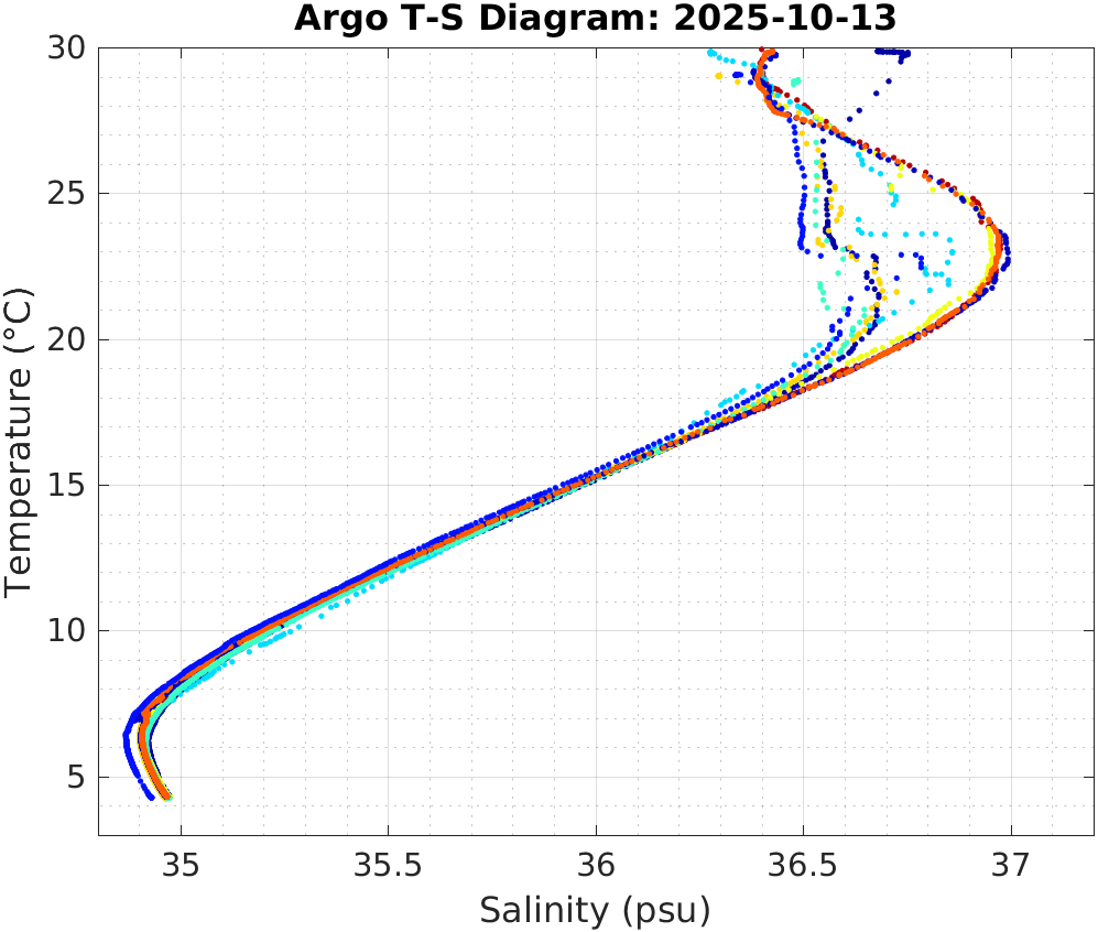 This page shows profile data collected by floats that are part of the global Argo program. The color of each profile corresponds to the time of day of the data (shown in the location map in column 1).