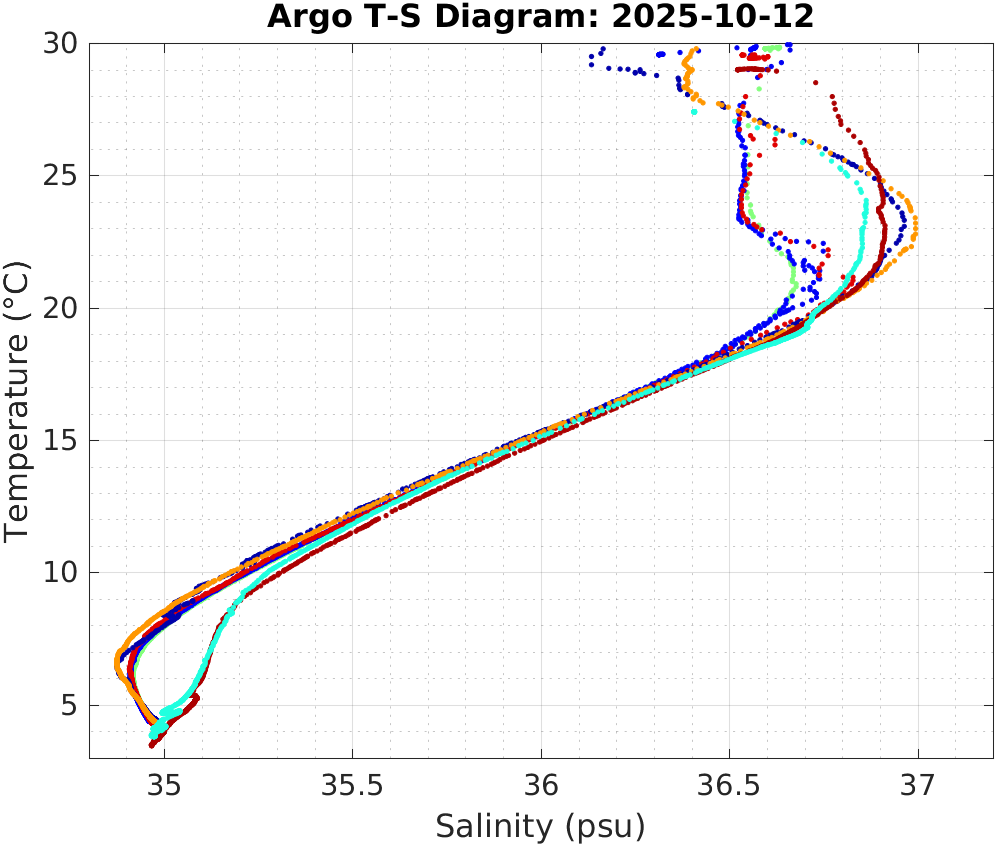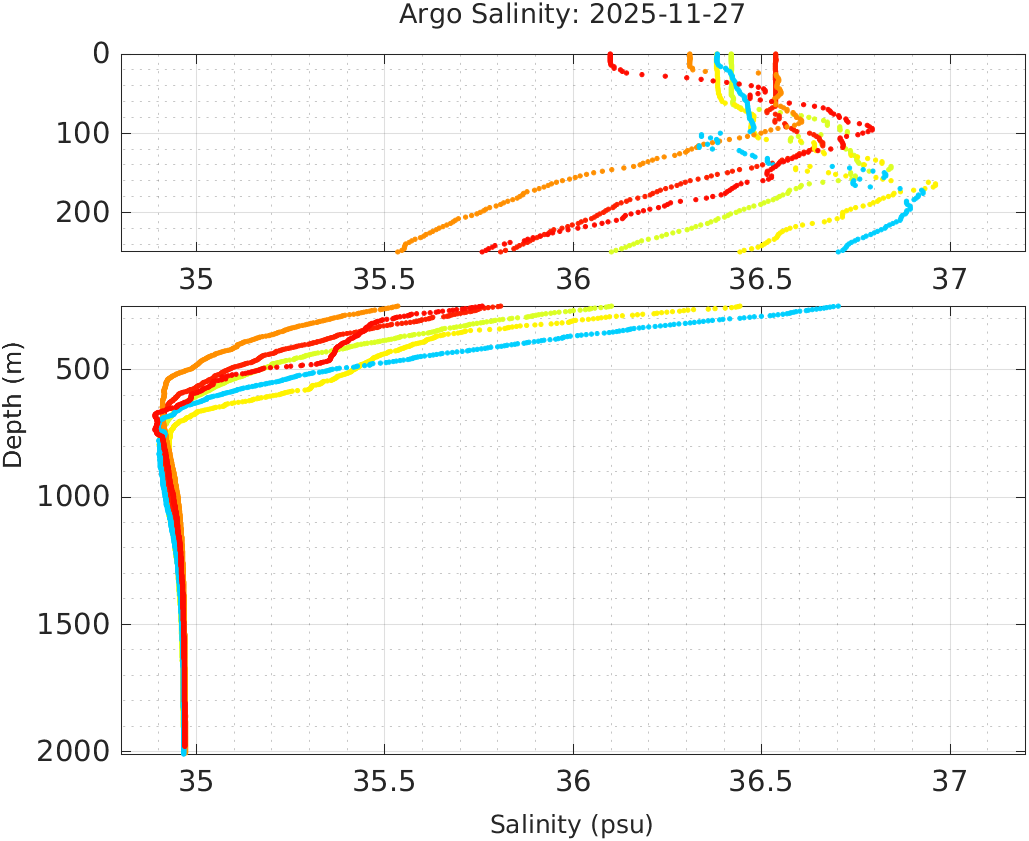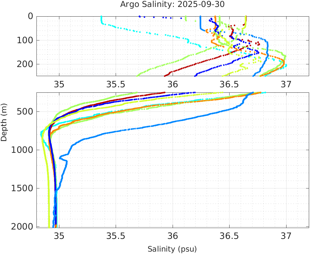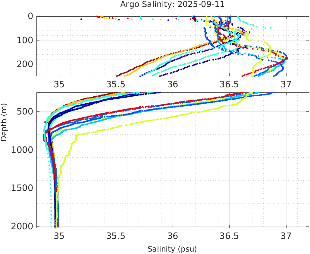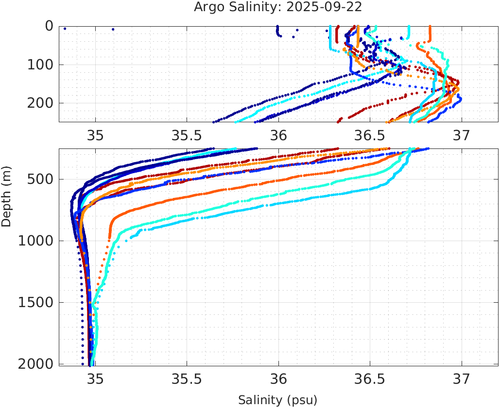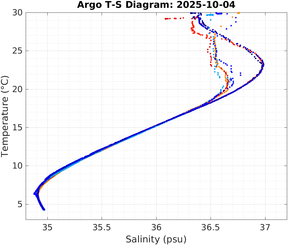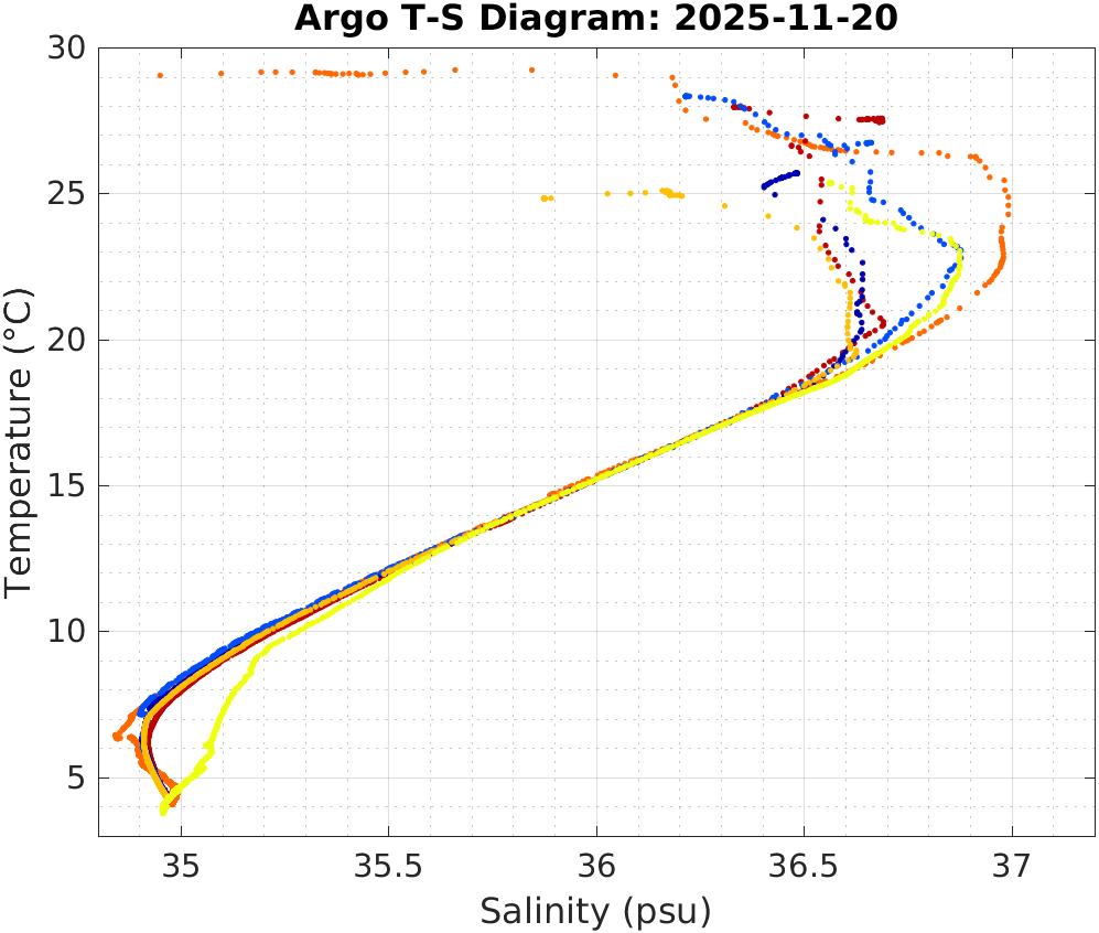 This page shows profile data collected by floats that are part of the global Argo program. The color of each profile corresponds to the time of day of the data (shown in the location map in column 1).