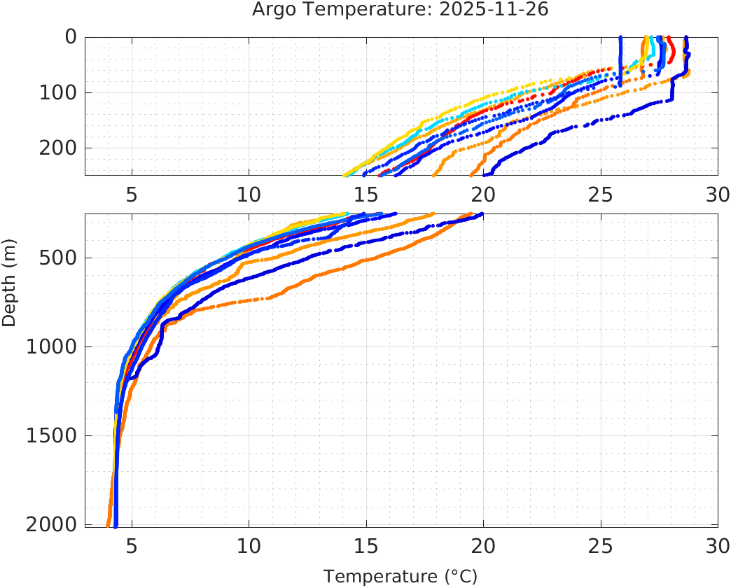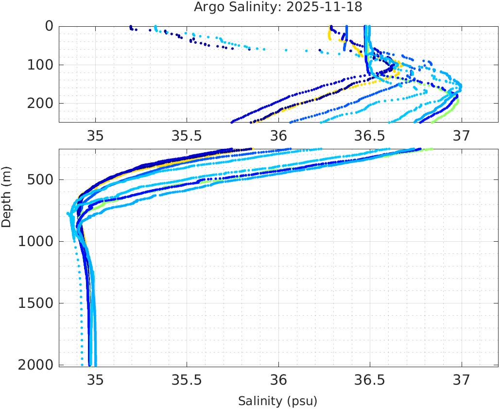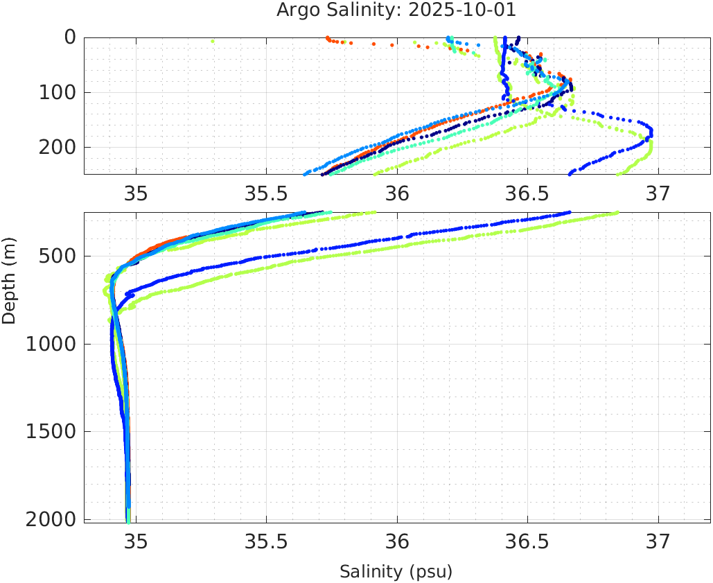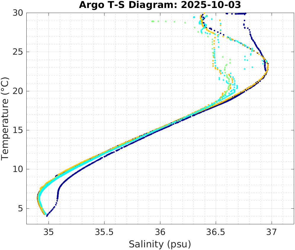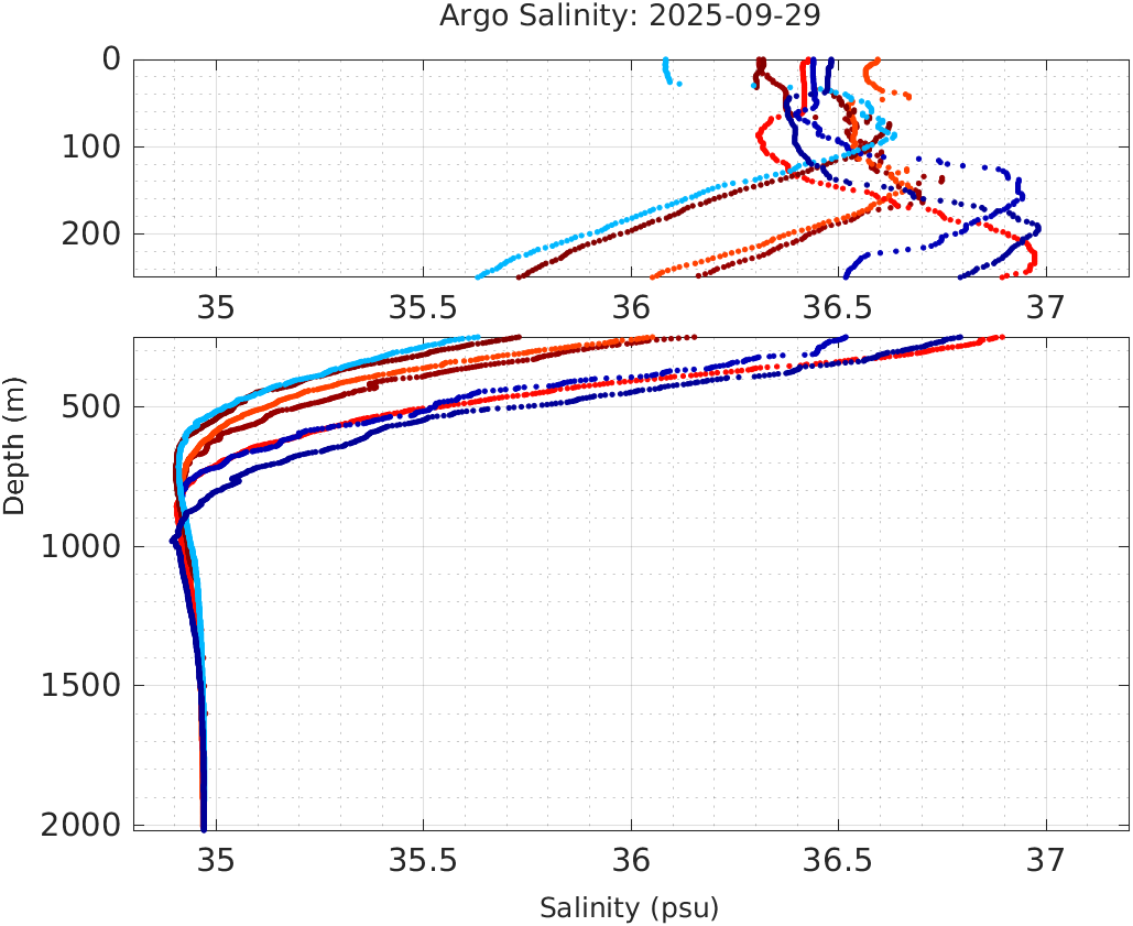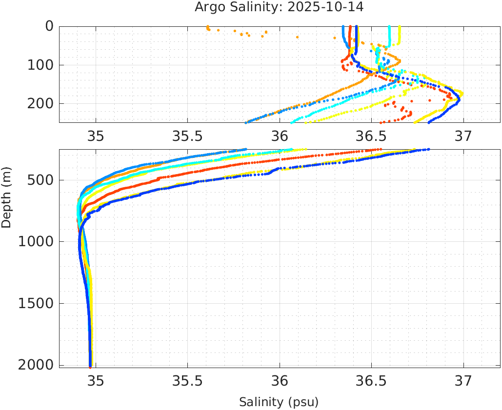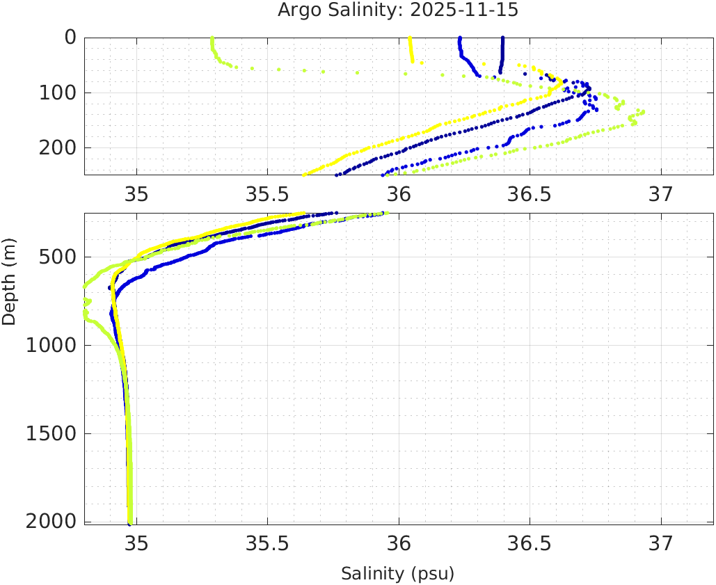 This page shows profile data collected by floats that are part of the global Argo program. The color of each profile corresponds to the time of day of the data (shown in the location map in column 1).