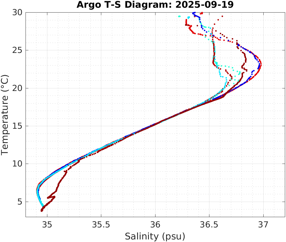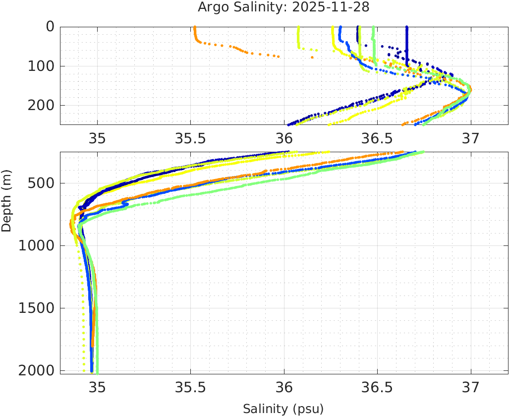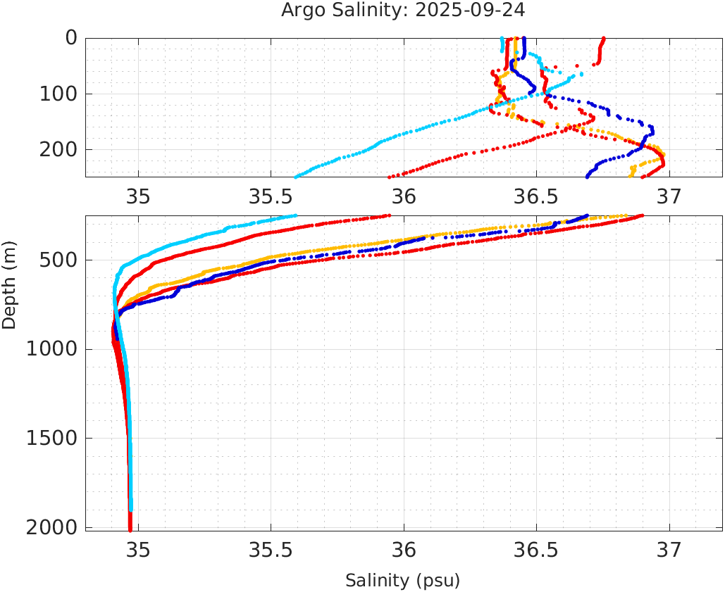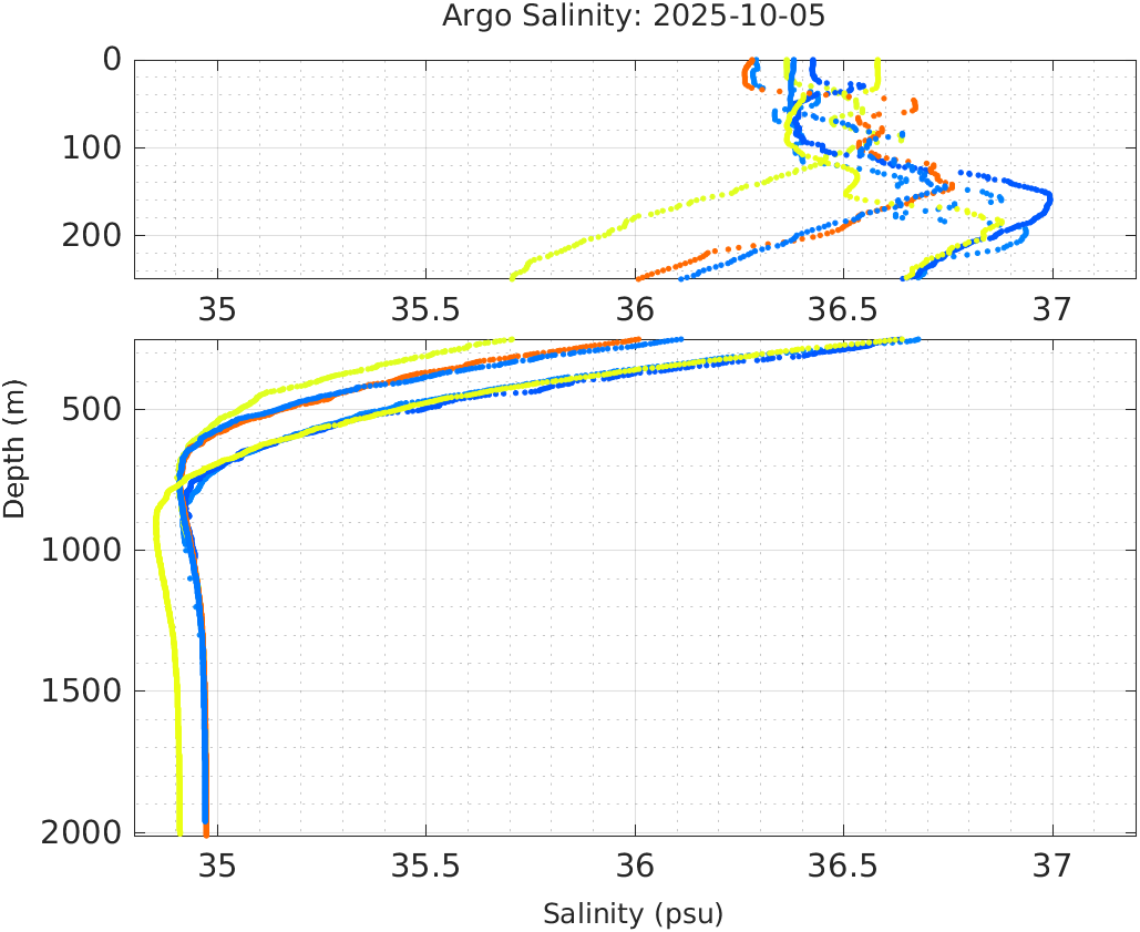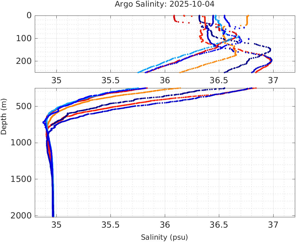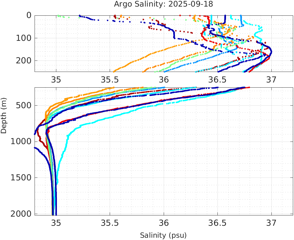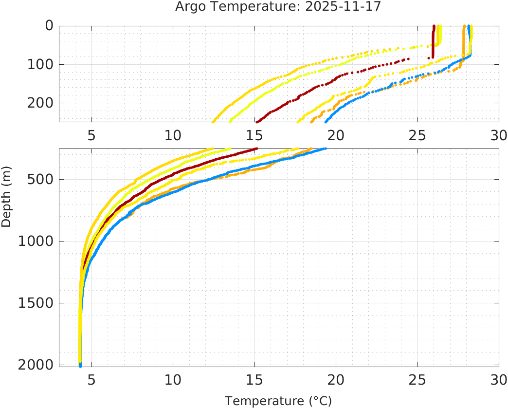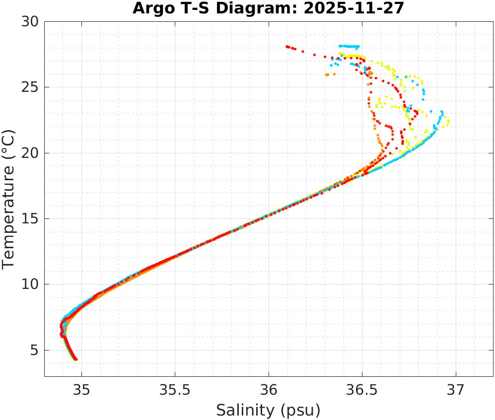 This page shows profile data collected by floats that are part of the global Argo program. The color of each profile corresponds to the time of day of the data (shown in the location map in column 1).