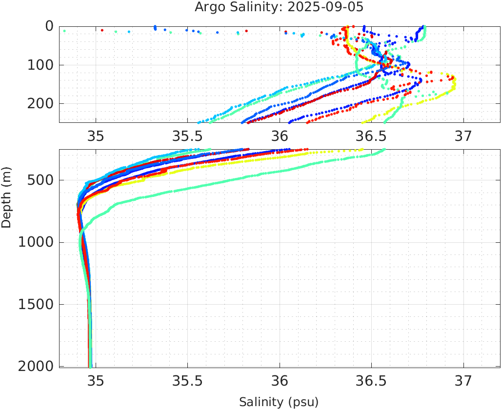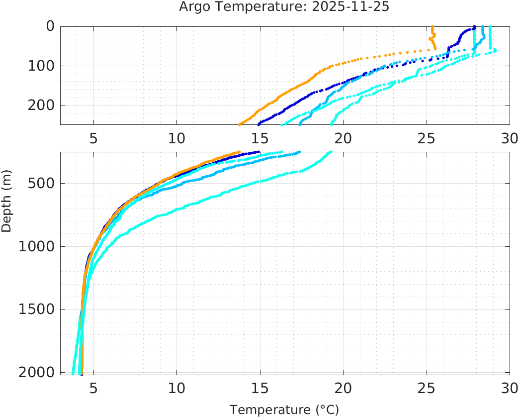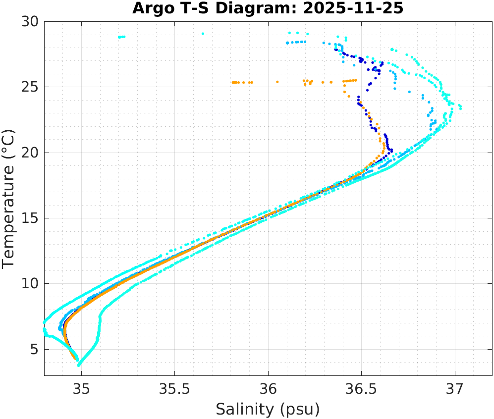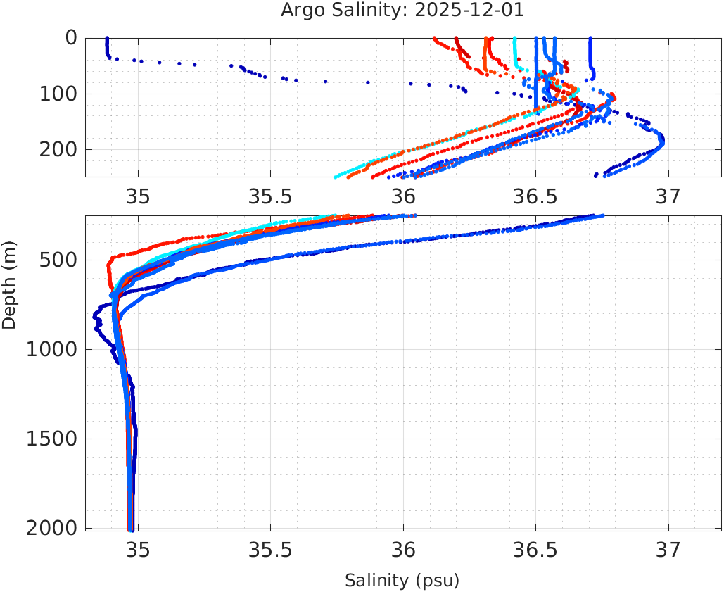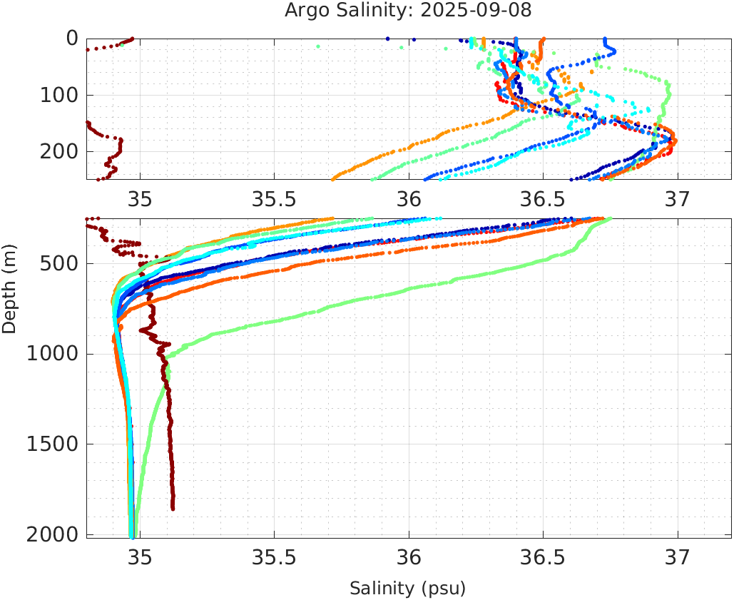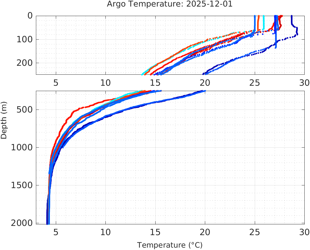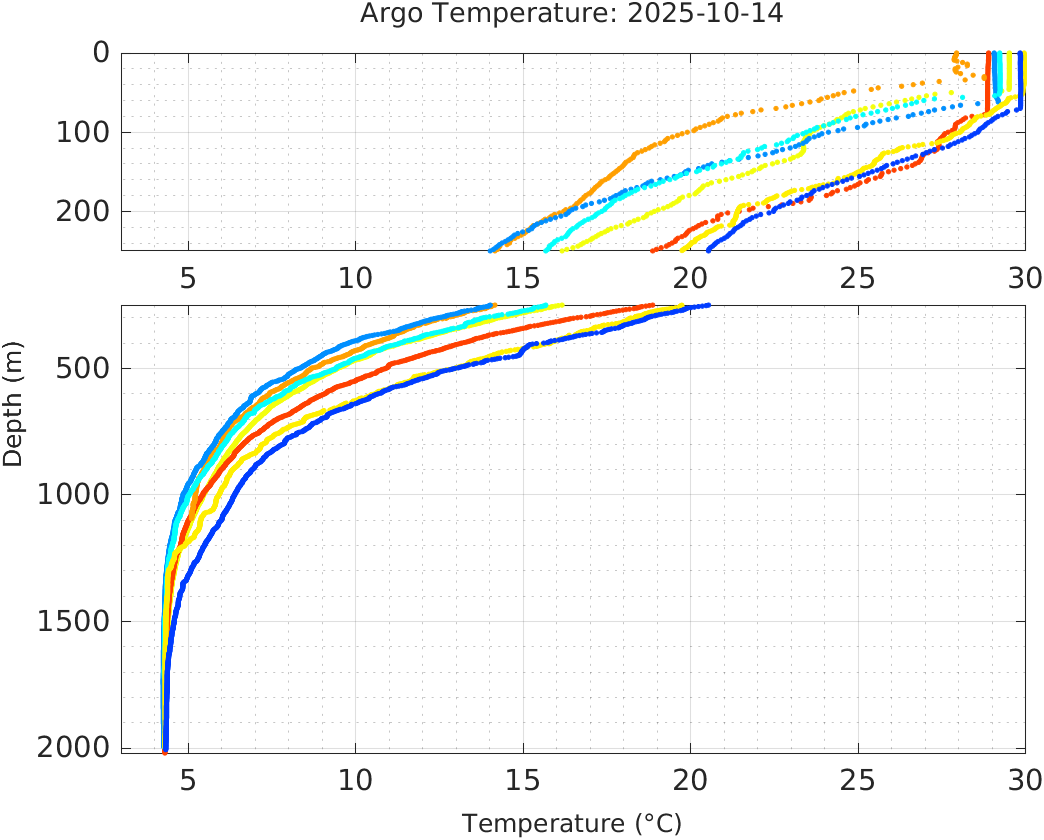 This page shows profile data collected by floats that are part of the global Argo program. The color of each profile corresponds to the time of day of the data (shown in the location map in column 1).