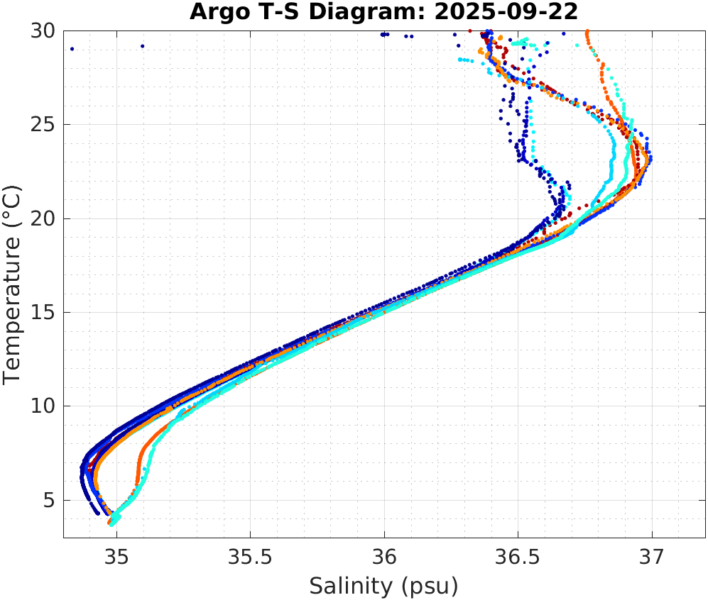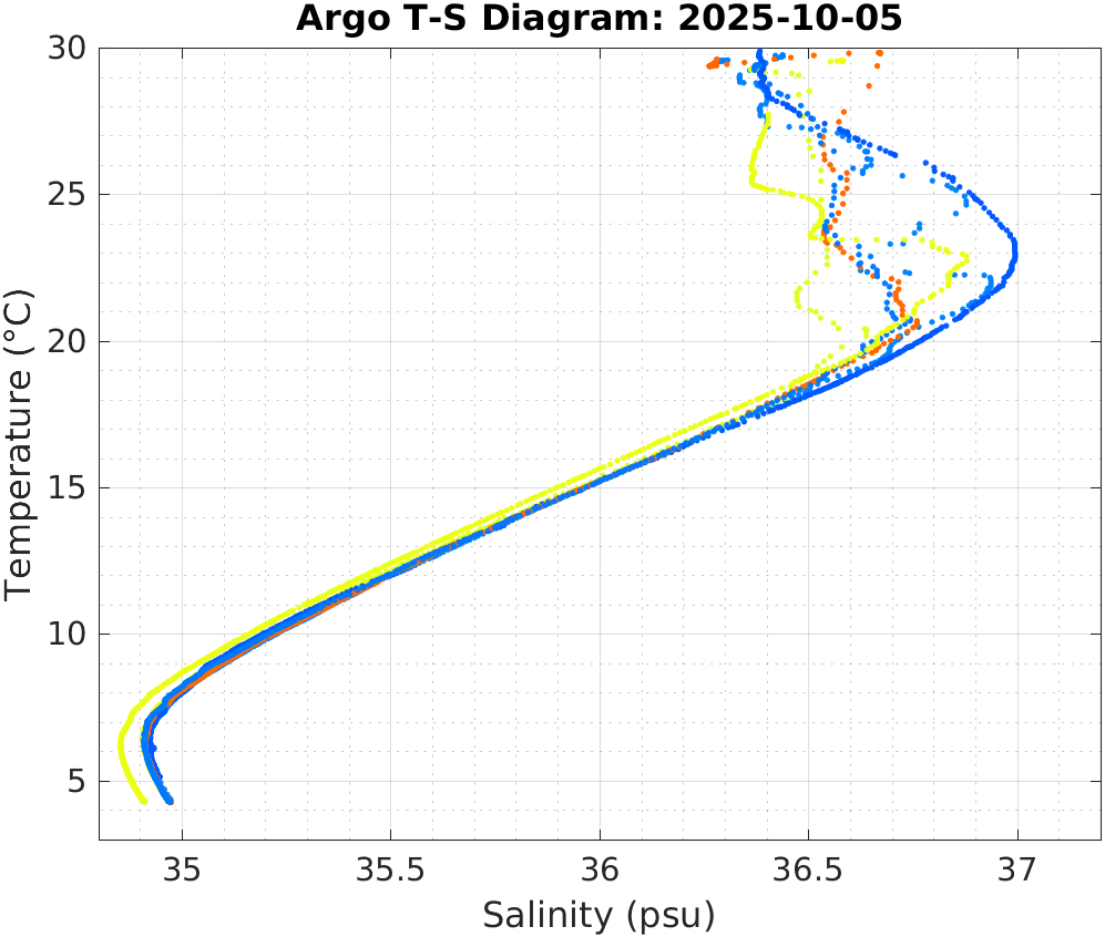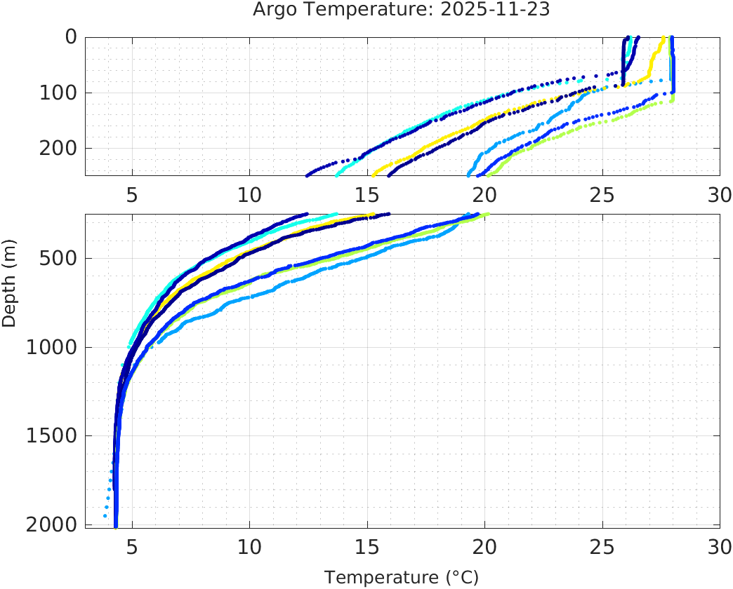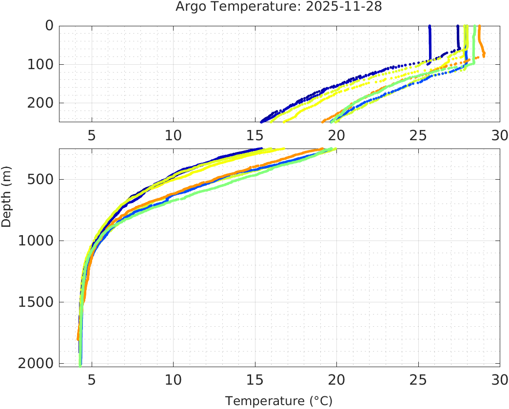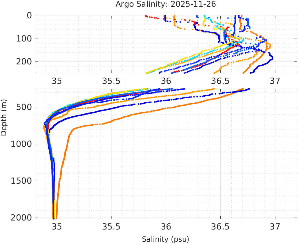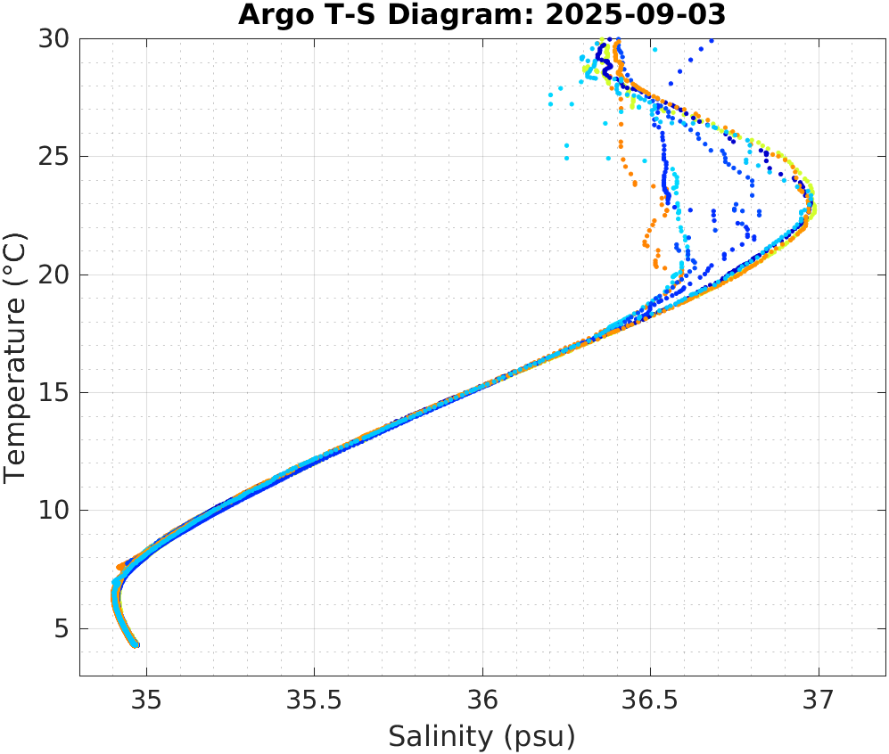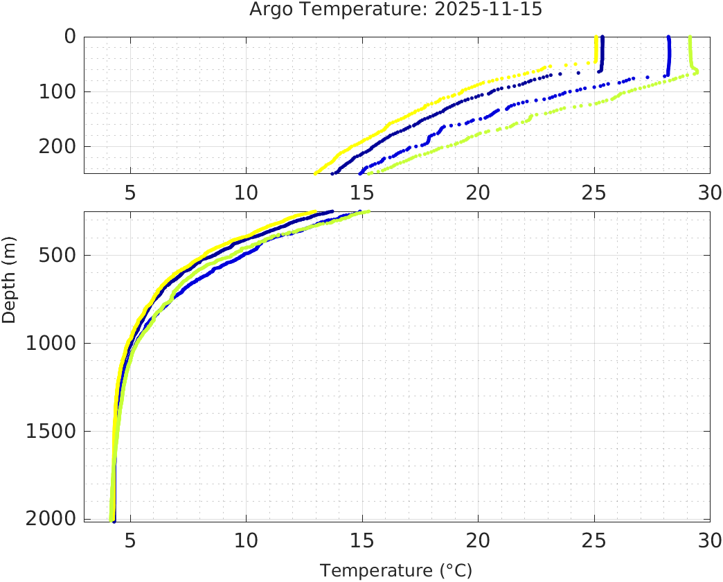 This page shows profile data collected by floats that are part of the global Argo program. The color of each profile corresponds to the time of day of the data (shown in the location map in column 1).