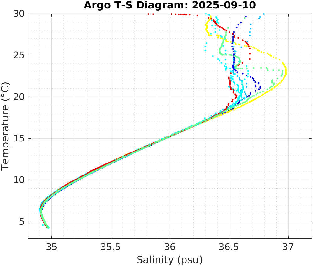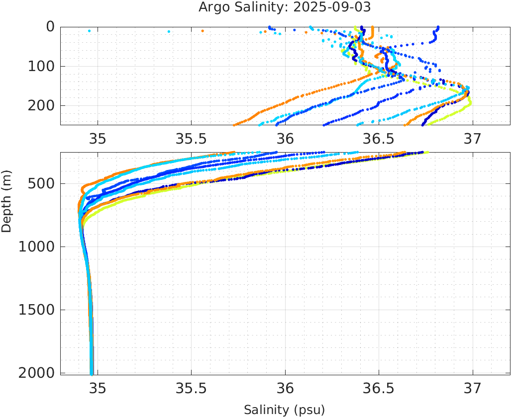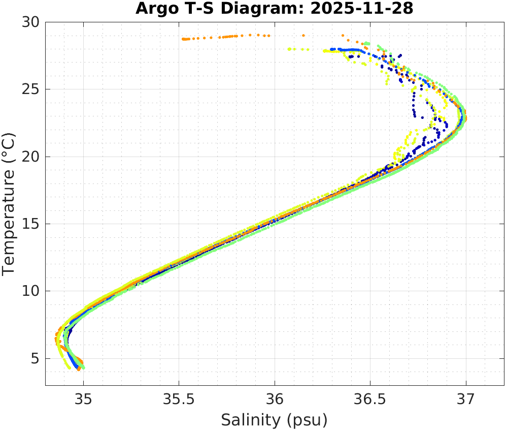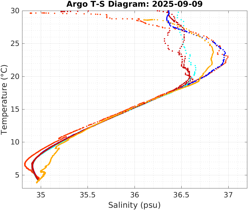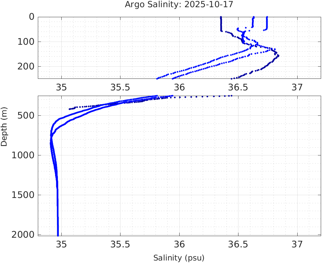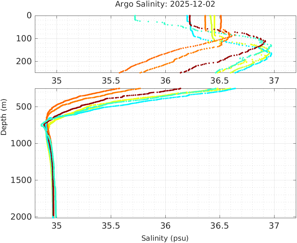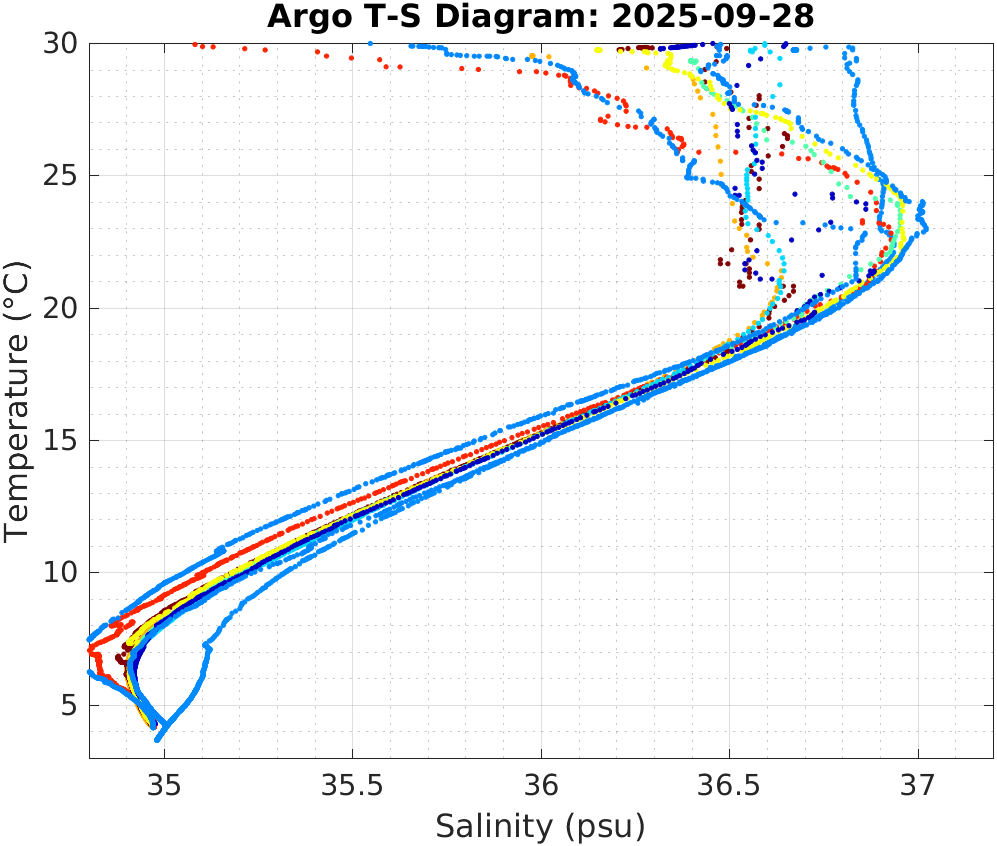 This page shows profile data collected by floats that are part of the global Argo program. The color of each profile corresponds to the time of day of the data (shown in the location map in column 1).