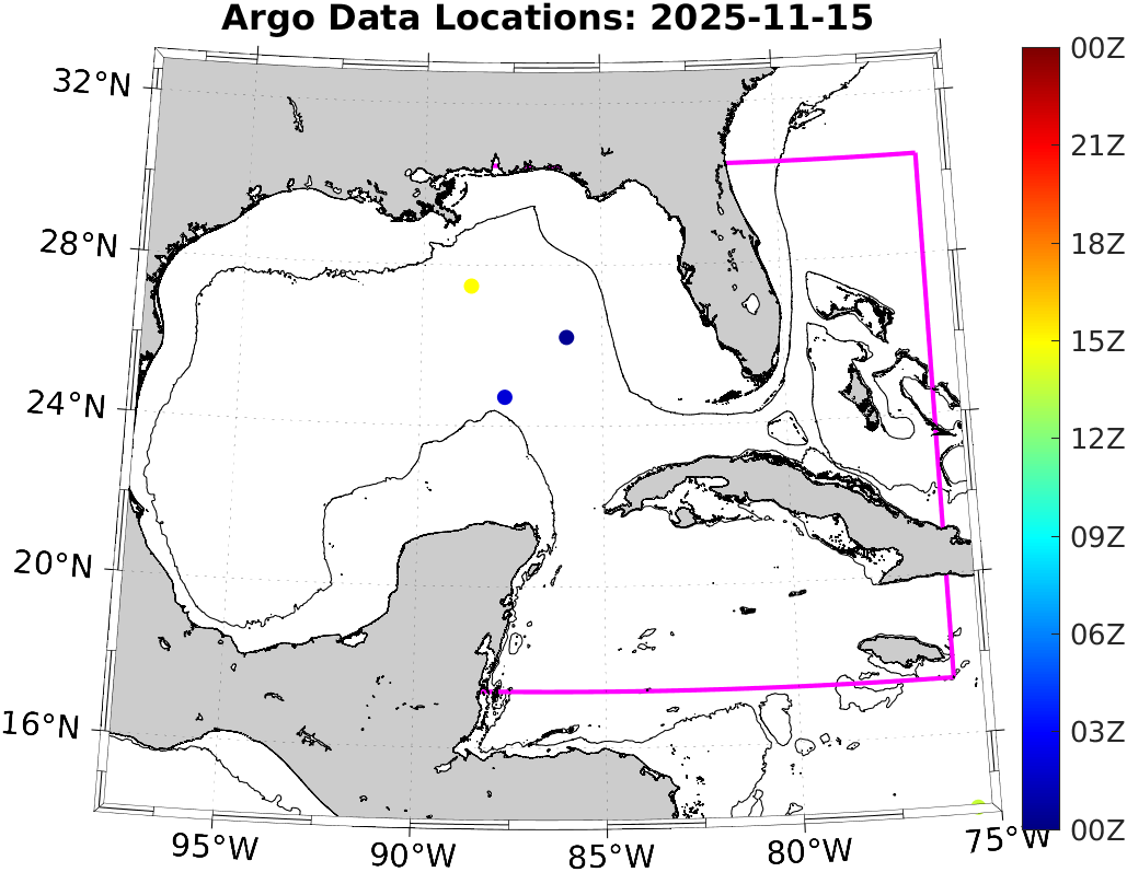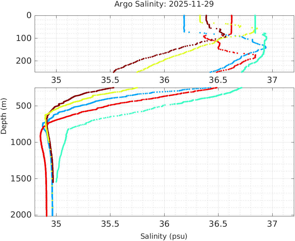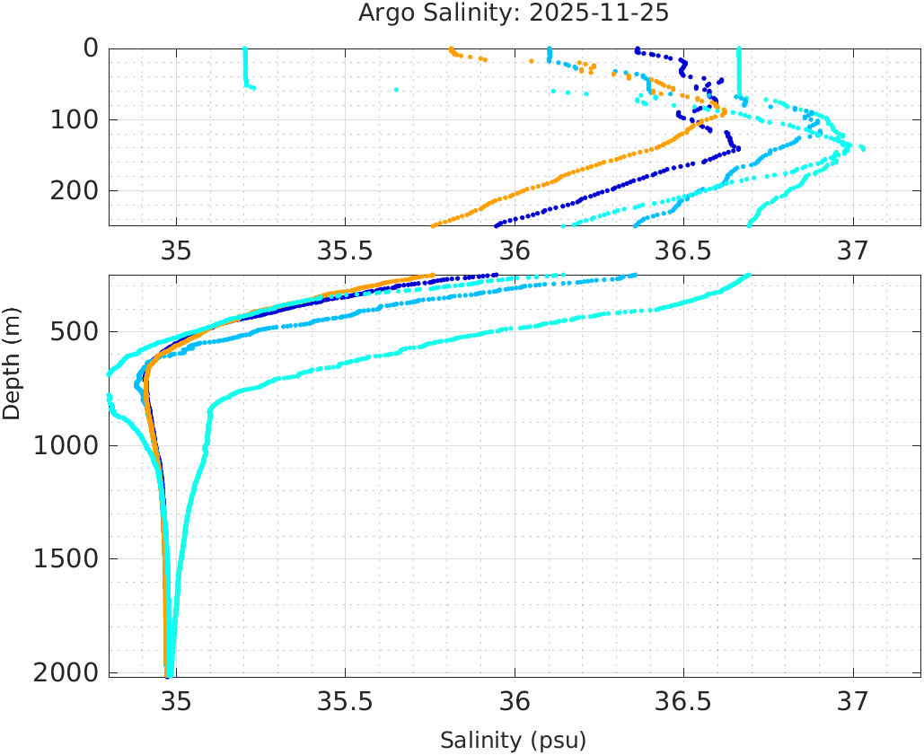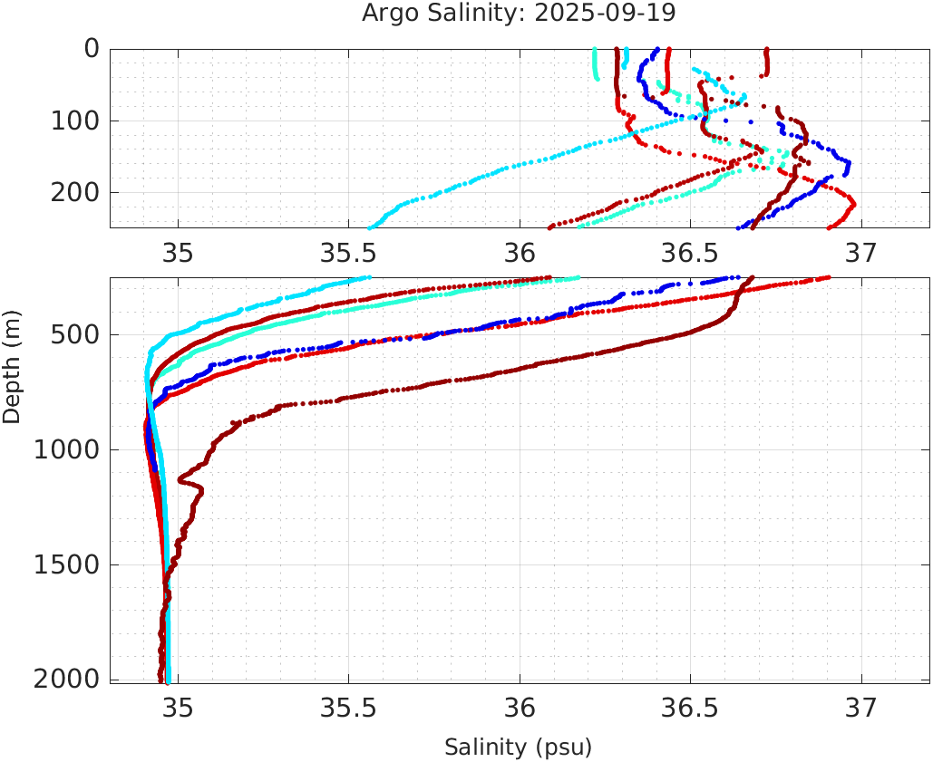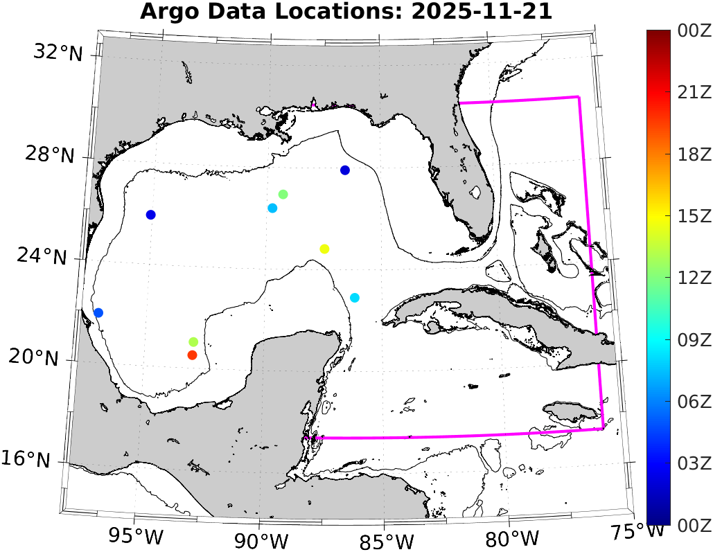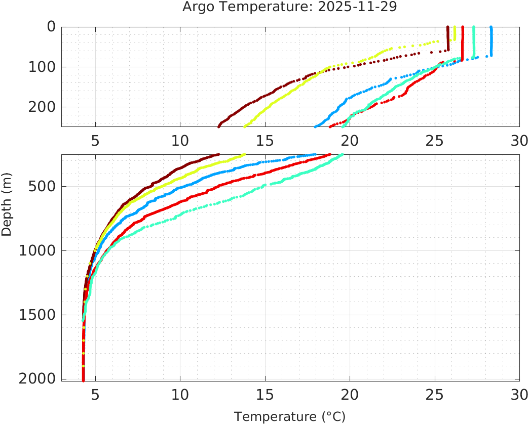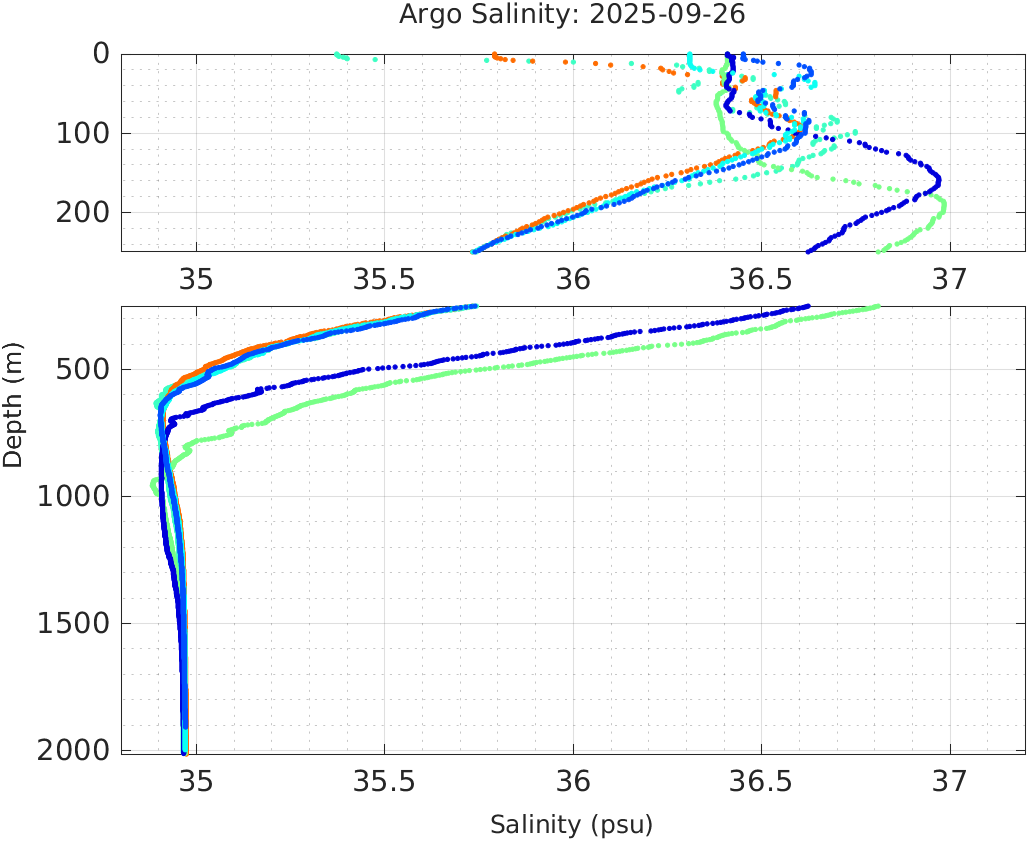 This page shows profile data collected by floats that are part of the global Argo program. The color of each profile corresponds to the time of day of the data (shown in the location map in column 1).