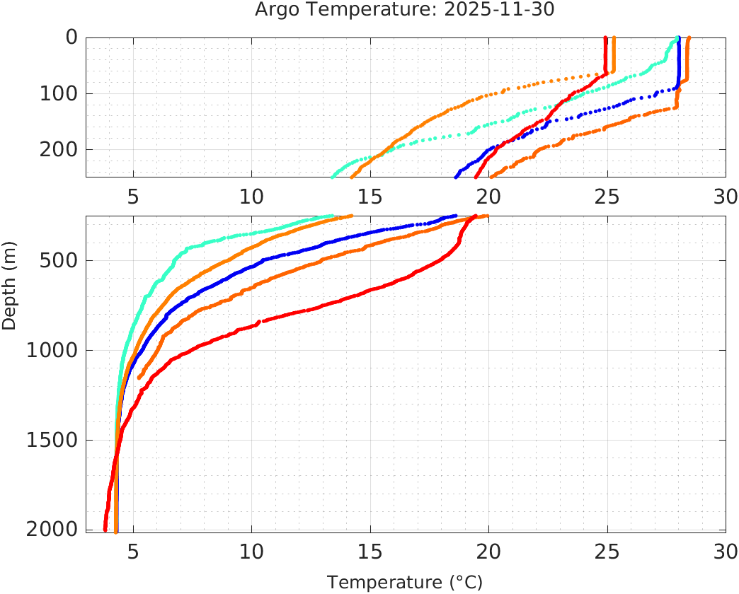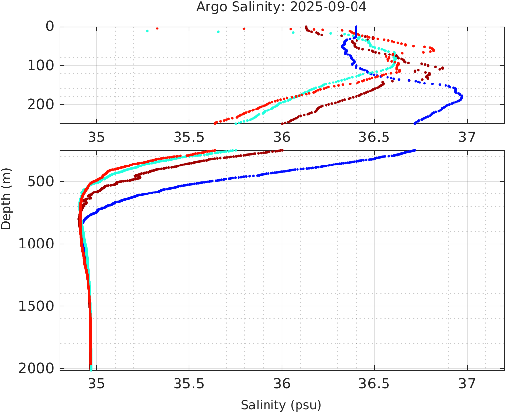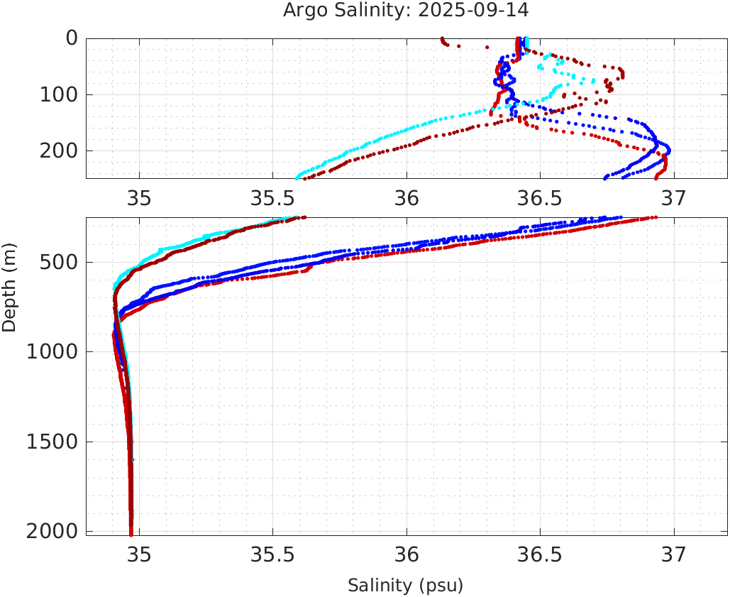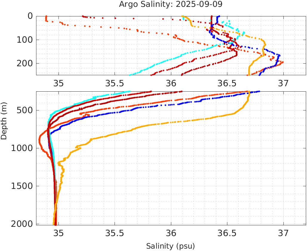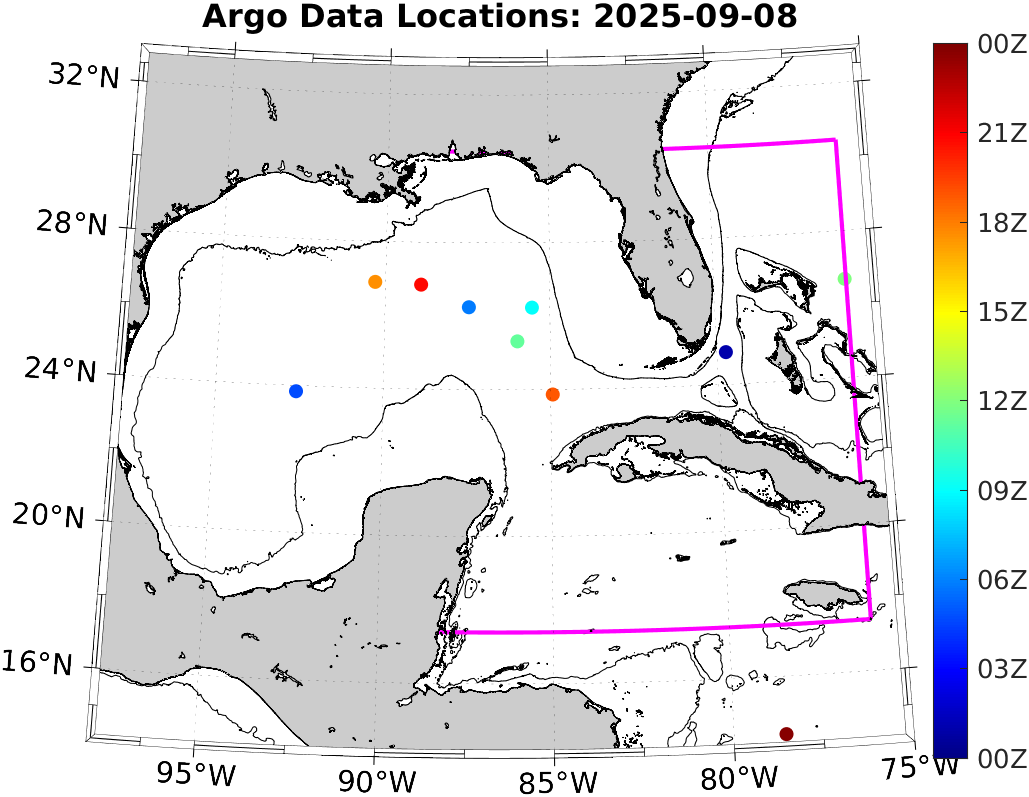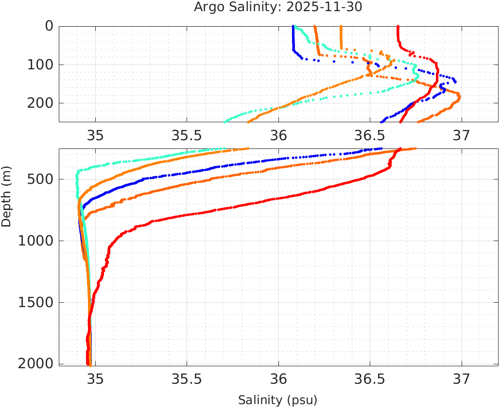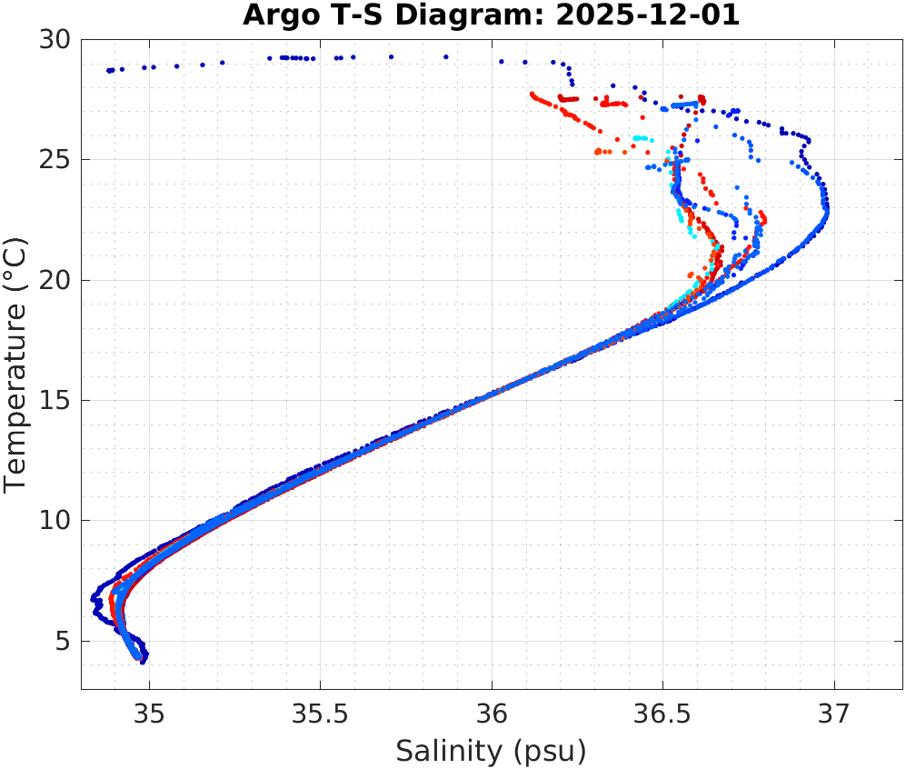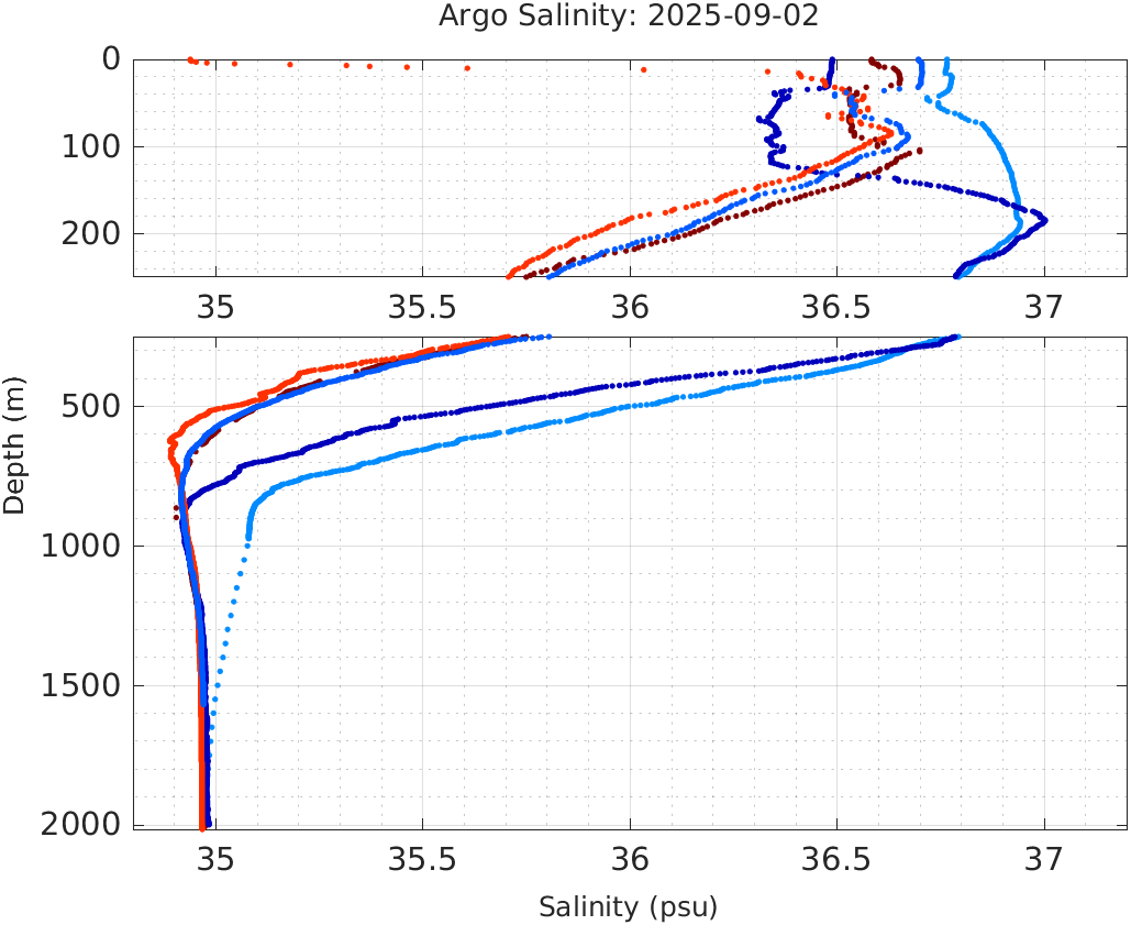 This page shows profile data collected by floats that are part of the global Argo program. The color of each profile corresponds to the time of day of the data (shown in the location map in column 1).