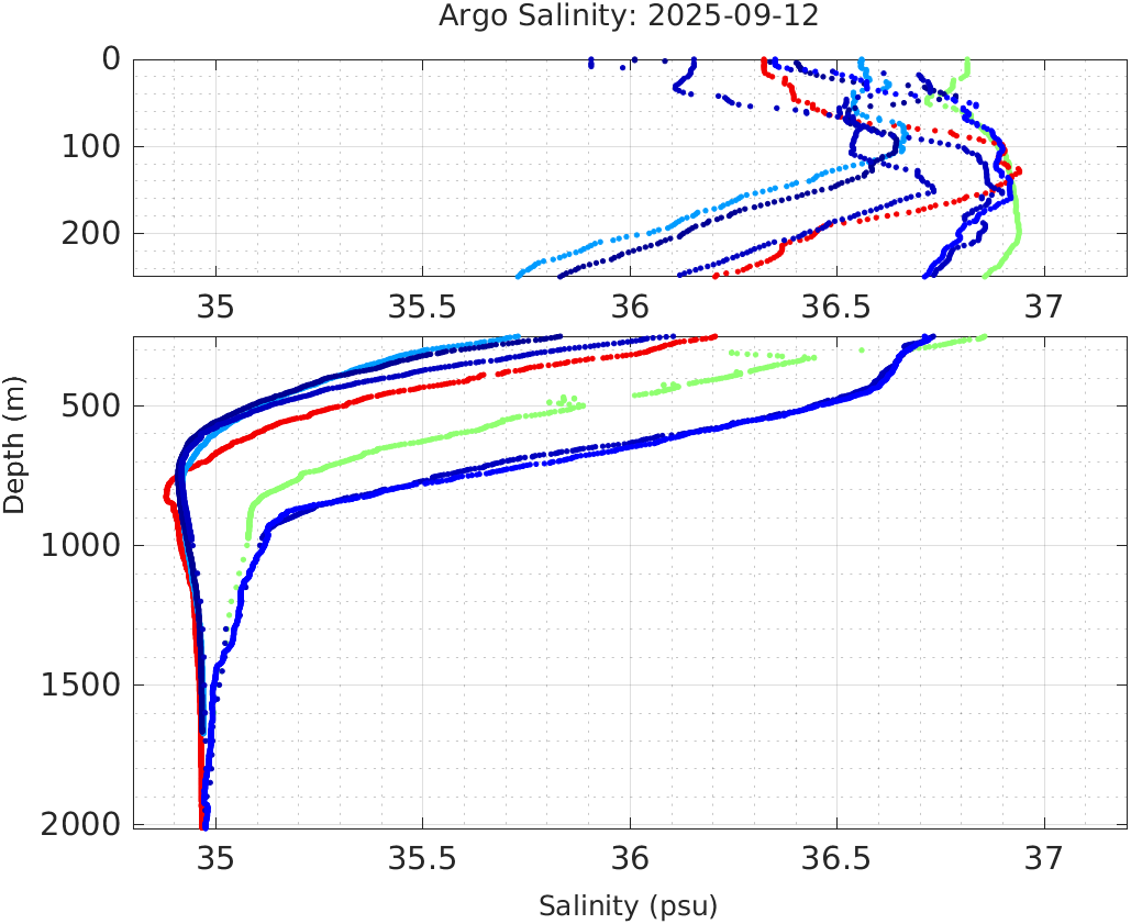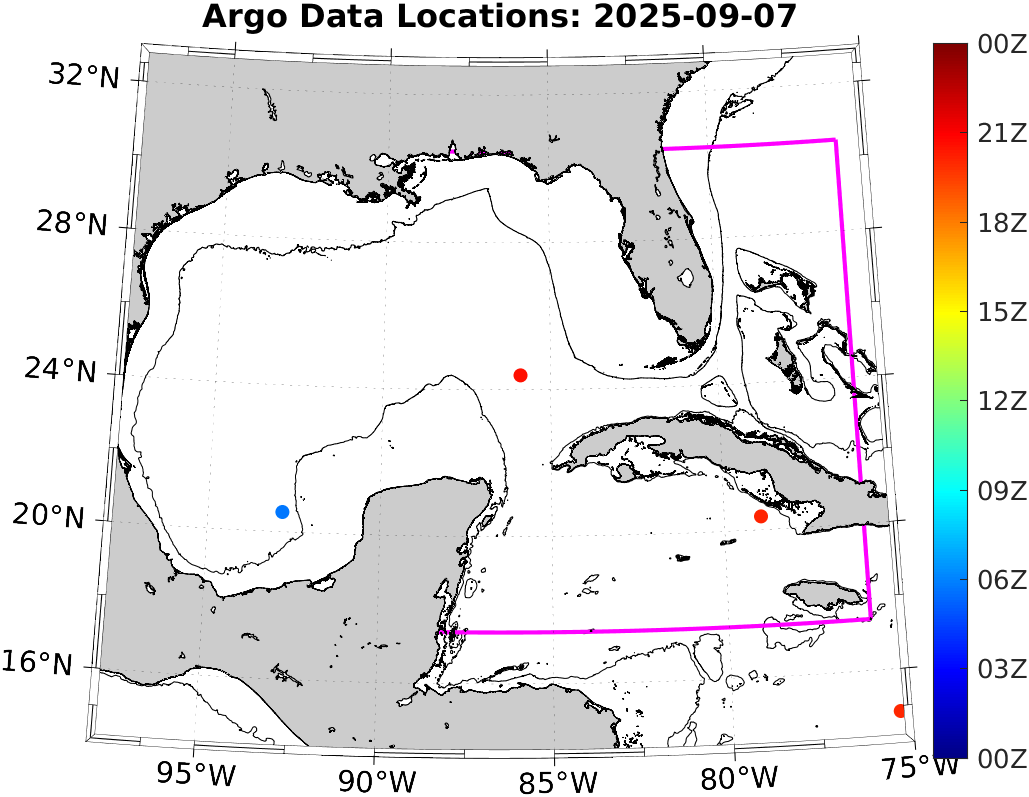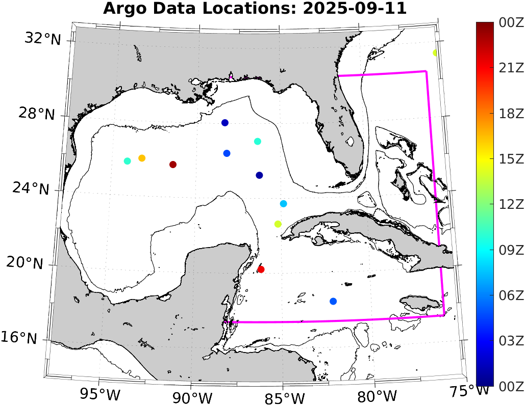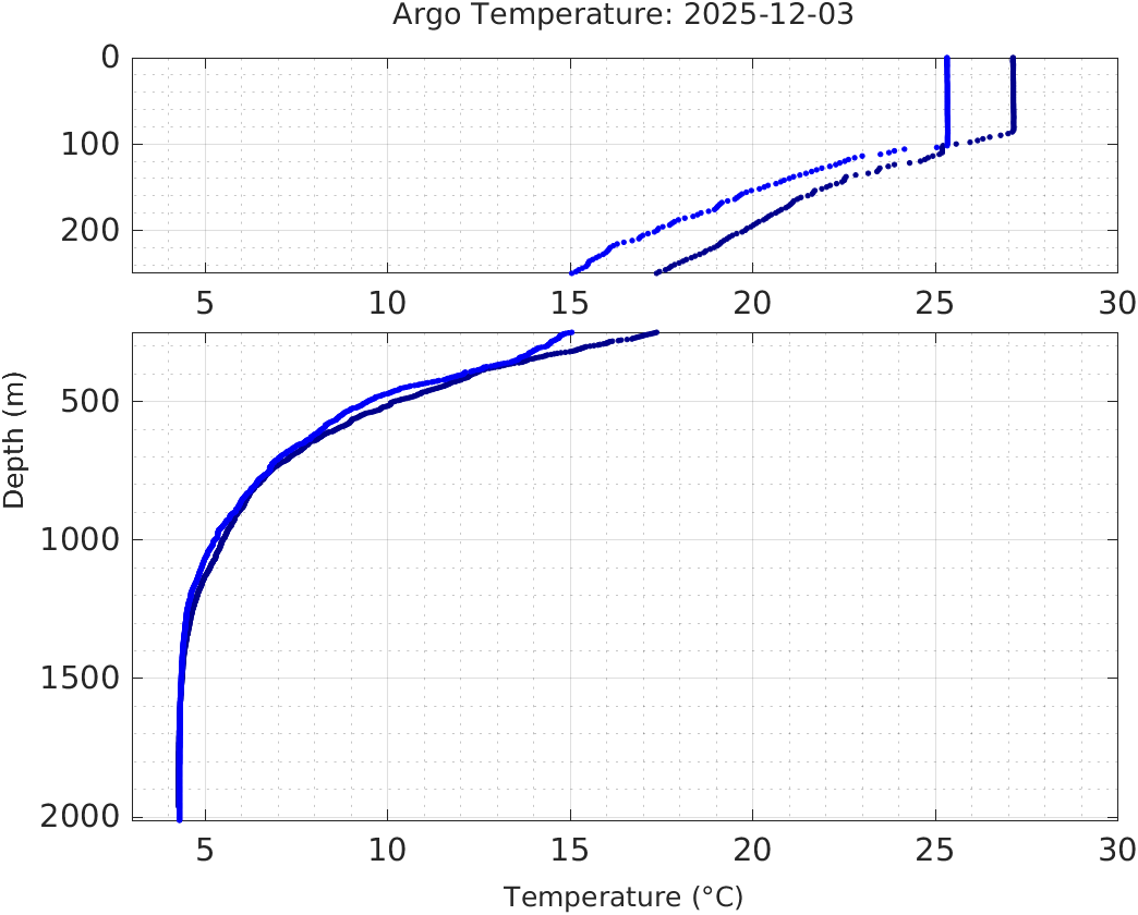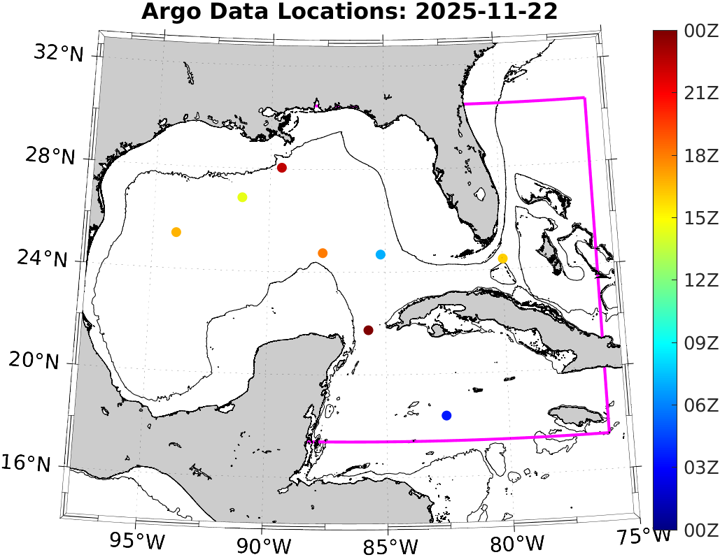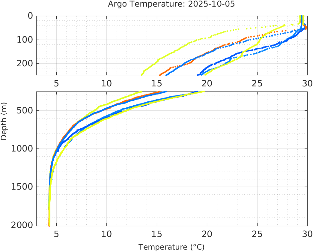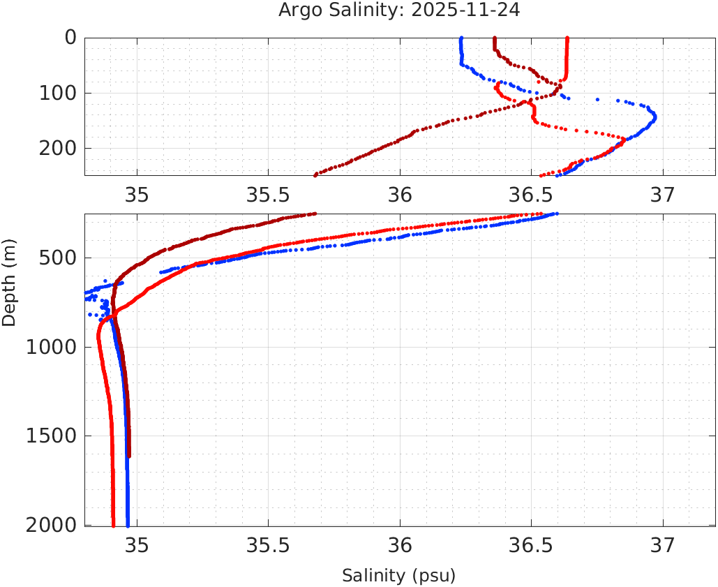 This page shows profile data collected by floats that are part of the global Argo program. The color of each profile corresponds to the time of day of the data (shown in the location map in column 1).