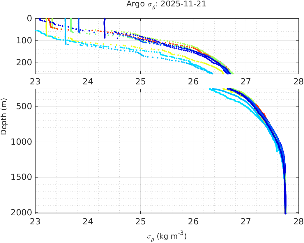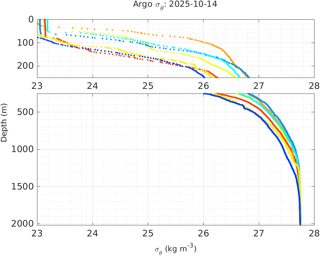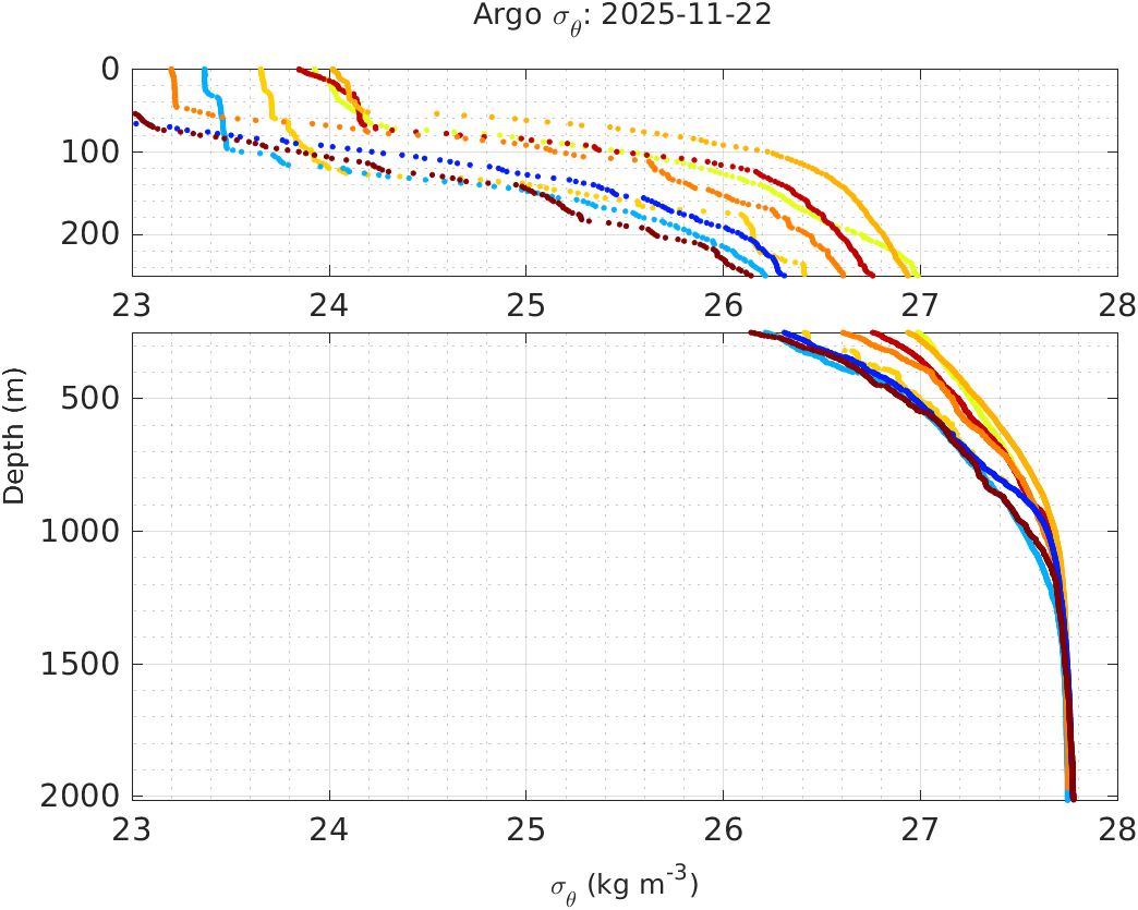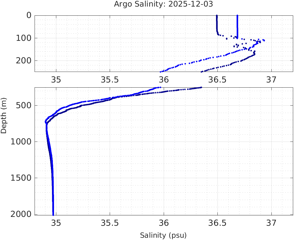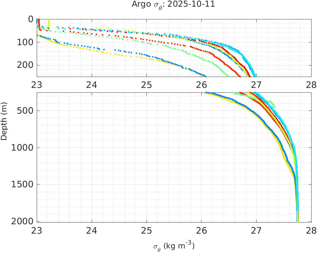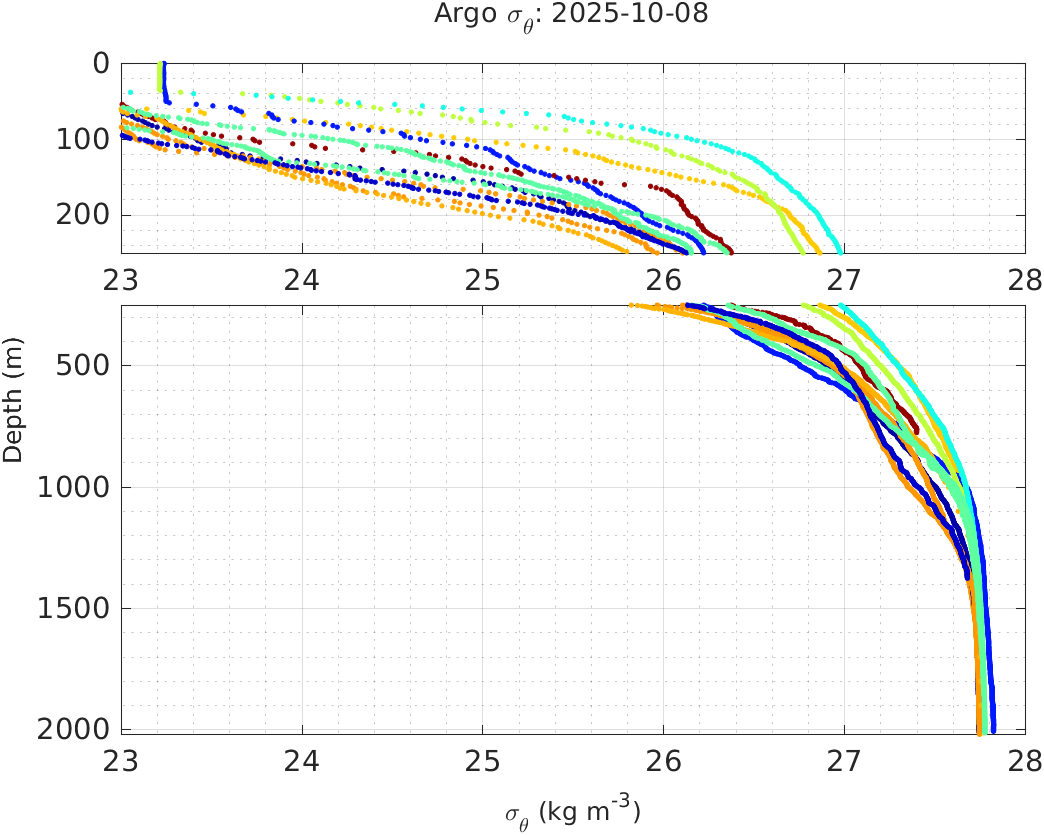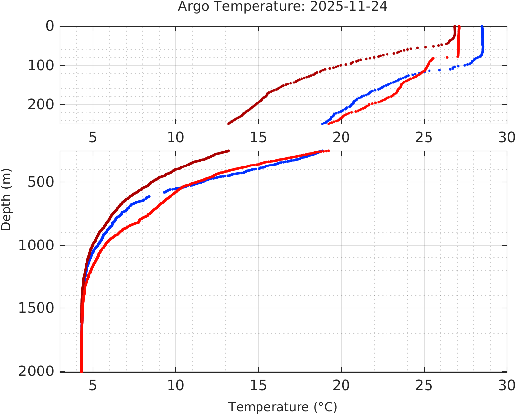 This page shows profile data collected by floats that are part of the global Argo program. The color of each profile corresponds to the time of day of the data (shown in the location map in column 1).