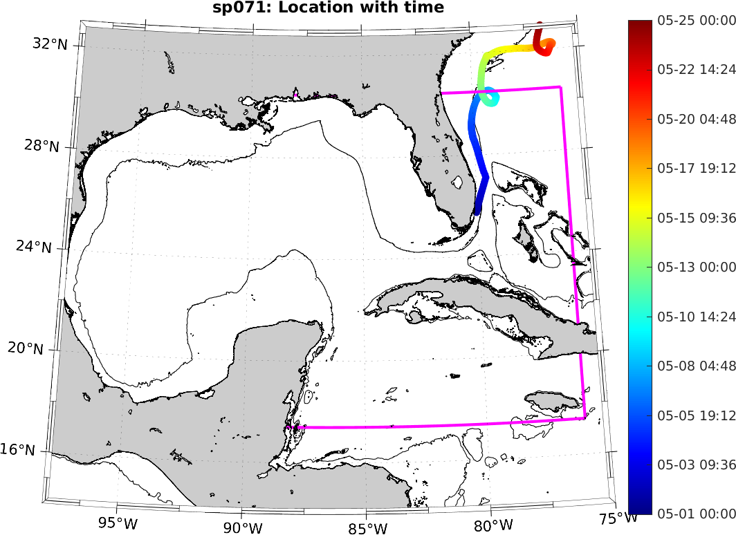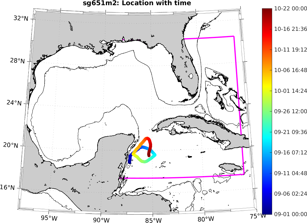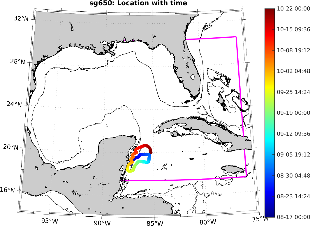 Note: mote-holly and mote-holly-m2 are from Mote Marine Laboratory and Aquarium in Sarasota, FL; sg265, from University of Miami; sam, usf-bass, usf-sam and usf-jaialai, from the University of South Florida; ru38 and ru38m2, from Rutgers; sg622, sg650, sg651, and sg651m2, from CICESE; unit_307, unit_308 (= Howdy), and unit_1148 (= Aaliyah), from TAMU; nori, ori, and sg677, from the University of Southern Mississippi; ng264, ng598, ng735, the Naval Oceanographic Office; sp062 and sp071, Woods Hole Oceanographic Institution. Other gliders we will be tracking are deployed by our GRASE colleagues.