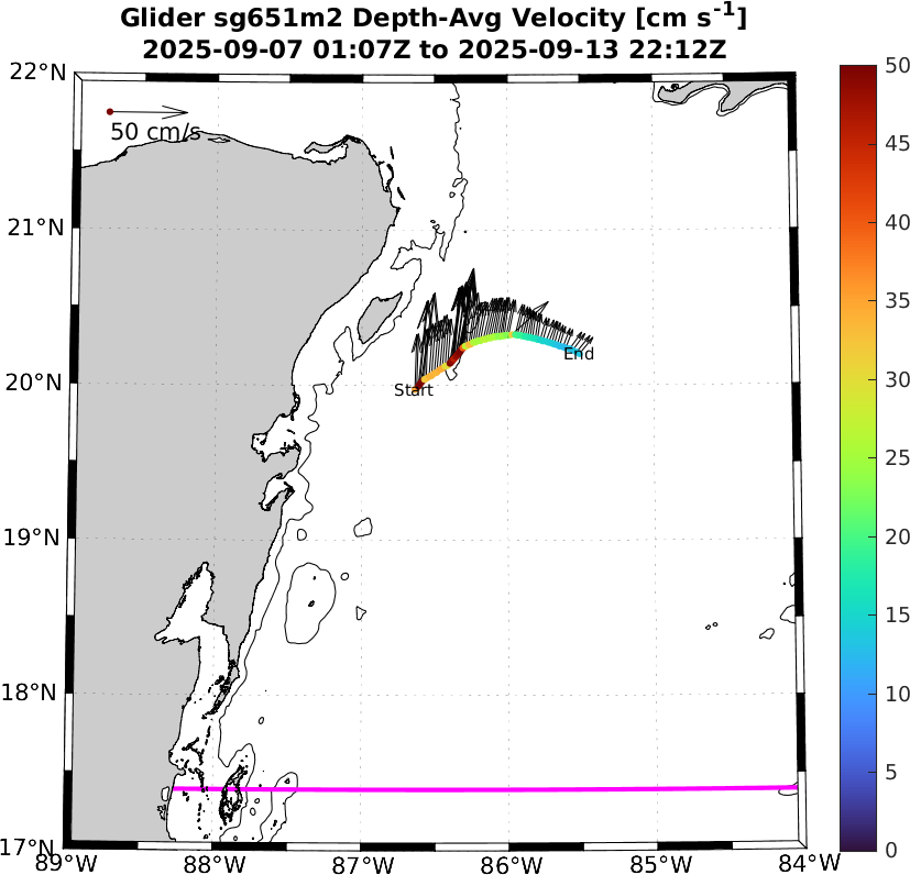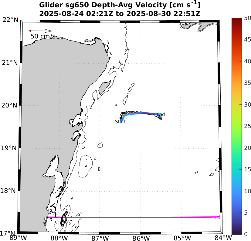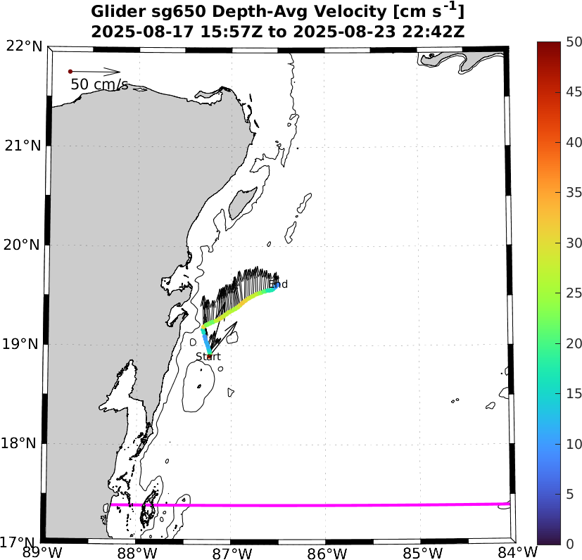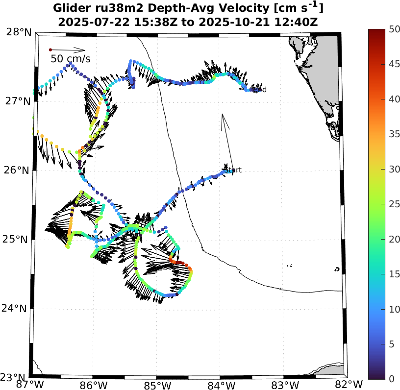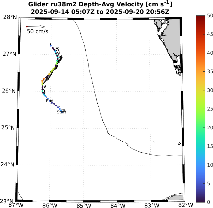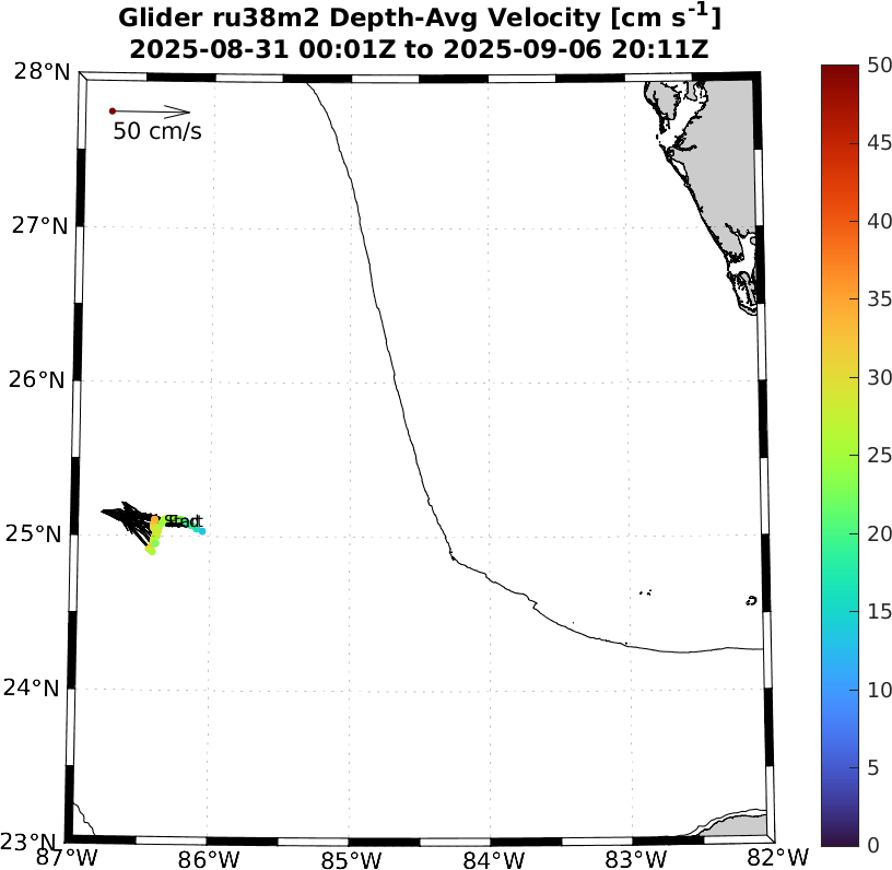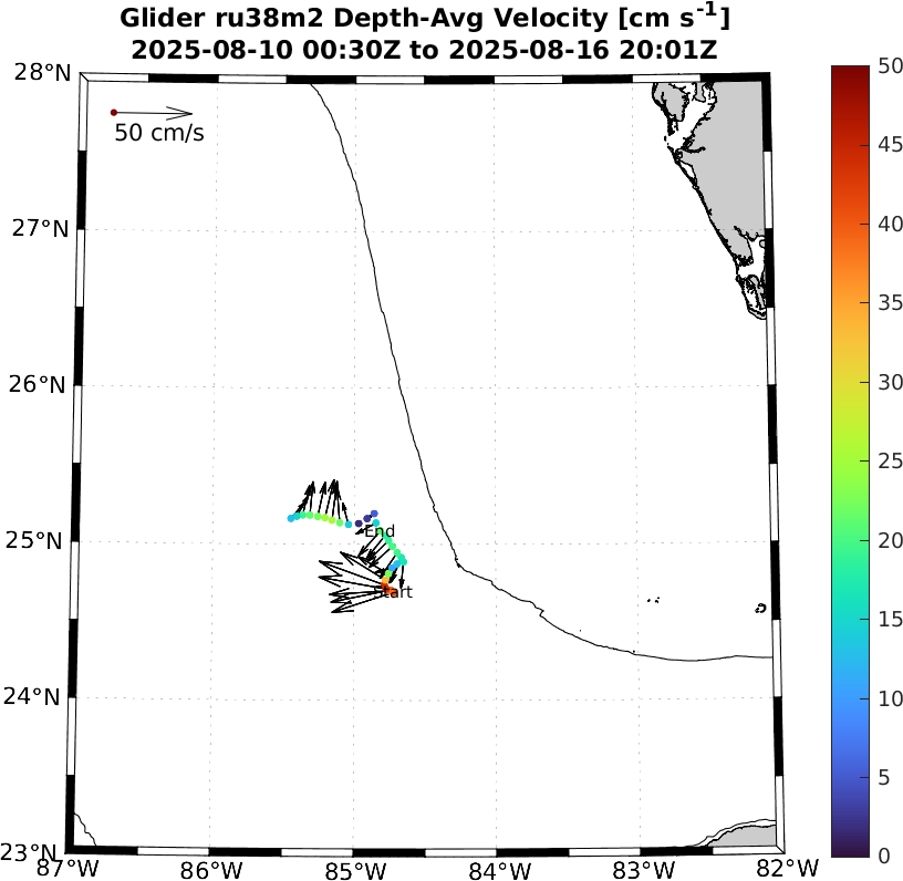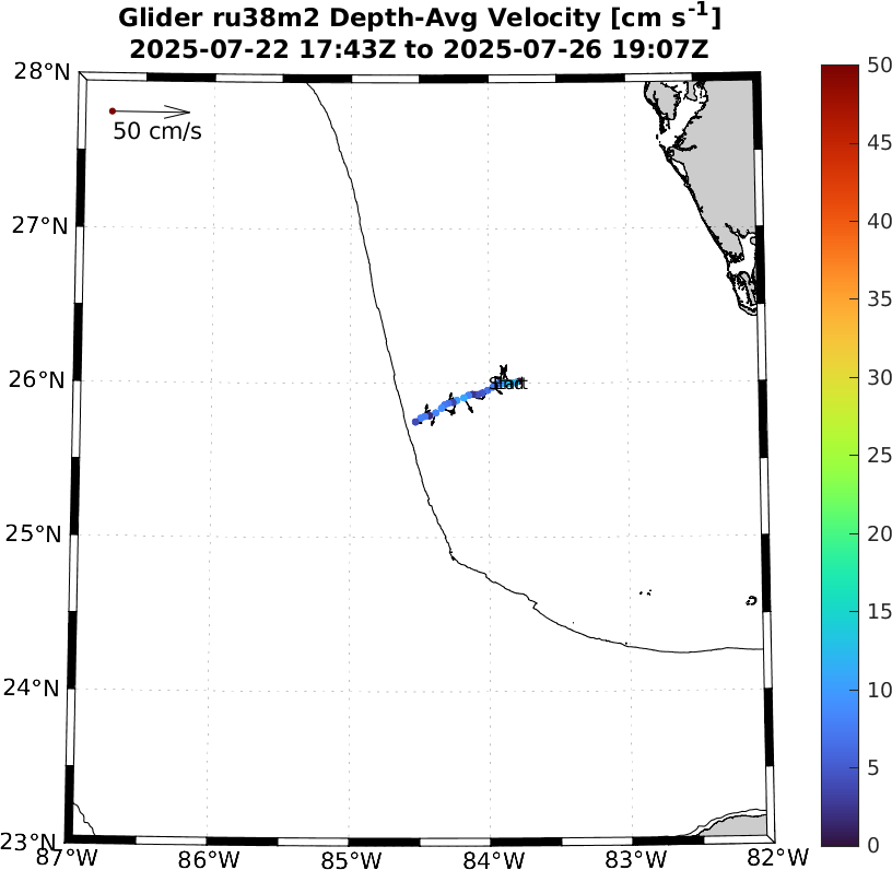 Here we show the depth-averaged velocities (cm/s) for each active glider in the GRASE region. We thank the GRASE glider teams (Rutgers, TAMU, CICESE, etc.) for their glider data.