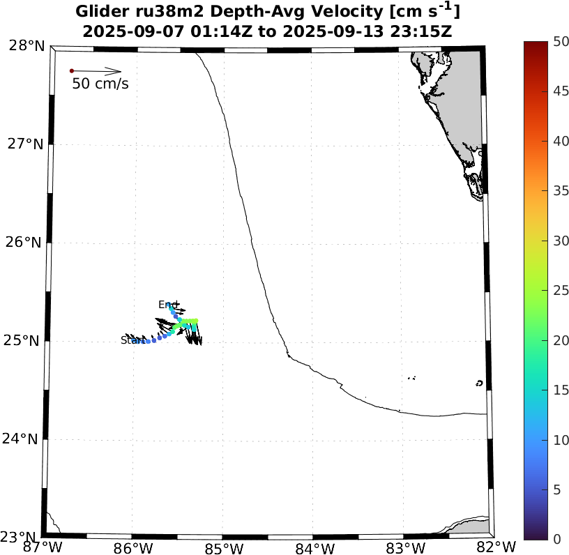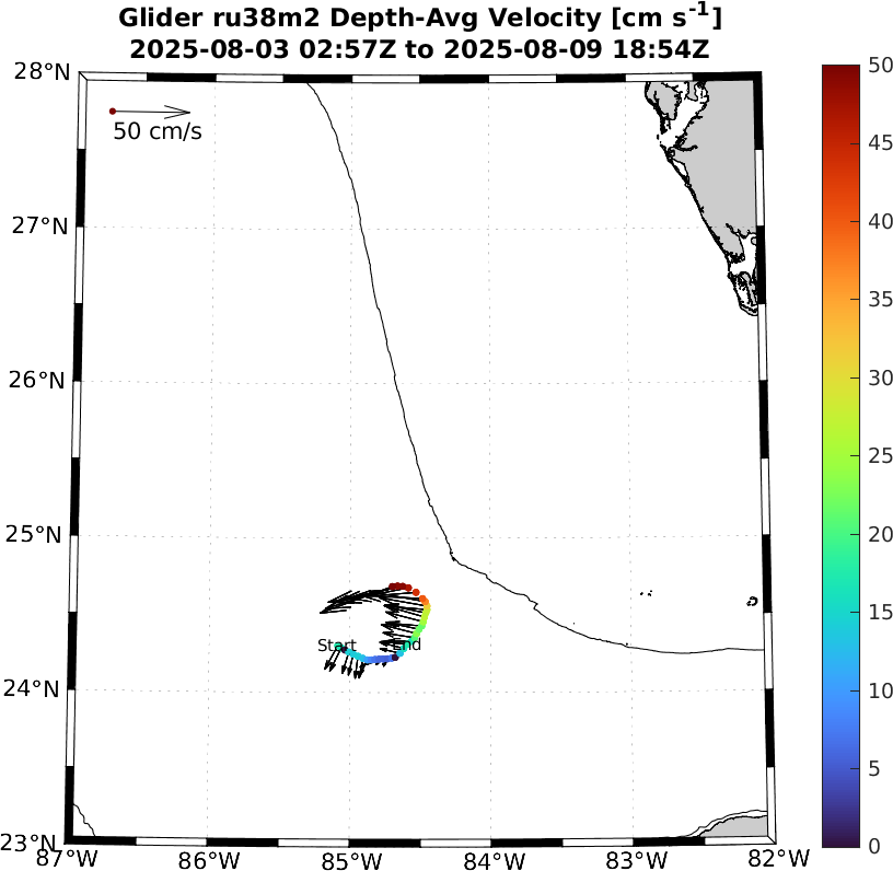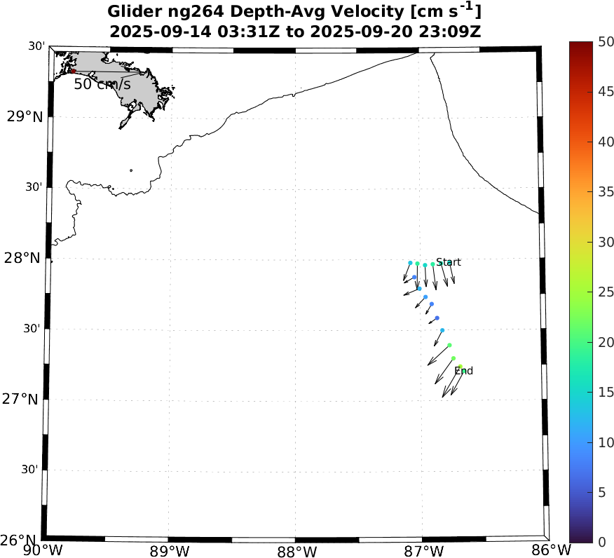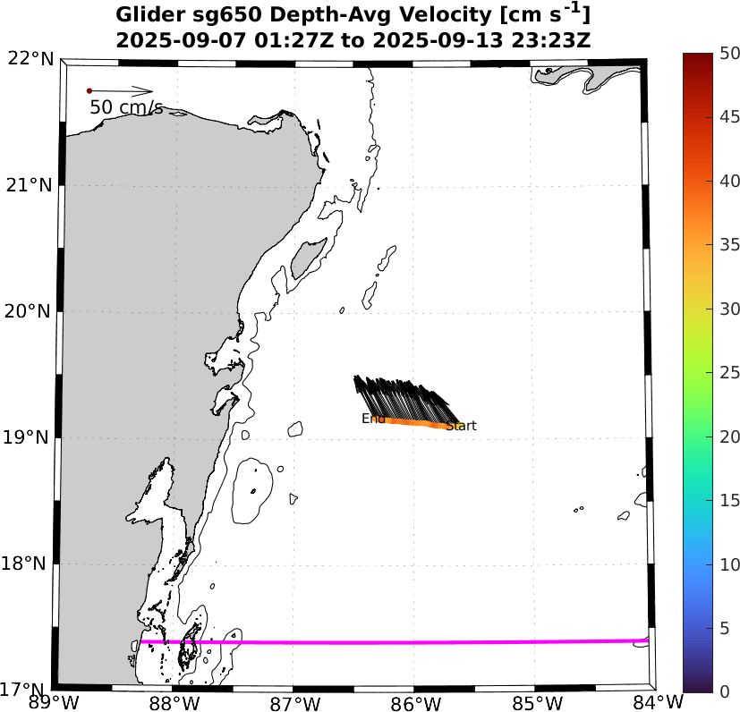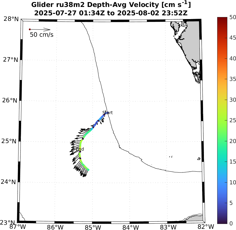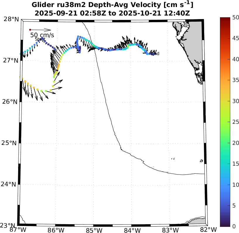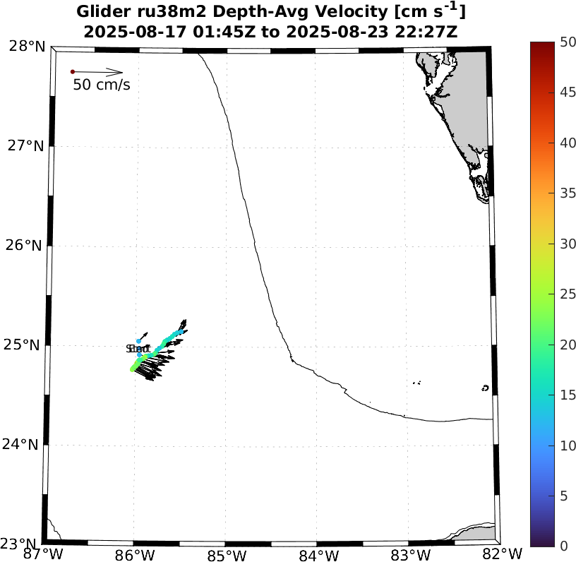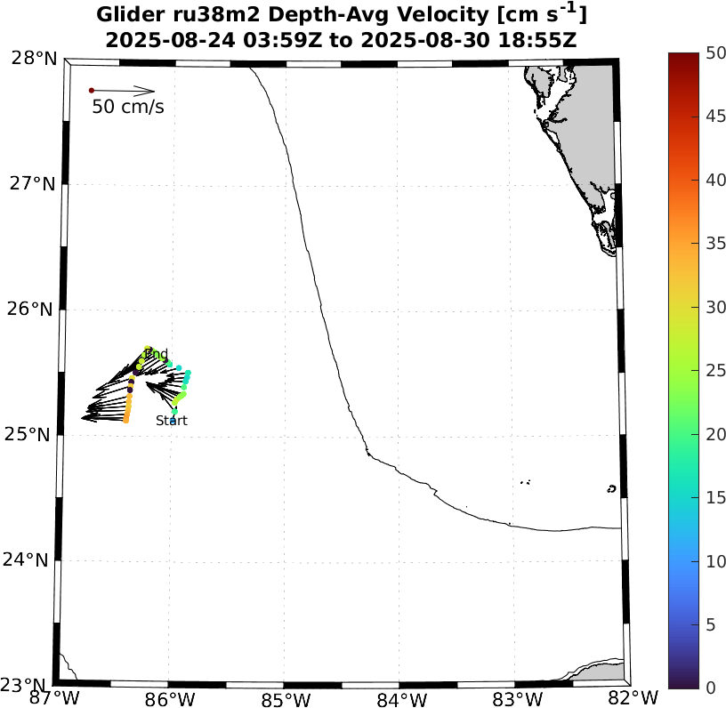 Here we show the depth-averaged velocities (cm/s) for each active glider in the GRASE region. We thank the GRASE glider teams (Rutgers, TAMU, CICESE, etc.) for their glider data.
