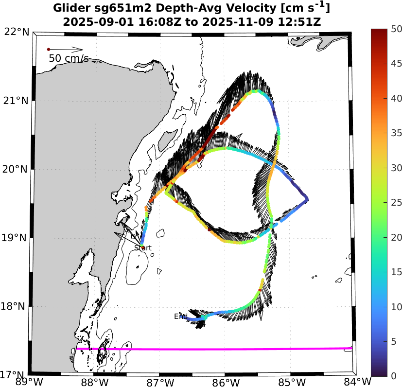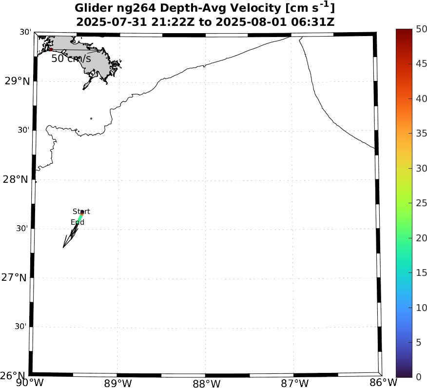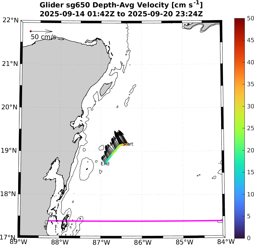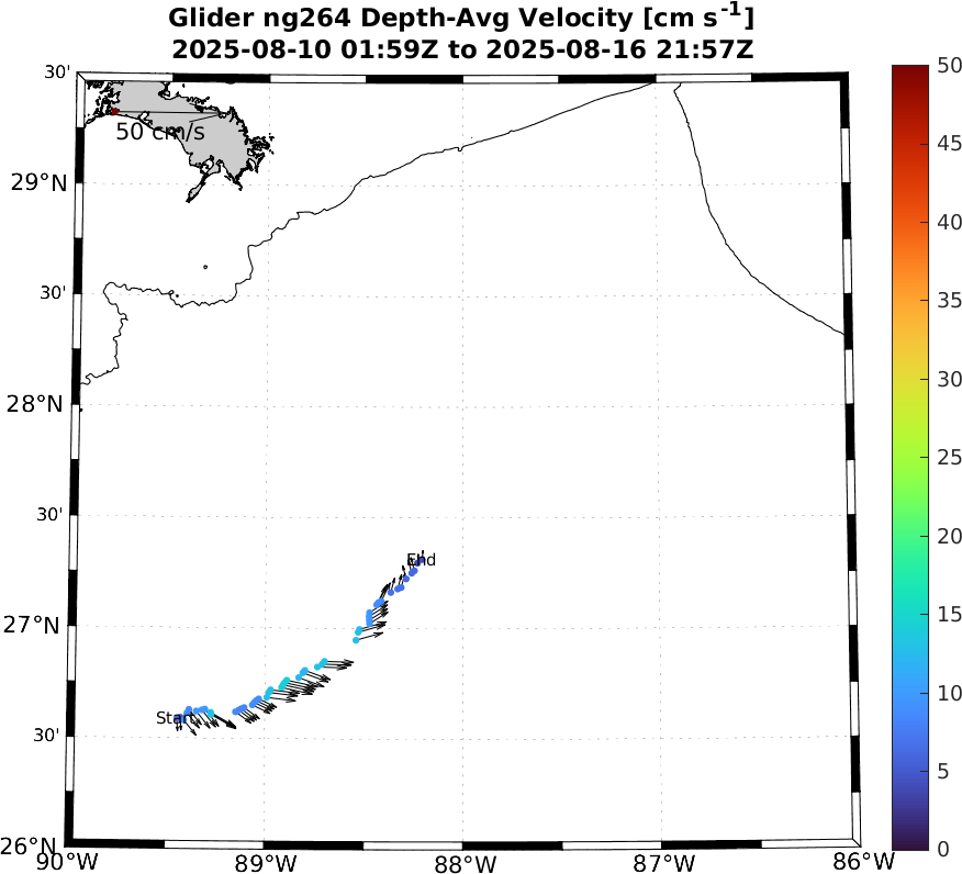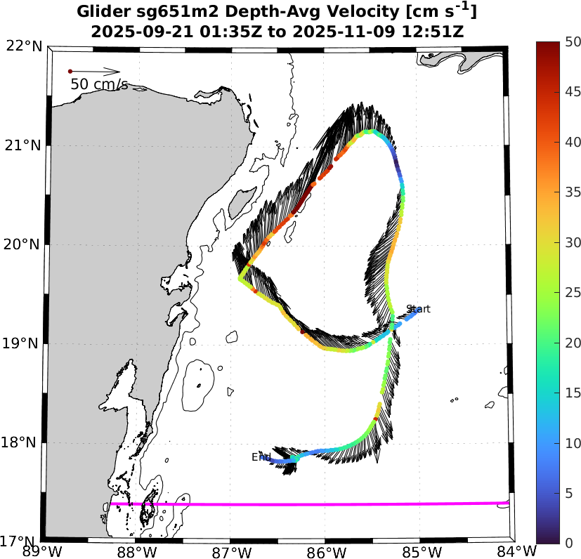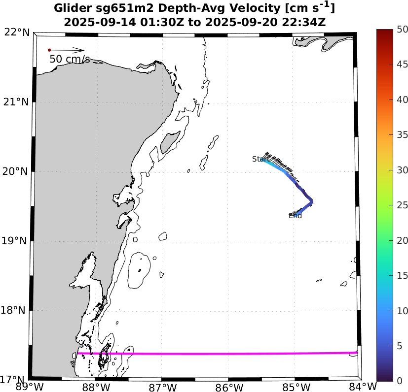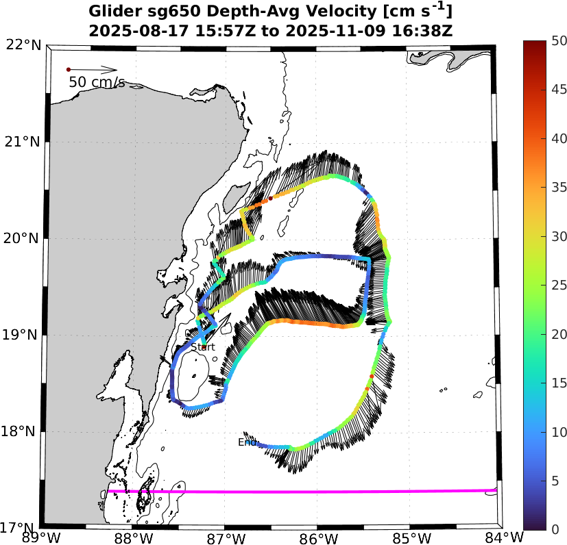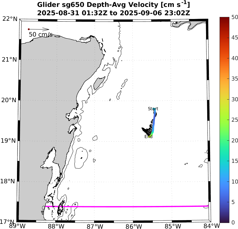 Here we show the depth-averaged velocities (cm/s) for each active glider in the GRASE region. We thank the GRASE glider teams (Rutgers, TAMU, CICESE, etc.) for their glider data.