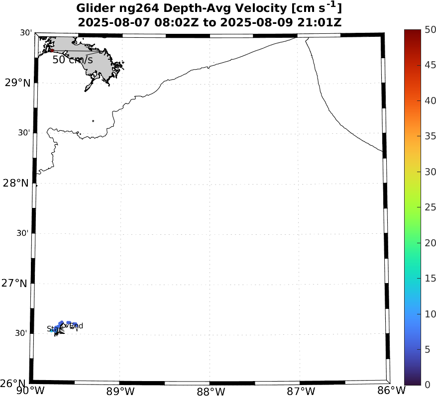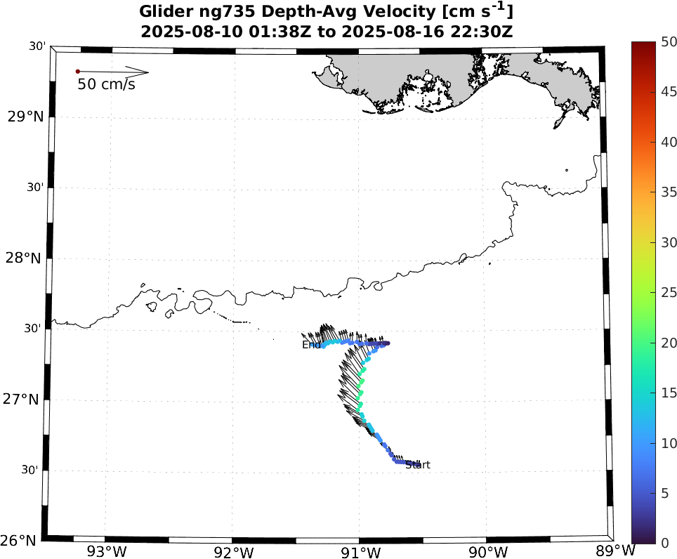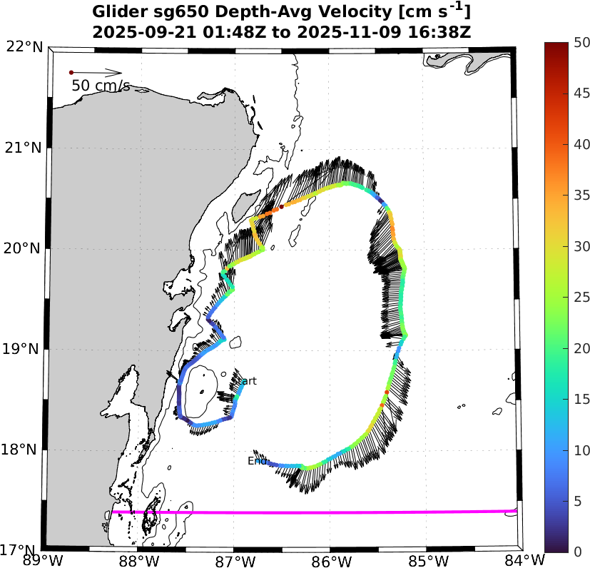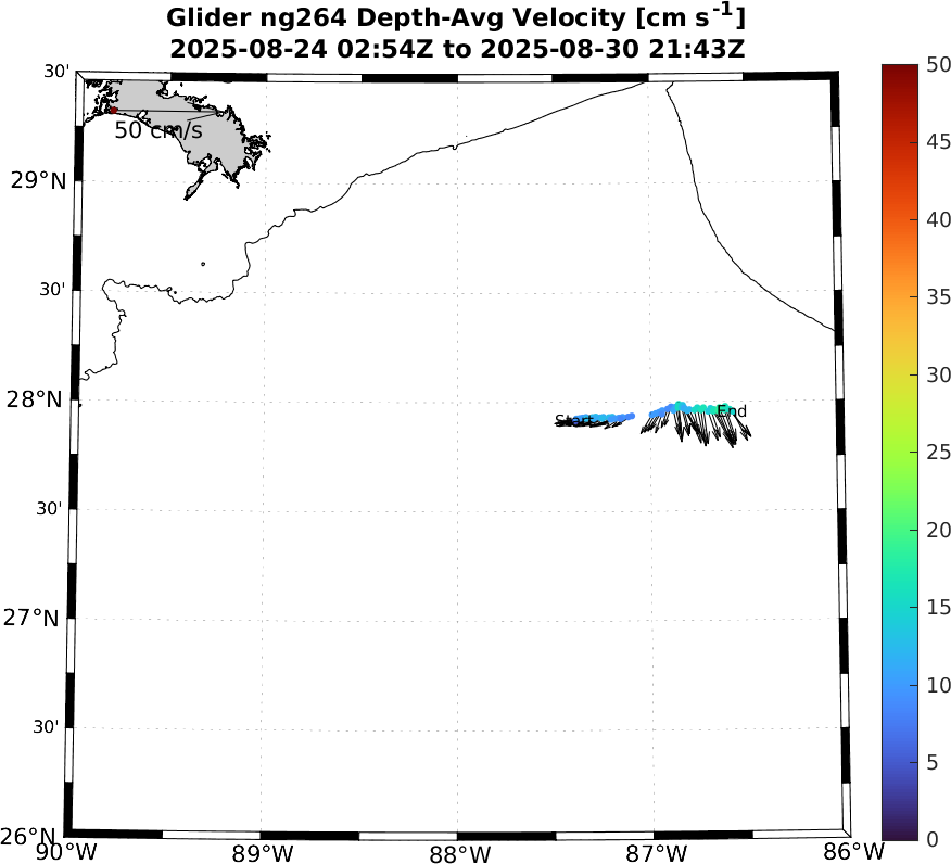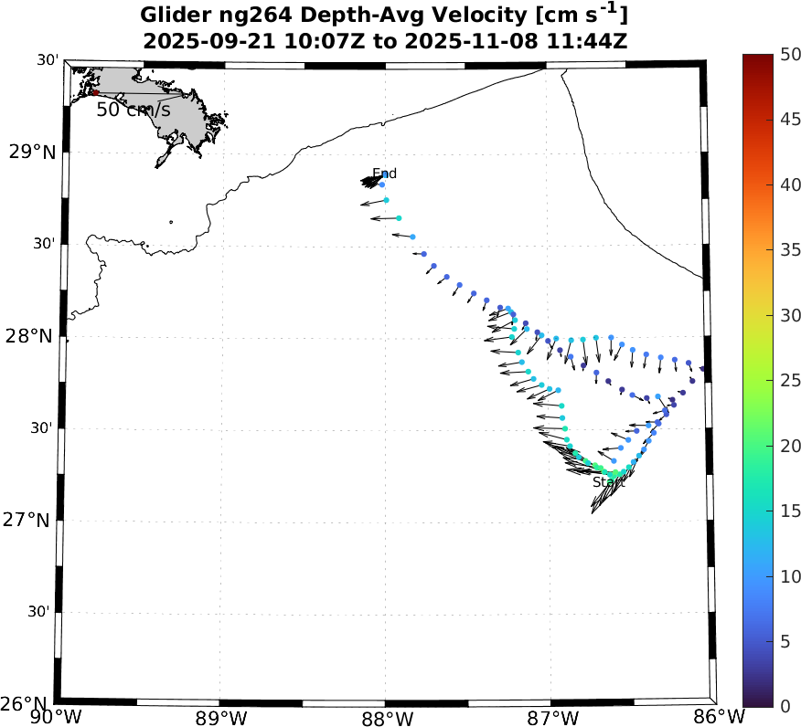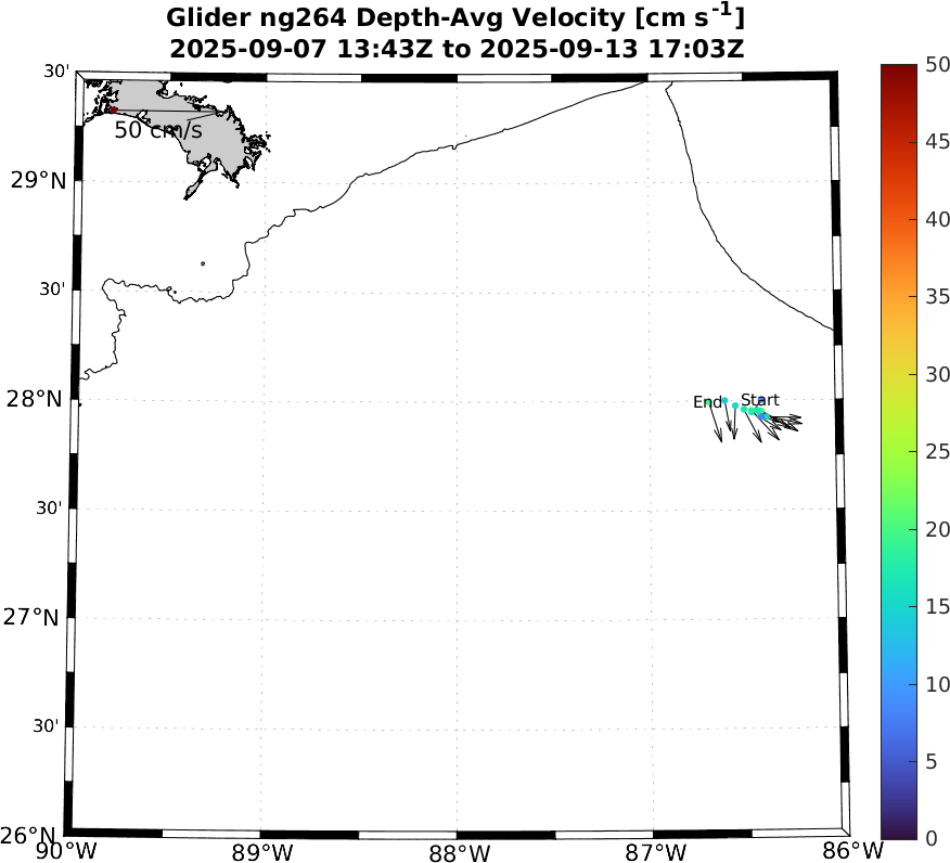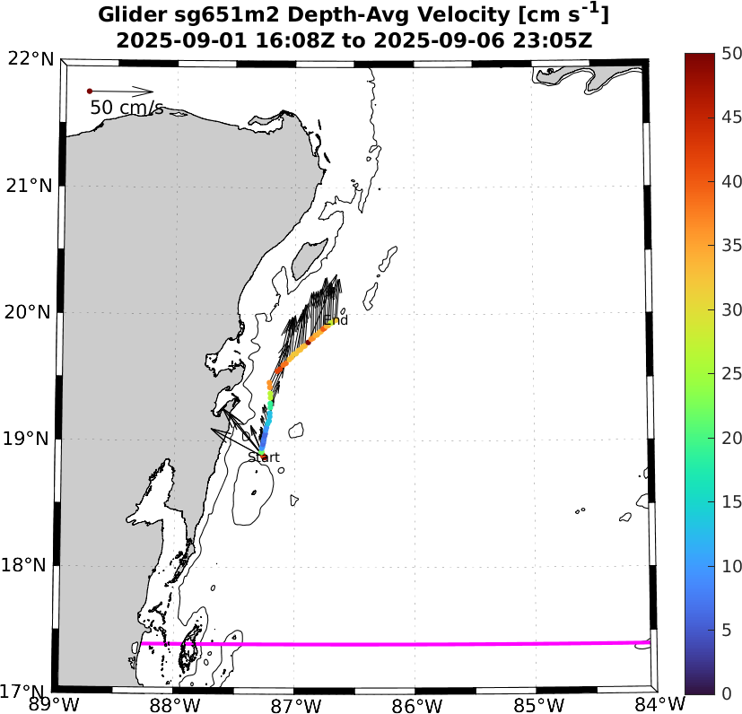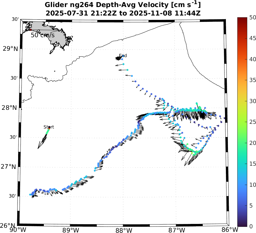 Here we show the depth-averaged velocities (cm/s) for each active glider in the GRASE region. We thank the GRASE glider teams (Rutgers, TAMU, CICESE, etc.) for their glider data.