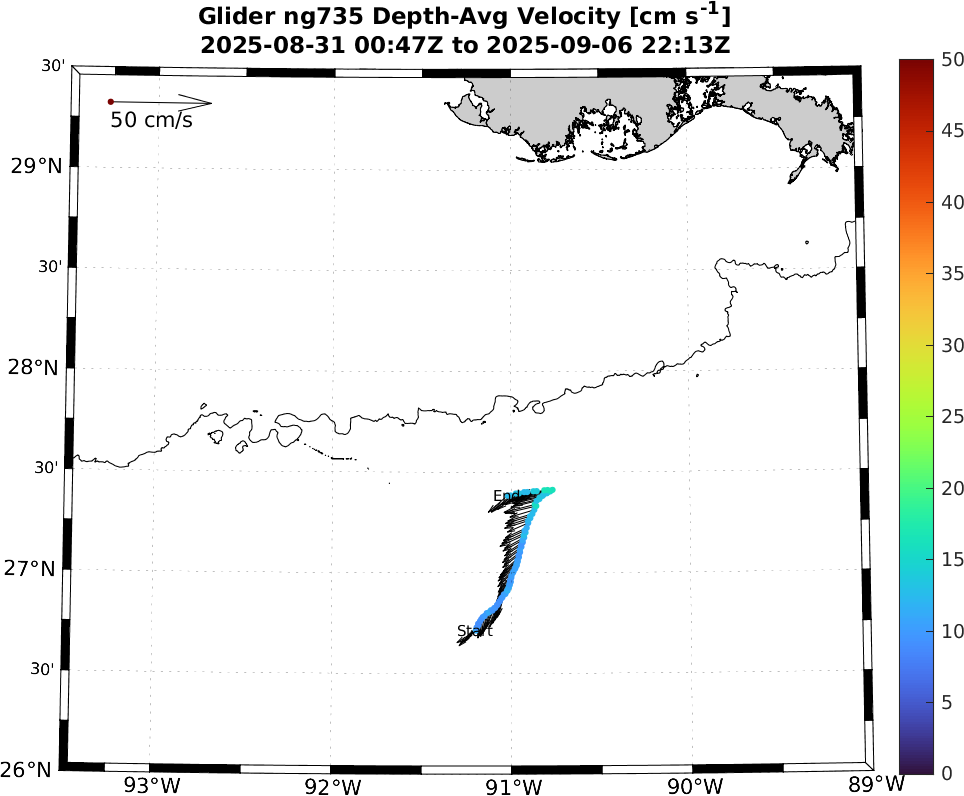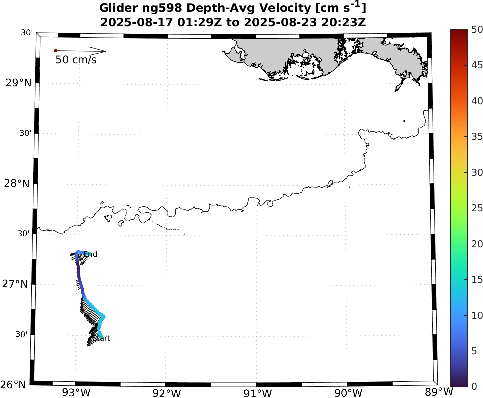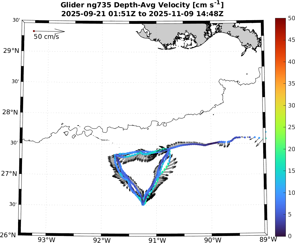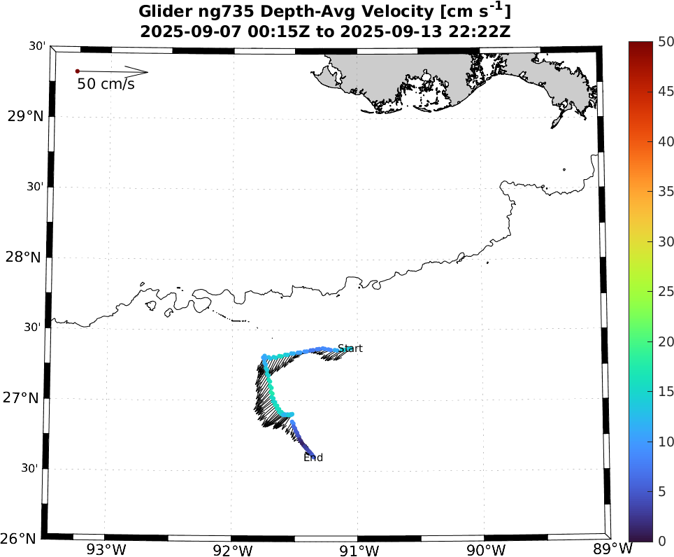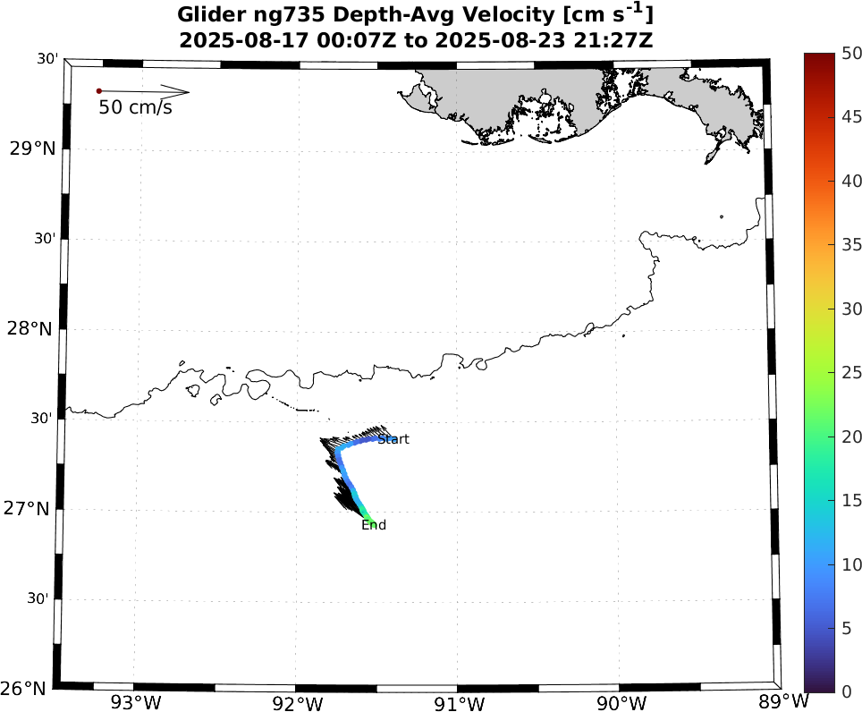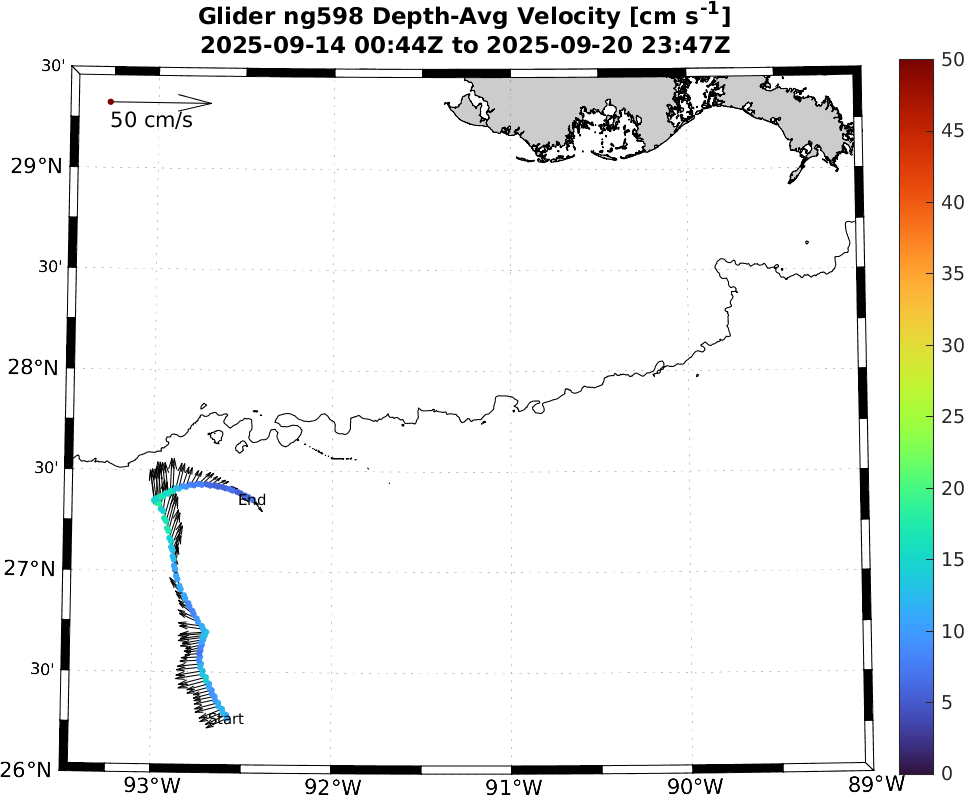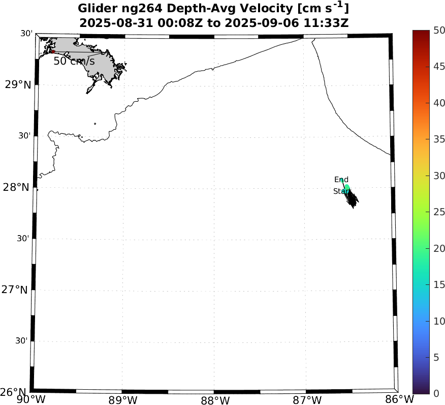 Here we show the depth-averaged velocities (cm/s) for each active glider in the GRASE region. We thank the GRASE glider teams (Rutgers, TAMU, CICESE, etc.) for their glider data.