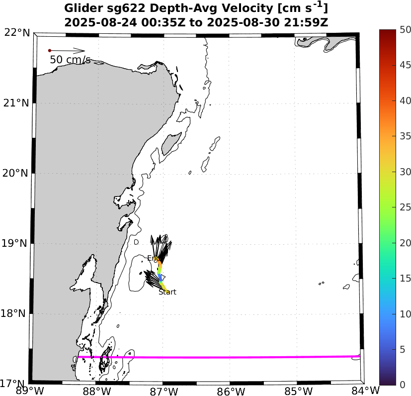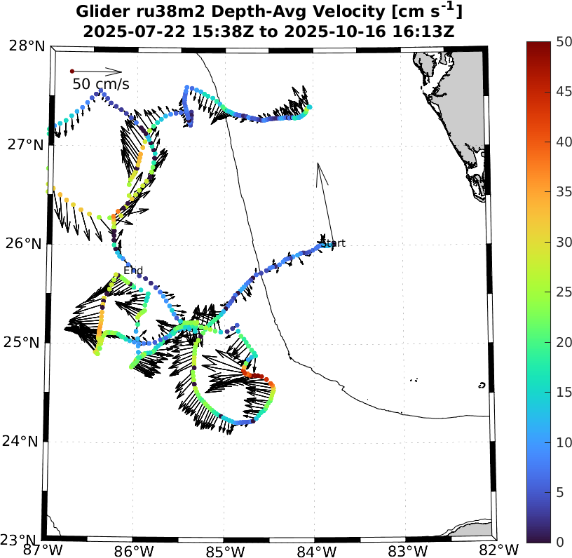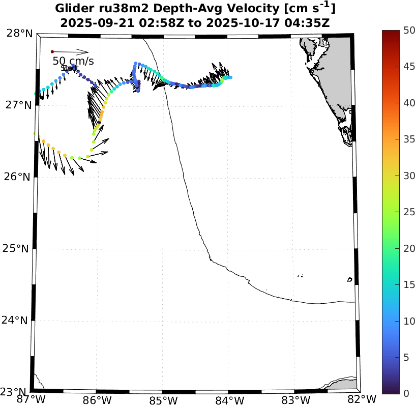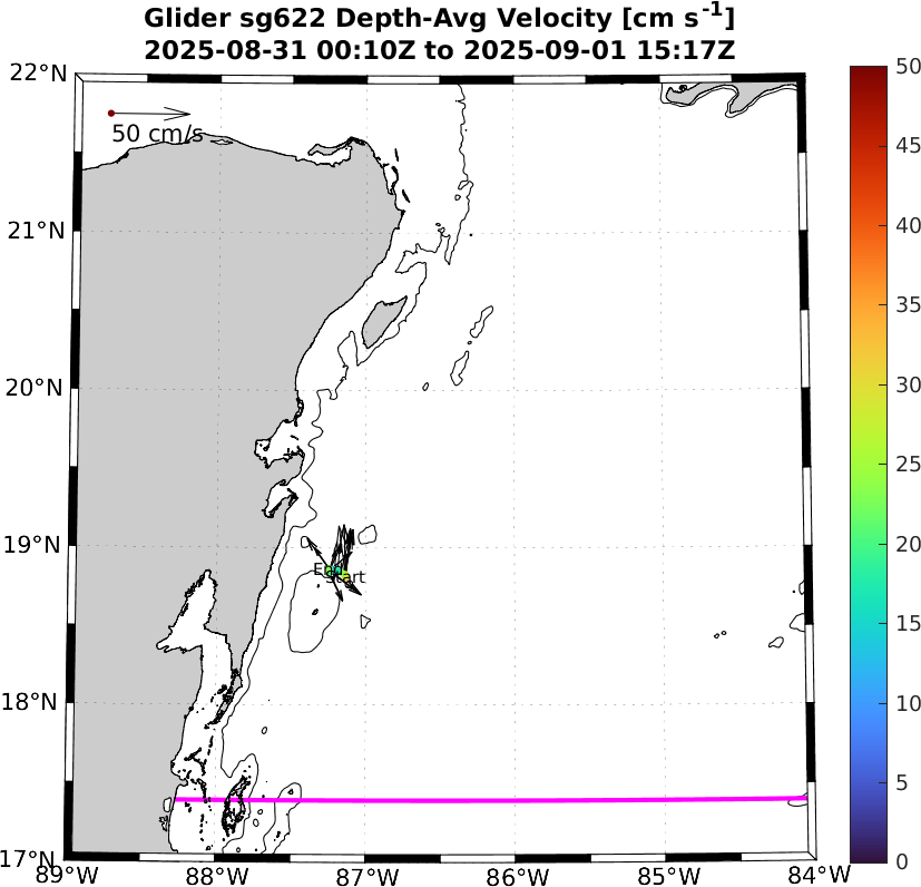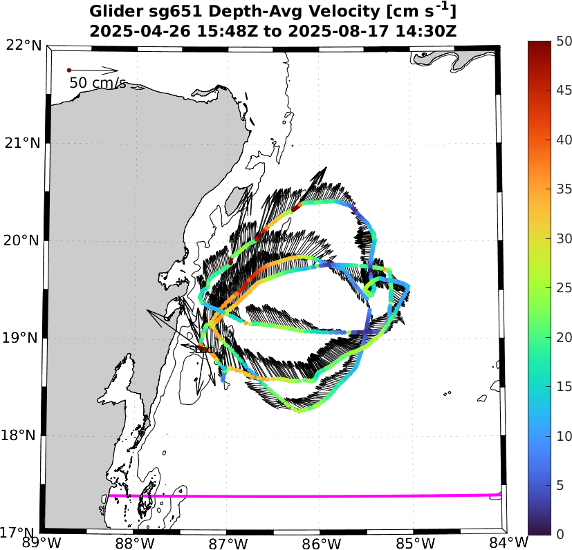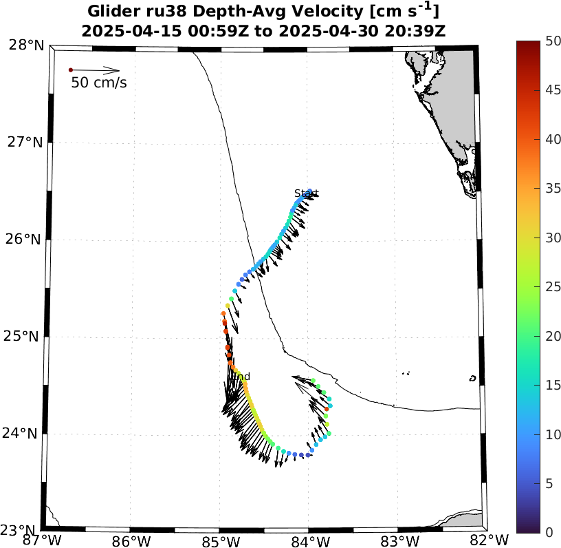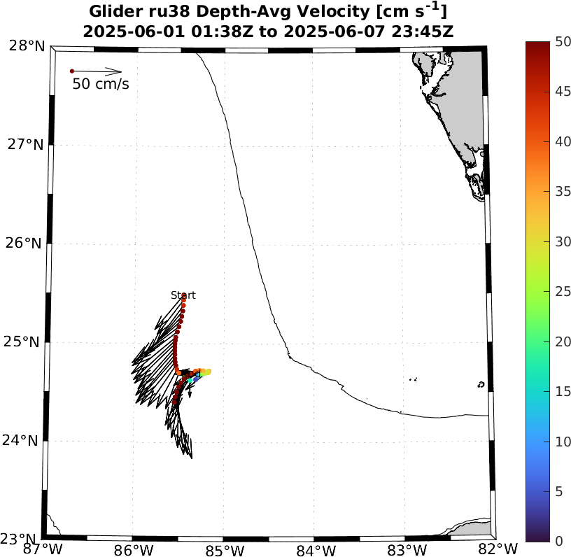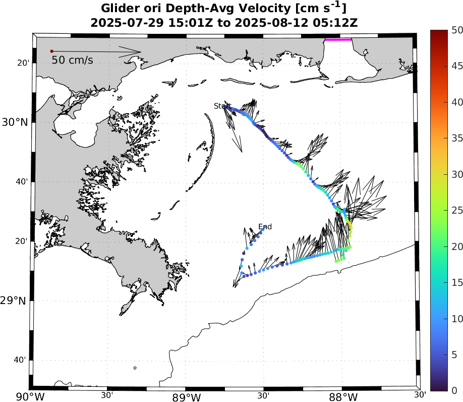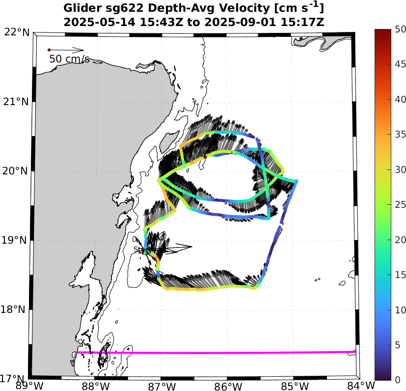 Here we show the depth-averaged velocities (cm/s) for all gliders in the GRASE region. We thank the GRASE glider teams (Rutgers, TAMU, CICESE, etc.) for their glider data.