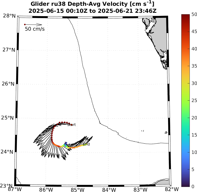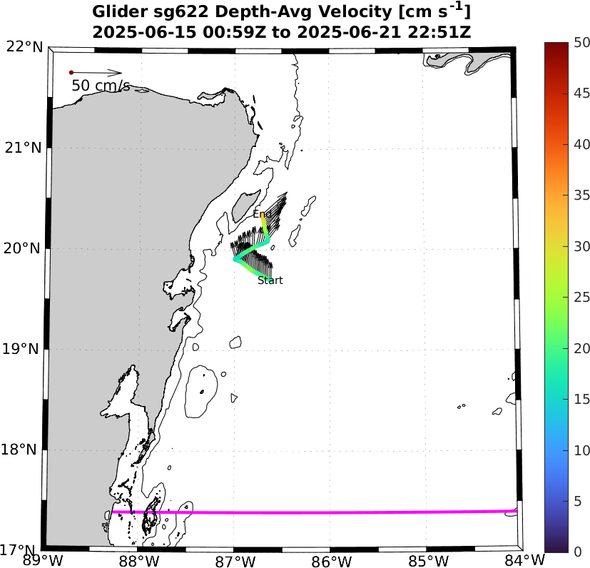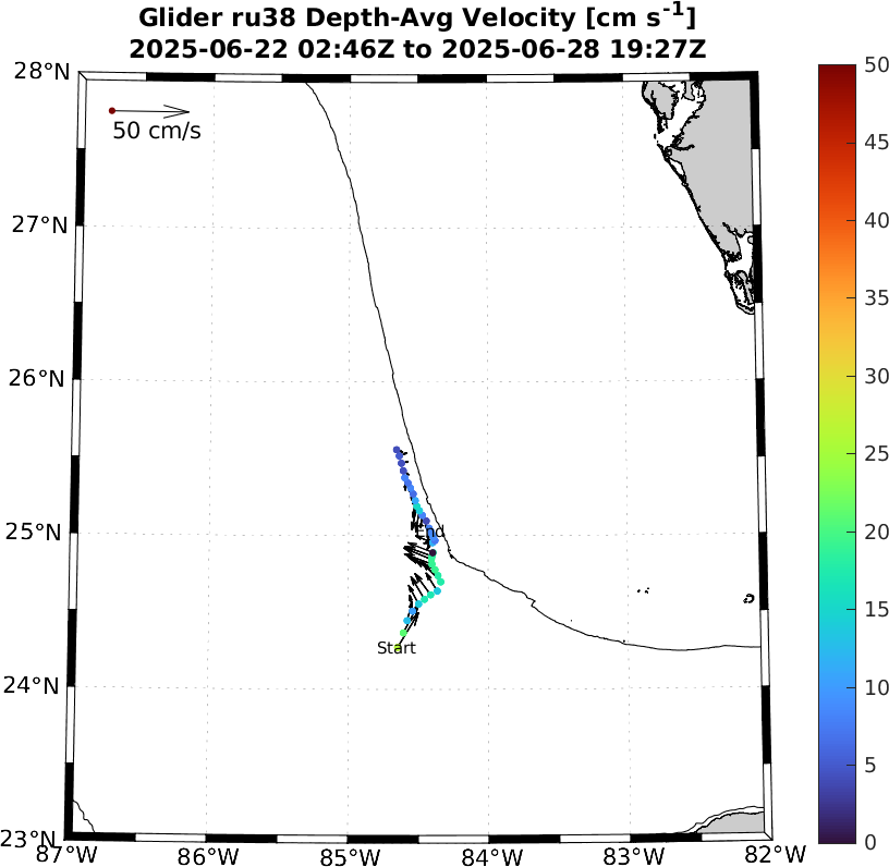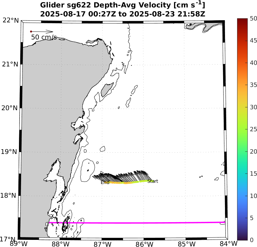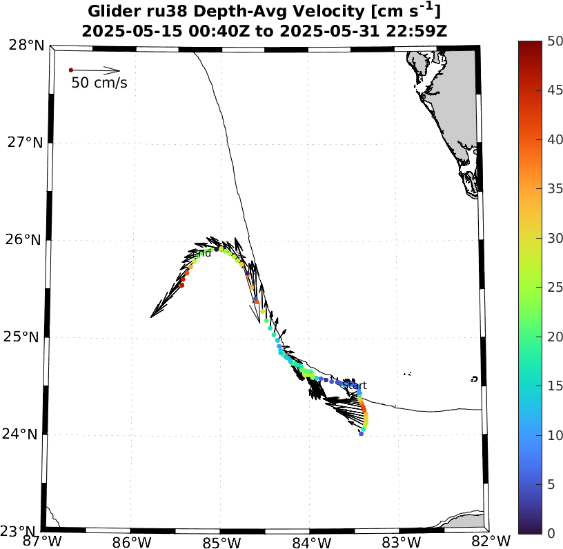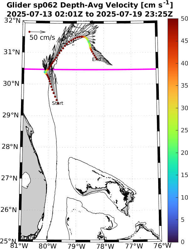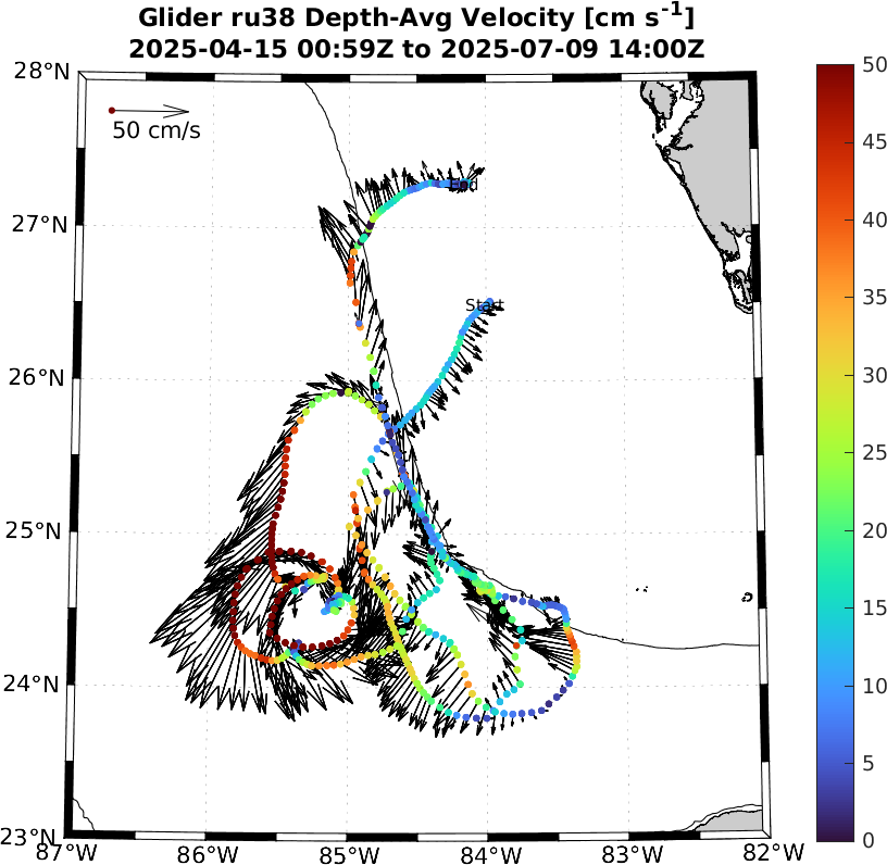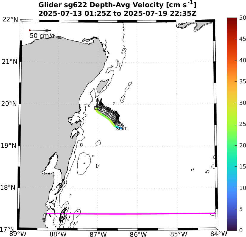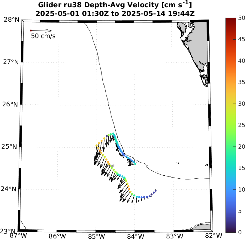 Here we show the depth-averaged velocities (cm/s) for all gliders in the GRASE region. We thank the GRASE glider teams (Rutgers, TAMU, CICESE, etc.) for their glider data.