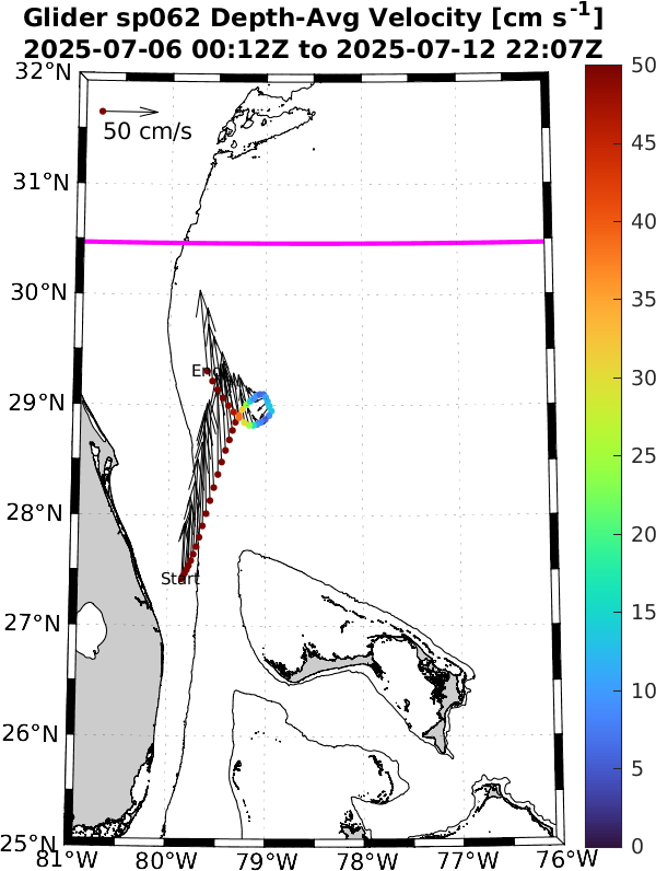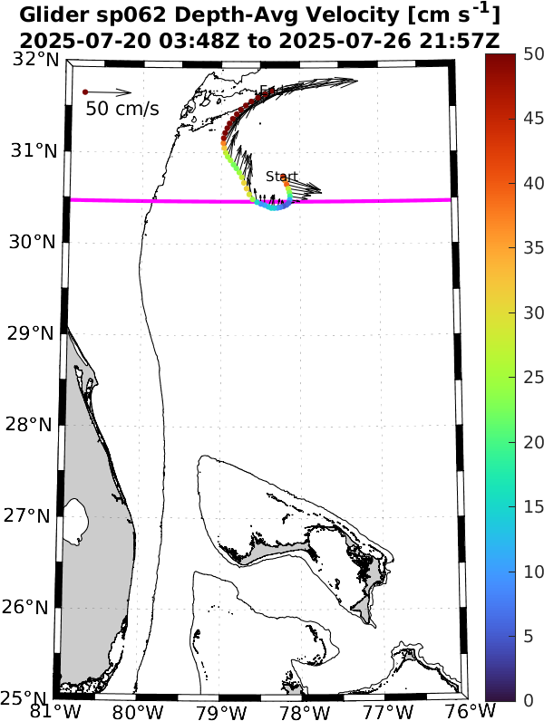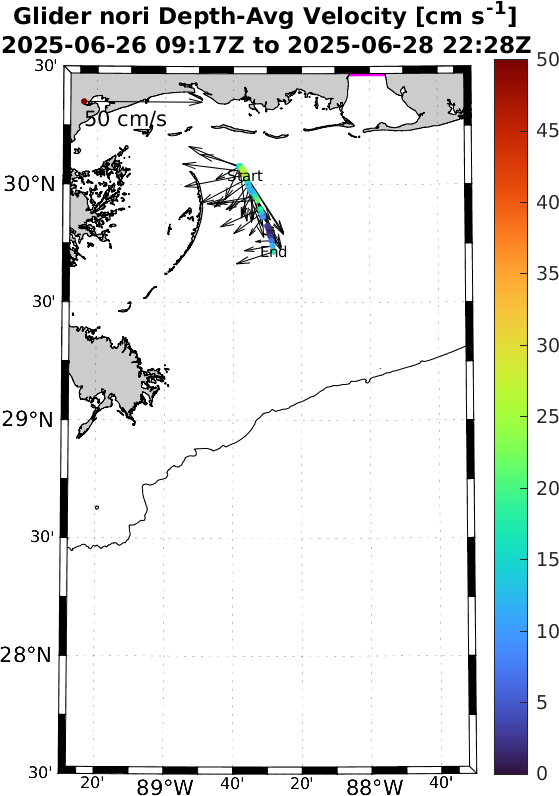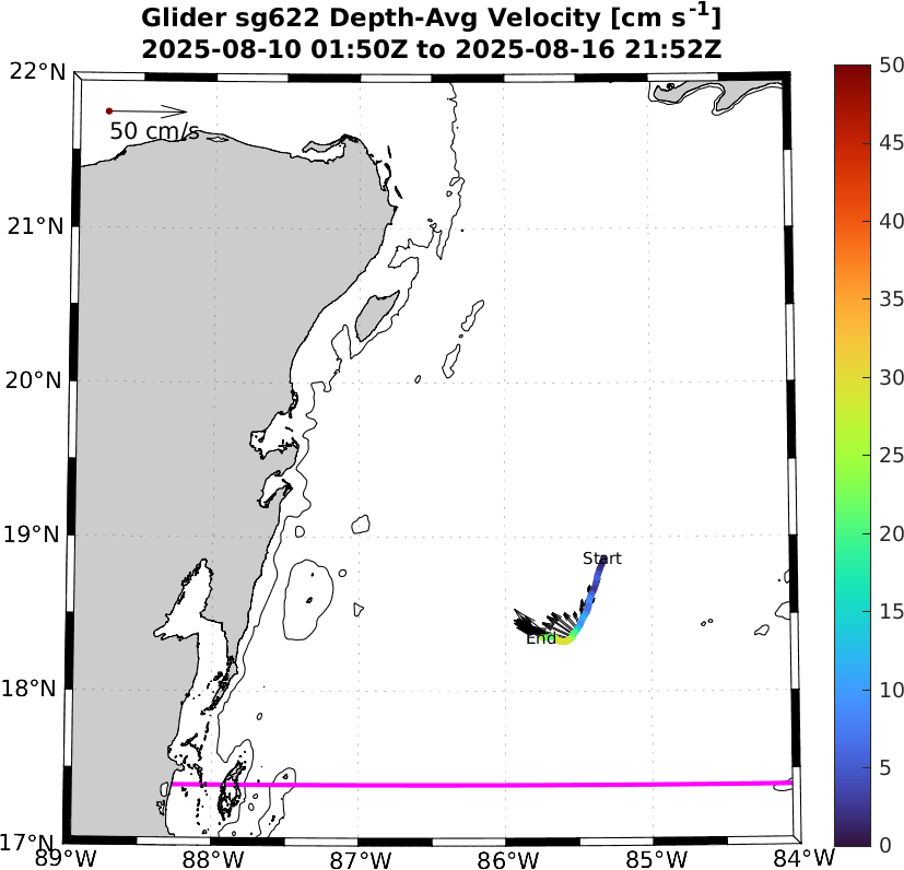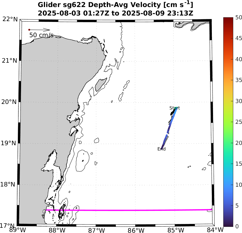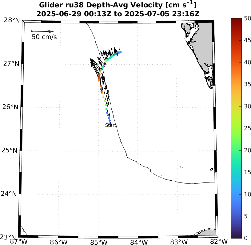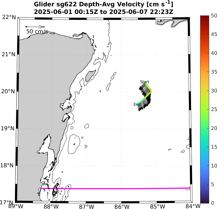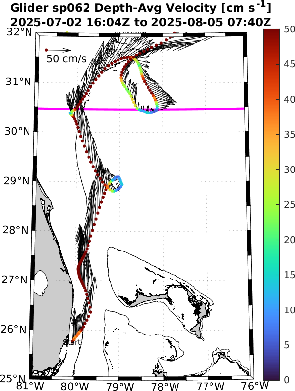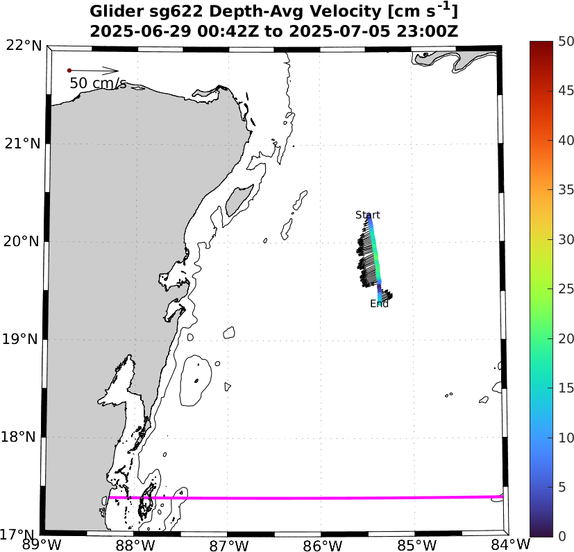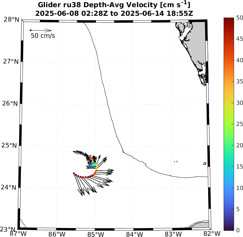 Here we show the depth-averaged velocities (cm/s) for all gliders in the GRASE region. We thank the GRASE glider teams (Rutgers, TAMU, CICESE, etc.) for their glider data.