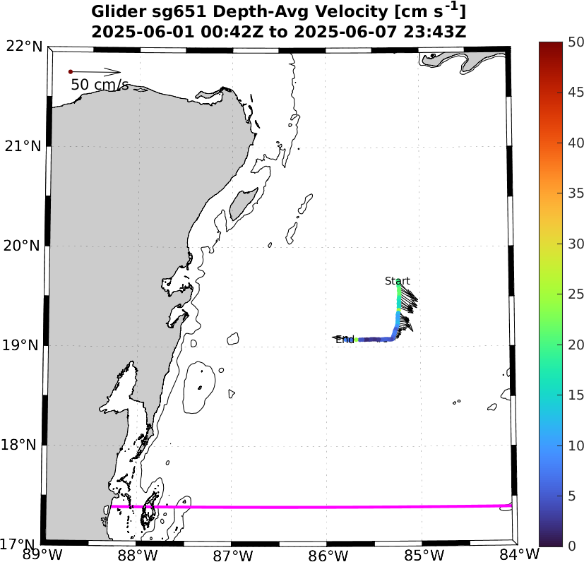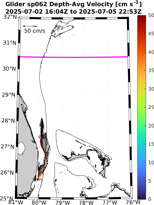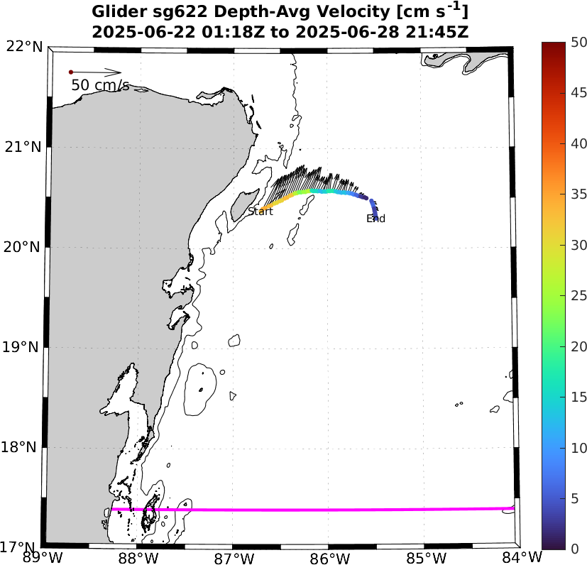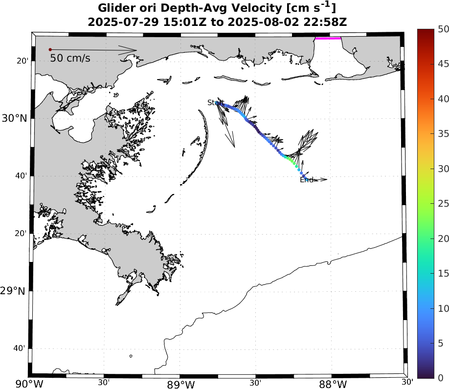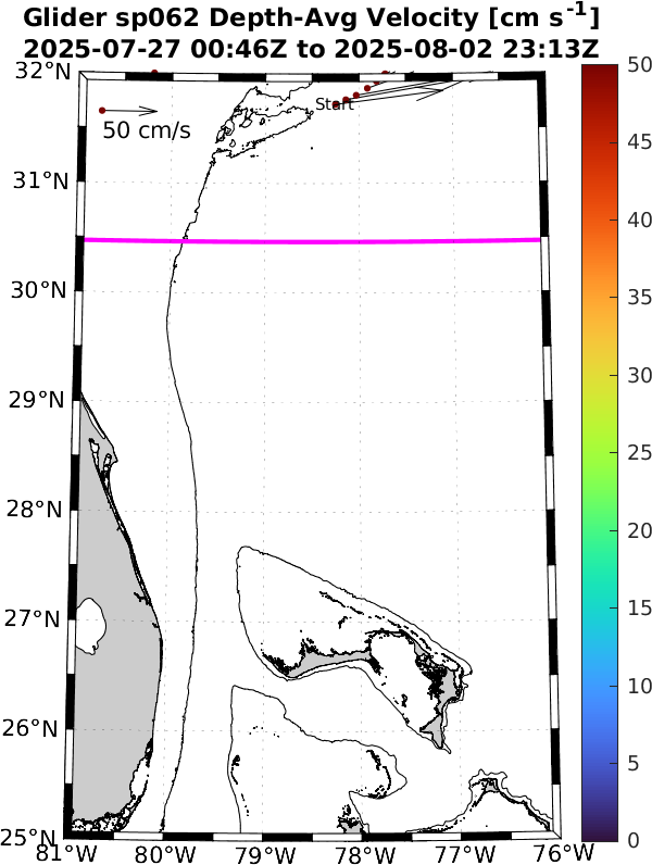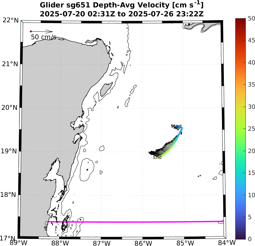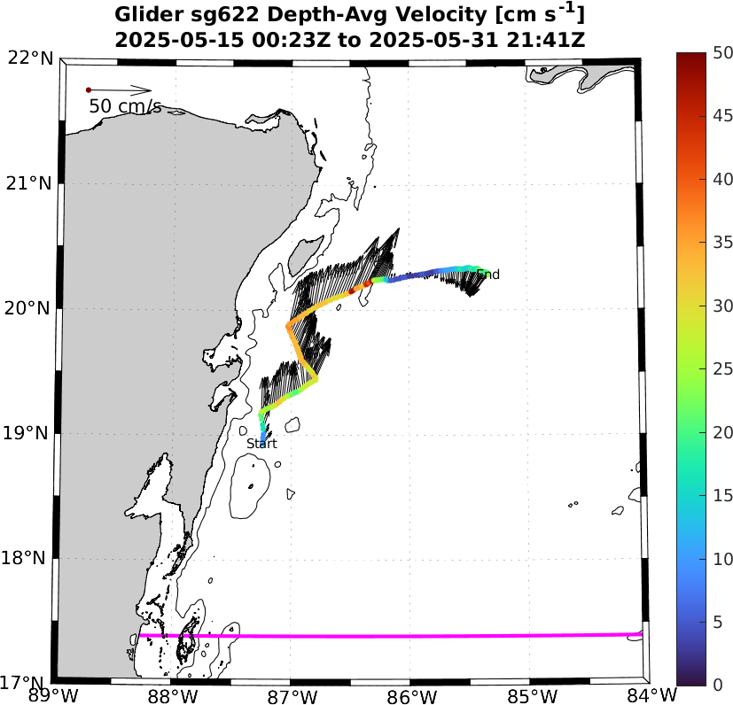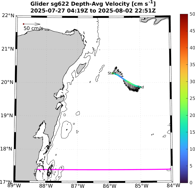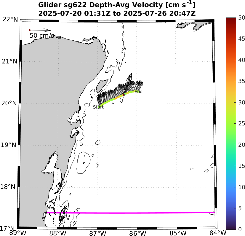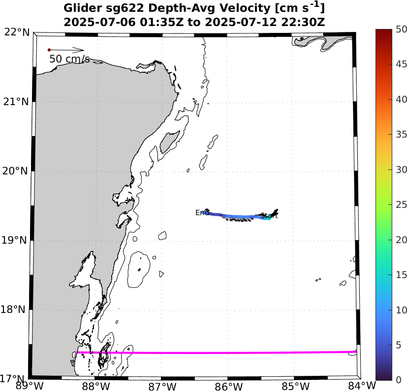 Here we show the depth-averaged velocities (cm/s) for all gliders in the GRASE region. We thank the GRASE glider teams (Rutgers, TAMU, CICESE, etc.) for their glider data.