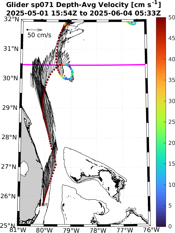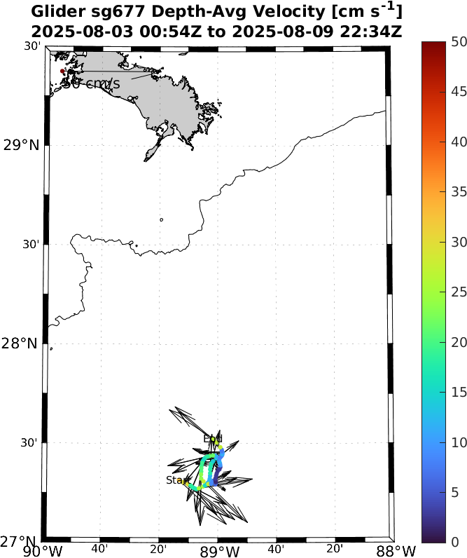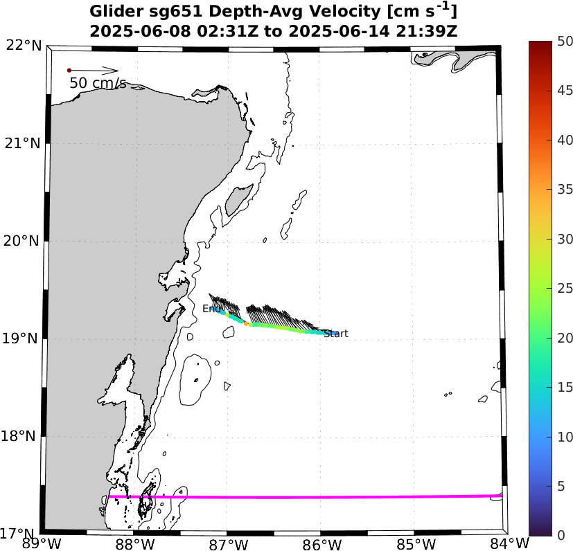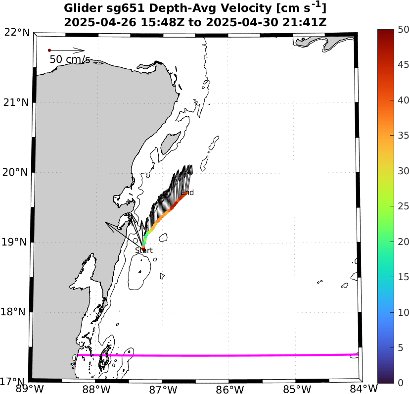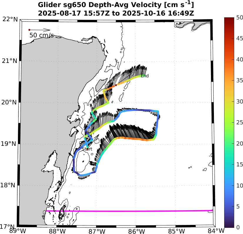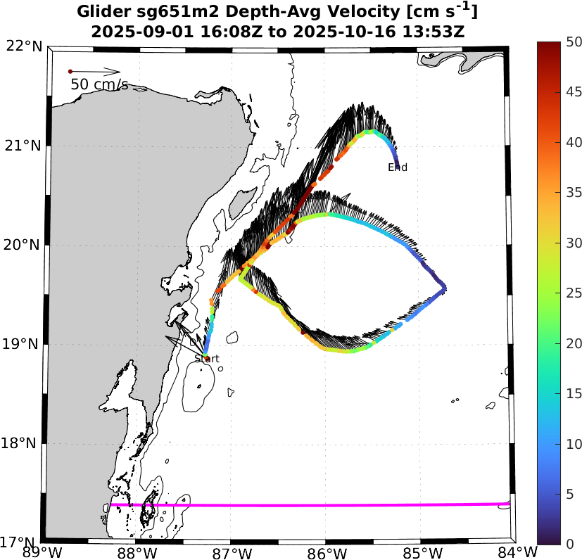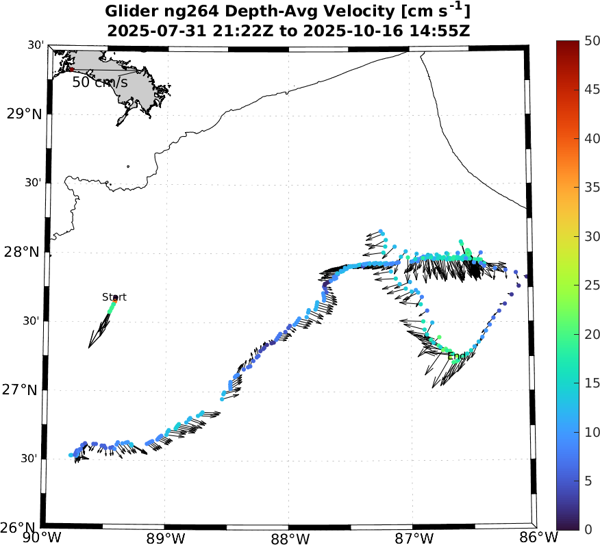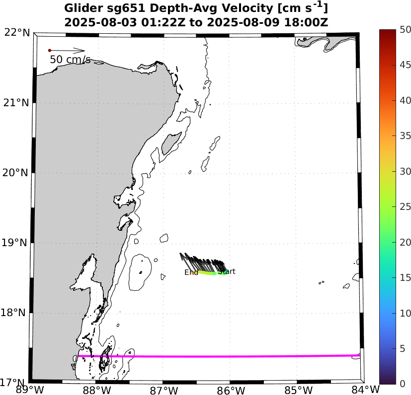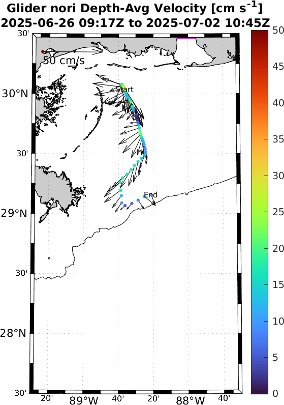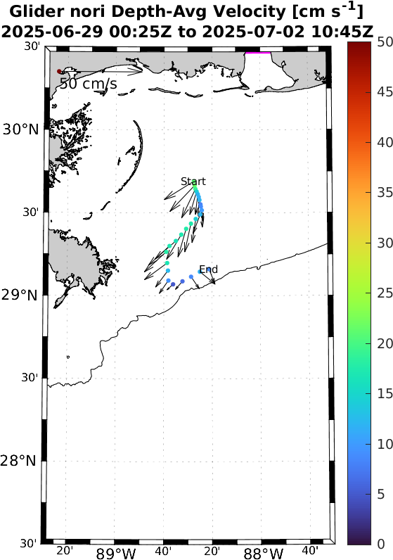 Here we show the depth-averaged velocities (cm/s) for all gliders in the GRASE region. We thank the GRASE glider teams (Rutgers, TAMU, CICESE, etc.) for their glider data.