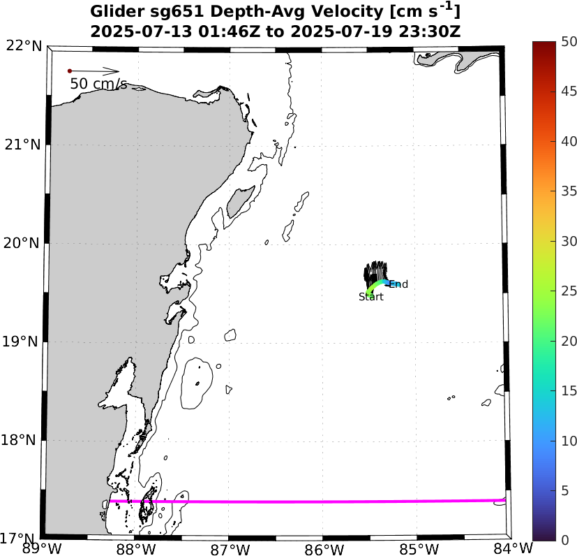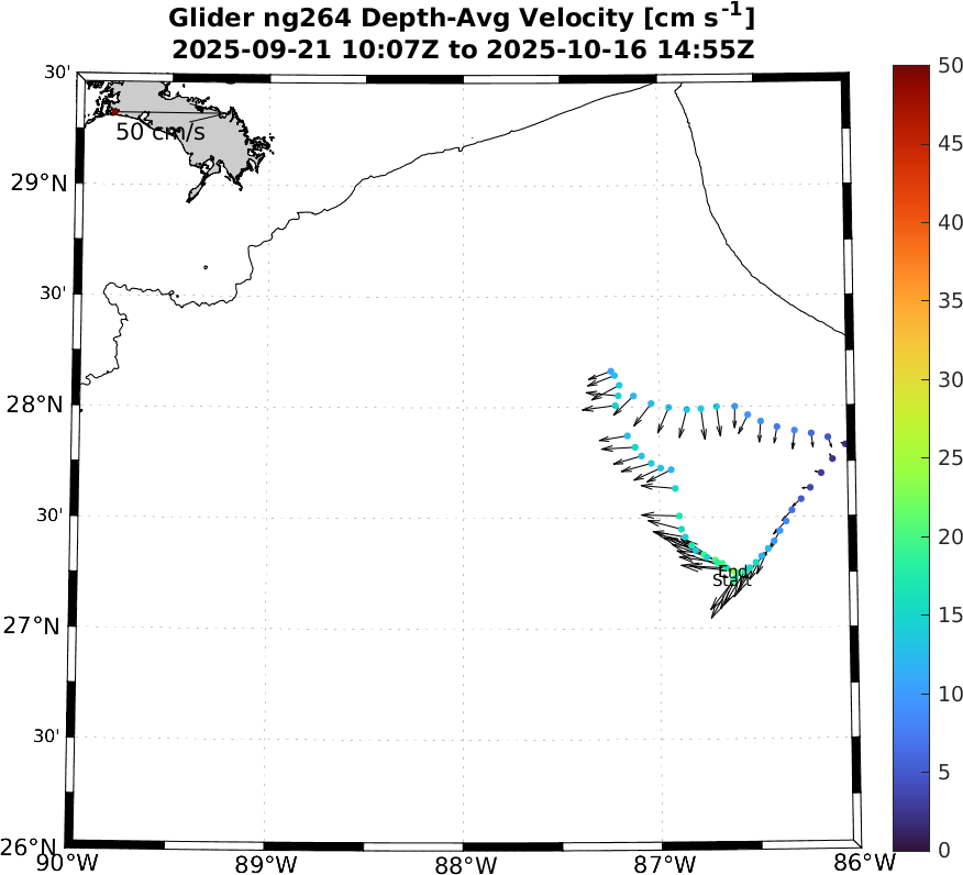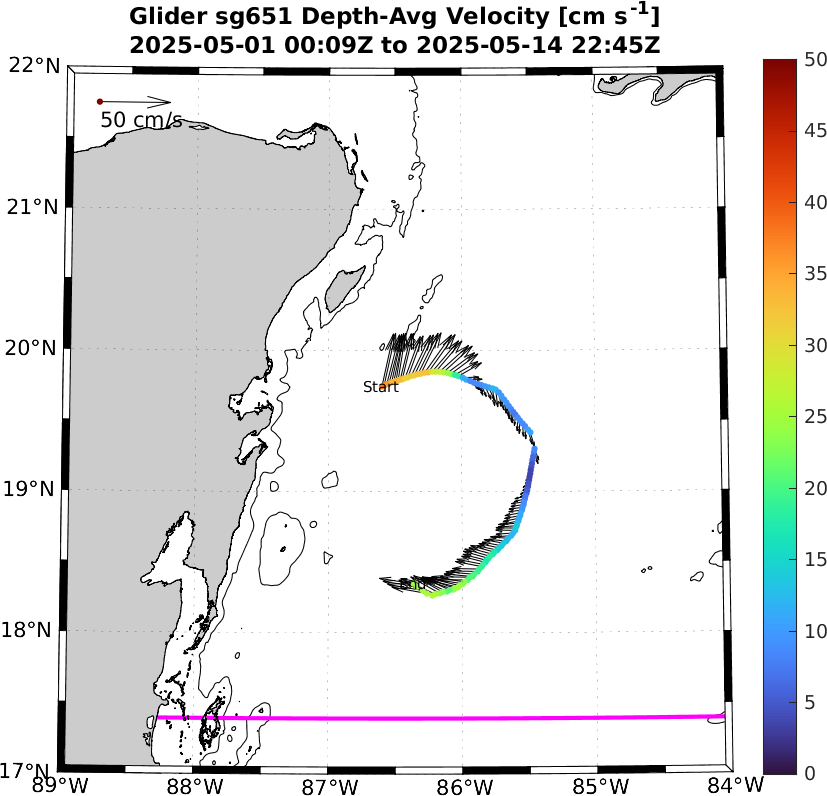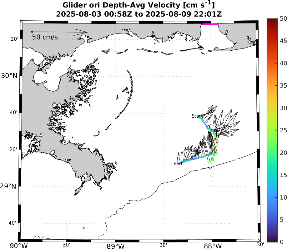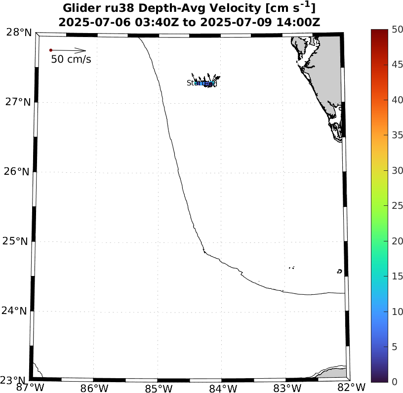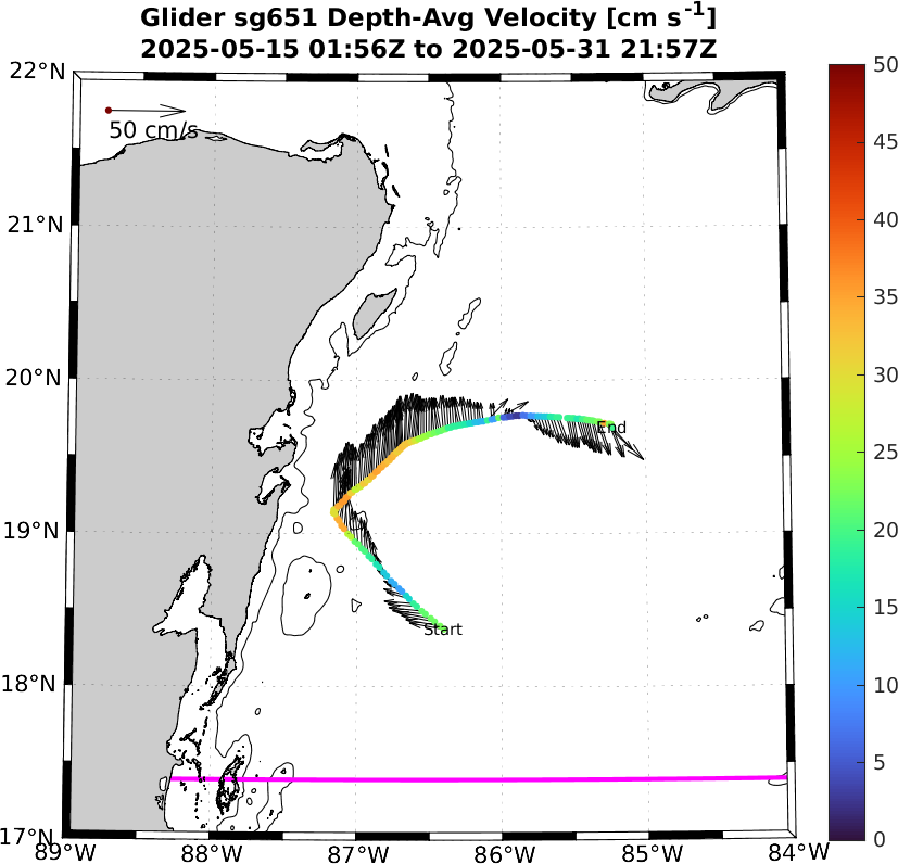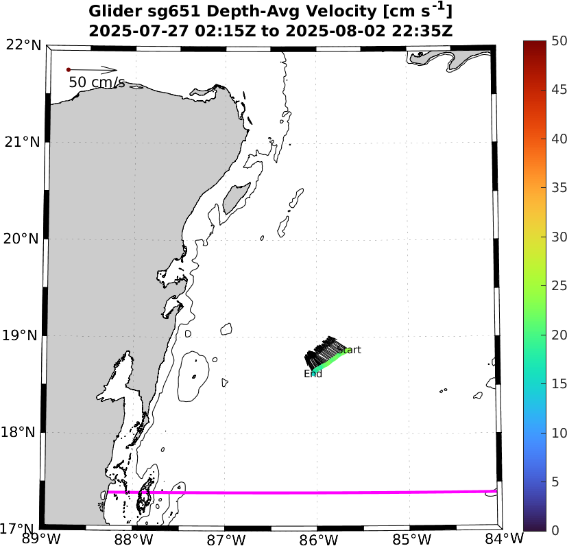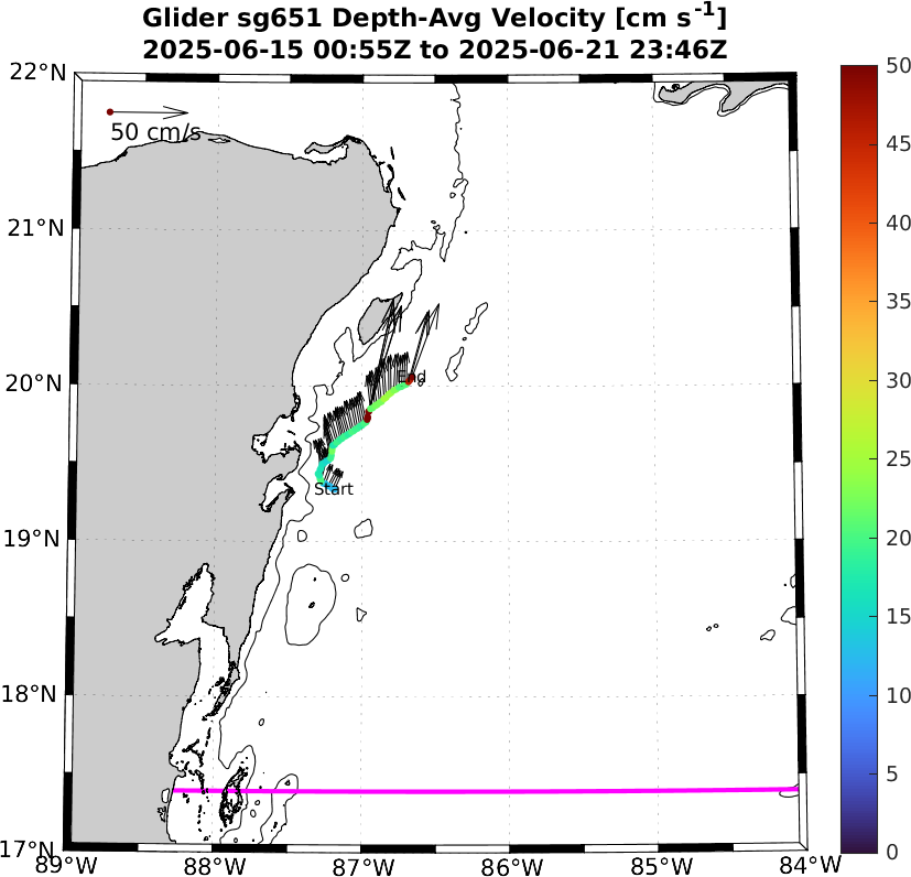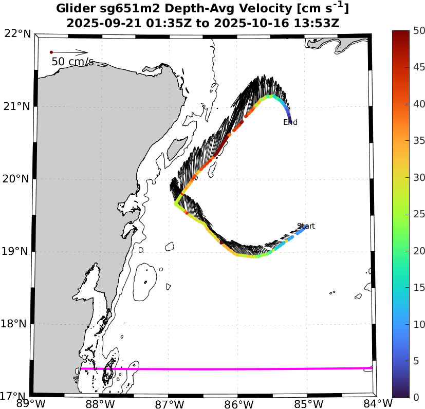 Here we show the depth-averaged velocities (cm/s) for all gliders in the GRASE region. We thank the GRASE glider teams (Rutgers, TAMU, CICESE, etc.) for their glider data.