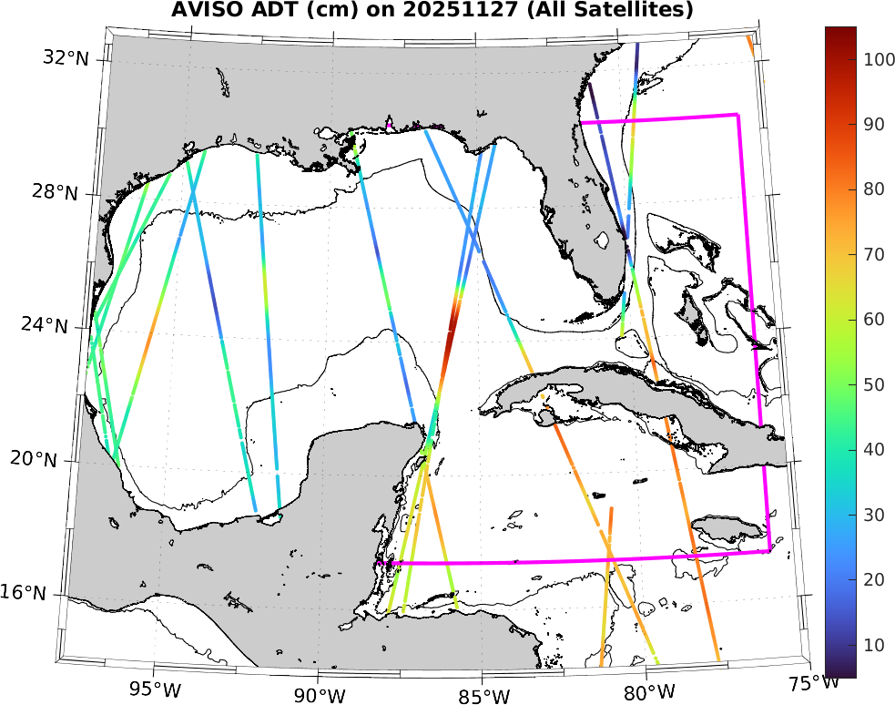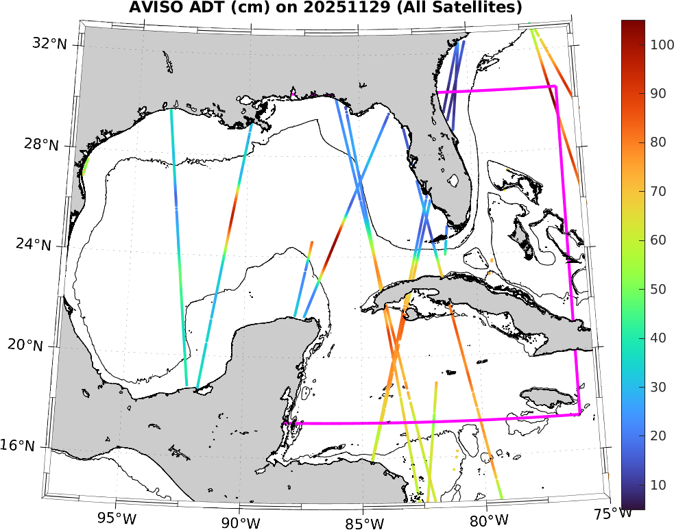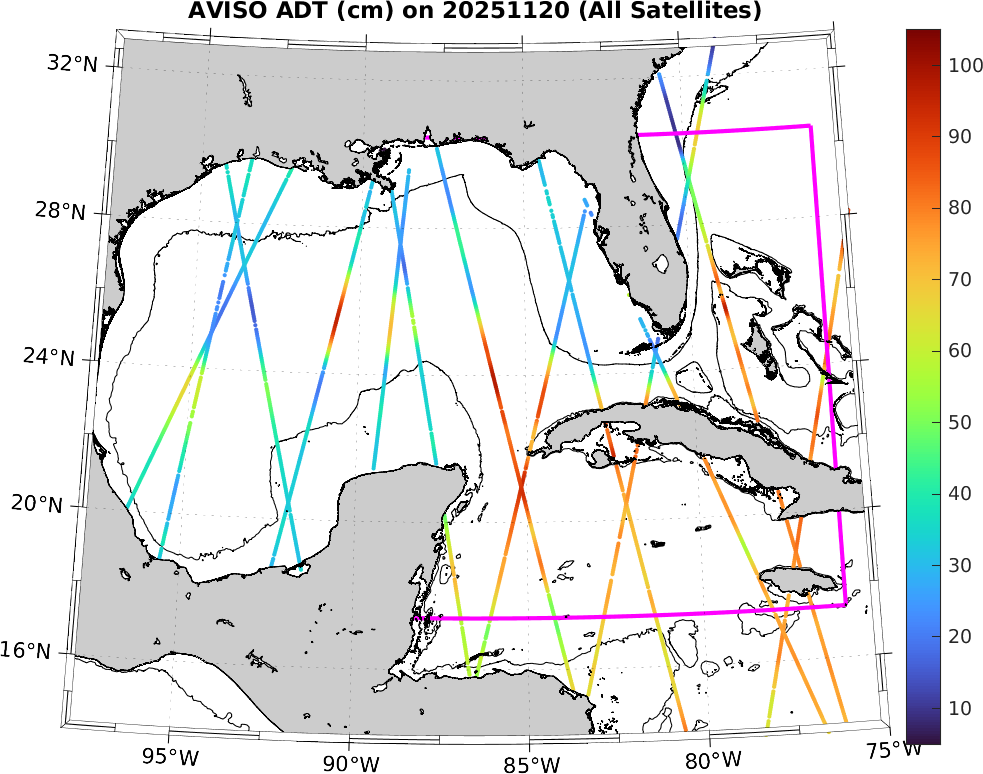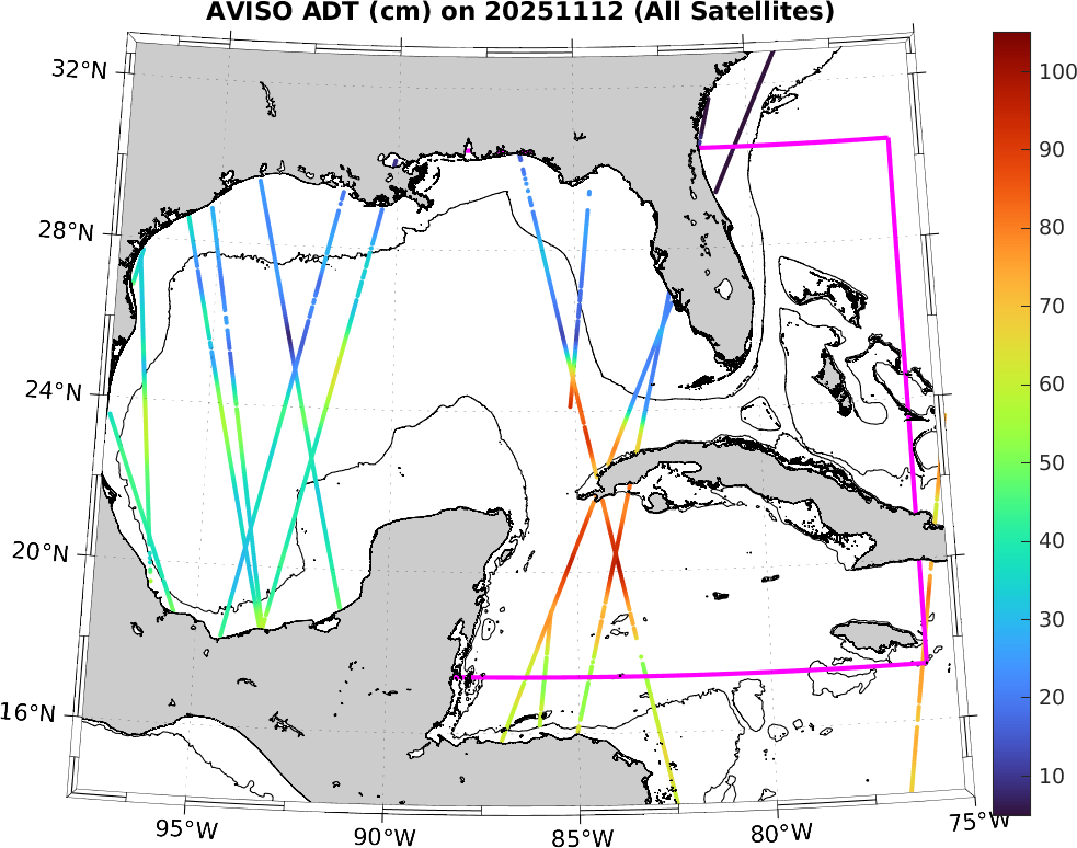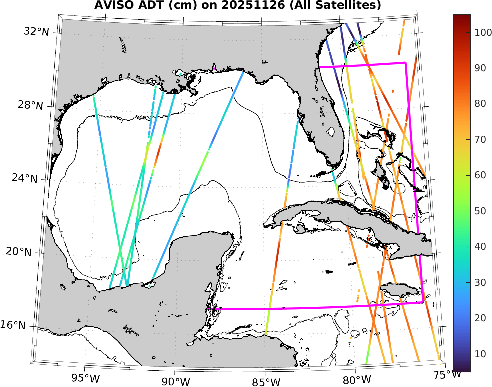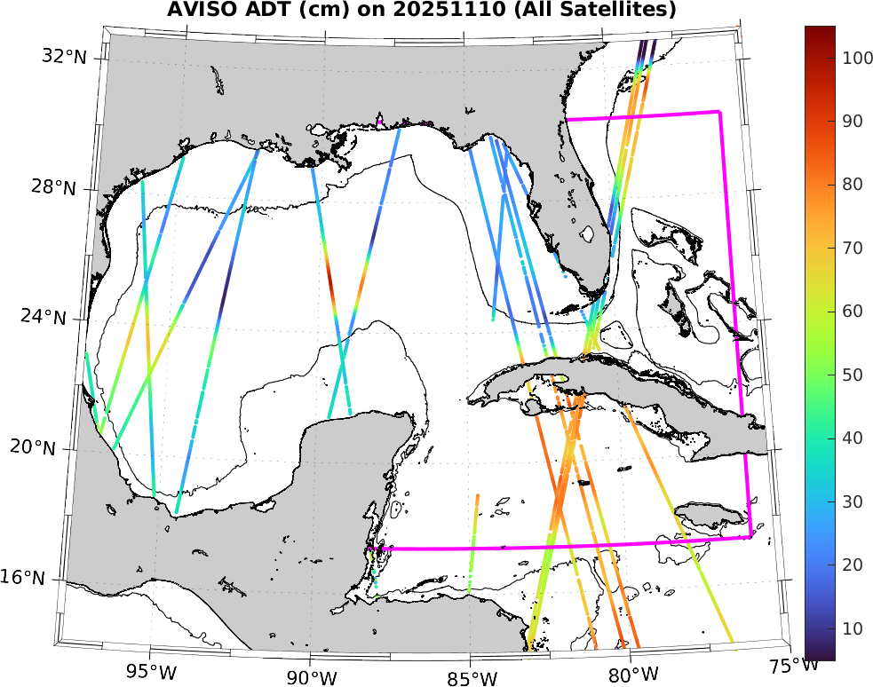 This along-track ADT data includes data from SWOT nadir altimeter, as well as from 7 other satellites: SARAL-DP/AltiKa, CryoSat-2, Haiyang-2A, Jason-3, Sentinel-3A, Sentinel-3B, and Sentinel-6A. It is processed by DUACS and distributed by CMEMS. All track data has no tides and is 7km apart; plots shown attempt to respect this width. Model η and ∇η should, in theory, match the ADT shown here (in practice η may only match up to a constant).