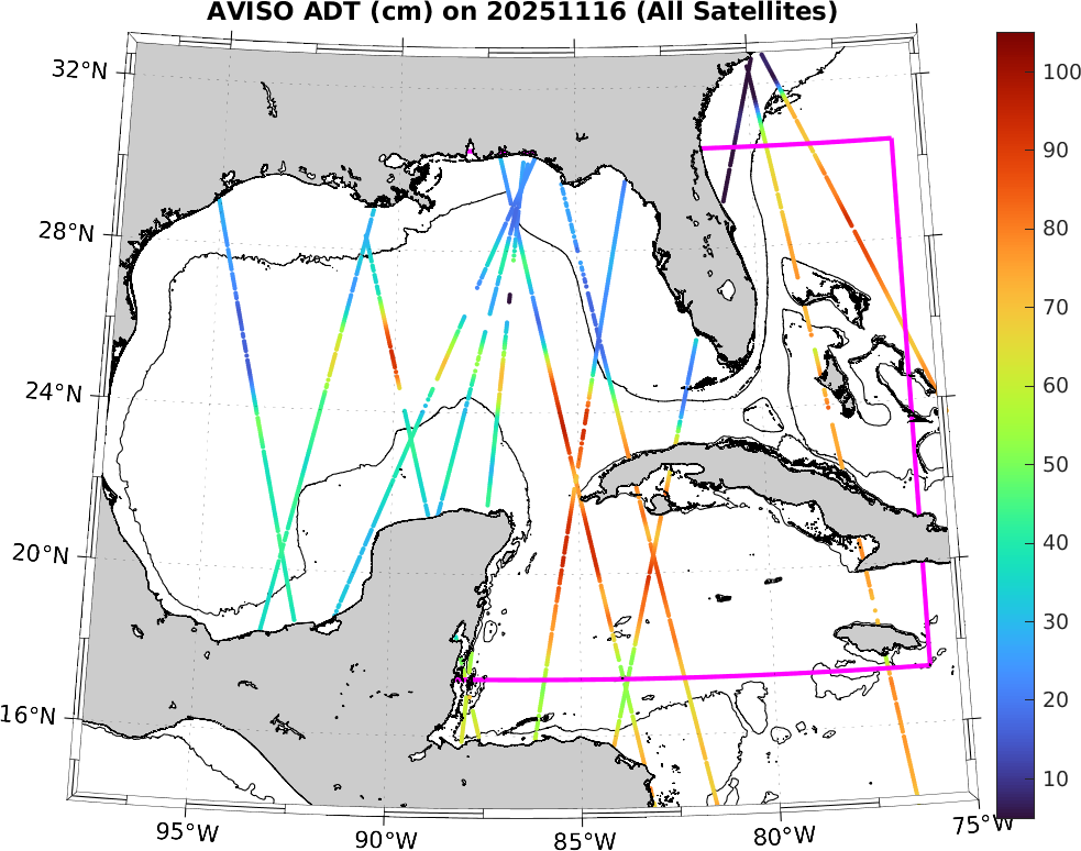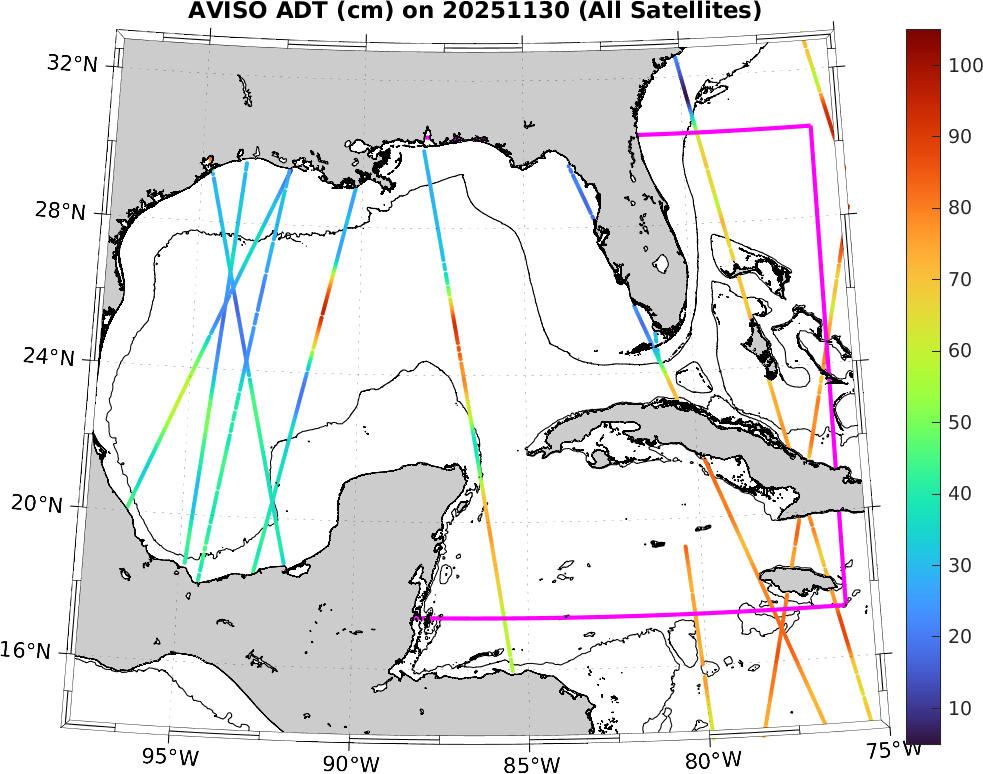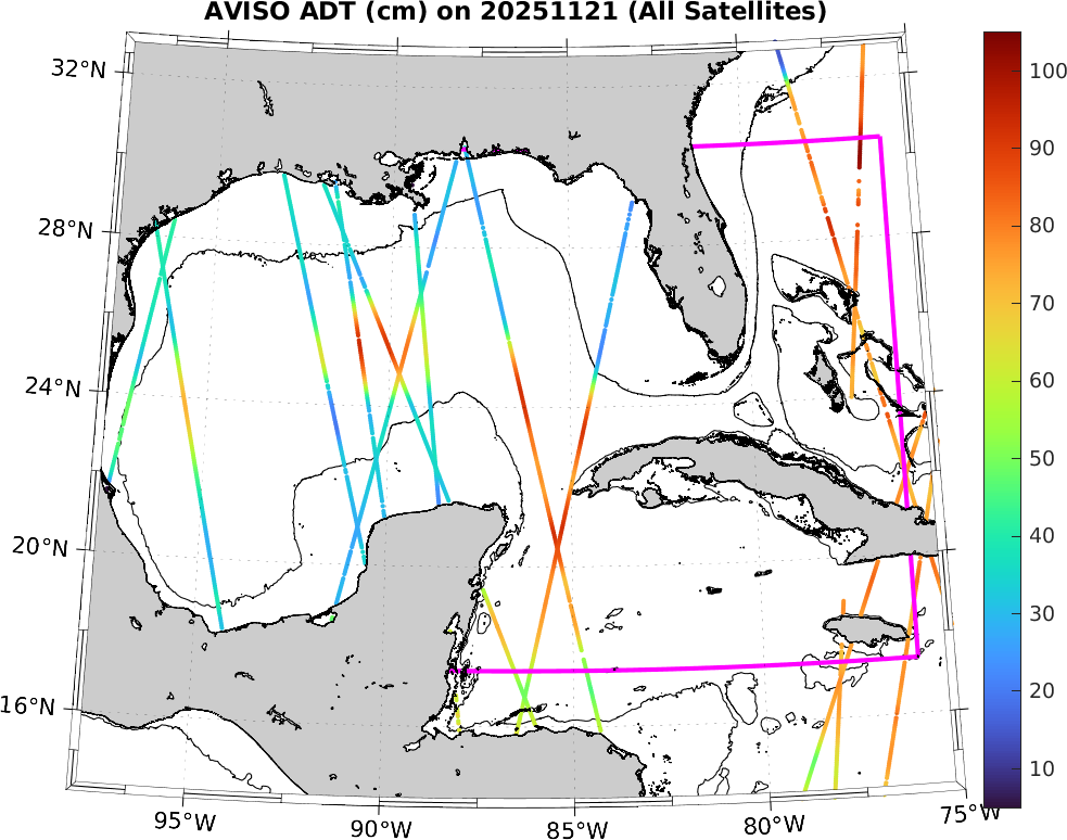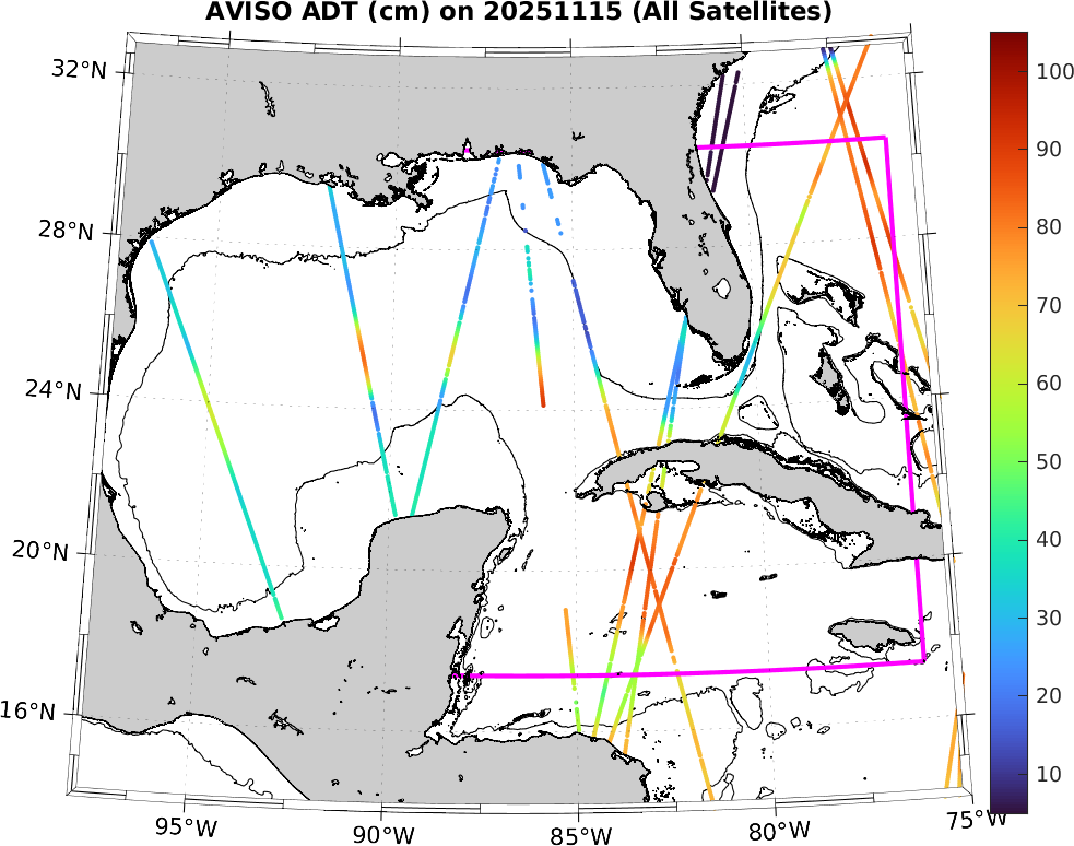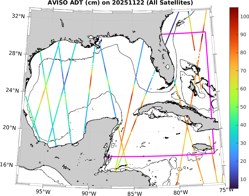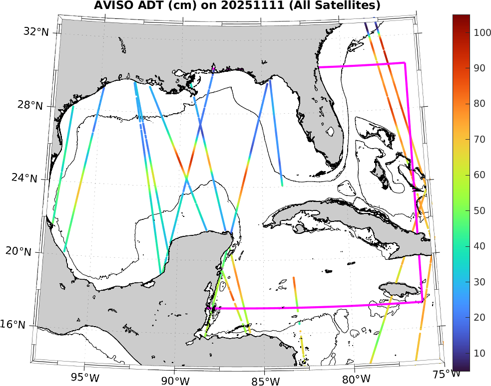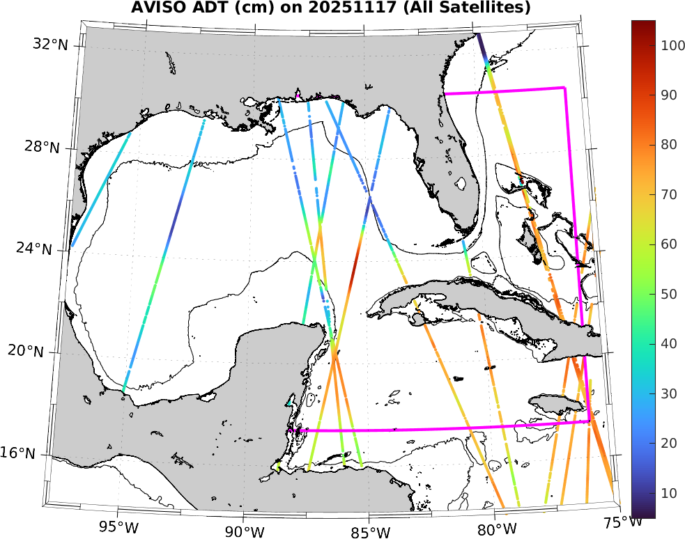 This along-track ADT data includes data from SWOT nadir altimeter, as well as from 7 other satellites: SARAL-DP/AltiKa, CryoSat-2, Haiyang-2A, Jason-3, Sentinel-3A, Sentinel-3B, and Sentinel-6A. It is processed by DUACS and distributed by CMEMS. All track data has no tides and is 7km apart; plots shown attempt to respect this width. Model η and ∇η should, in theory, match the ADT shown here (in practice η may only match up to a constant).