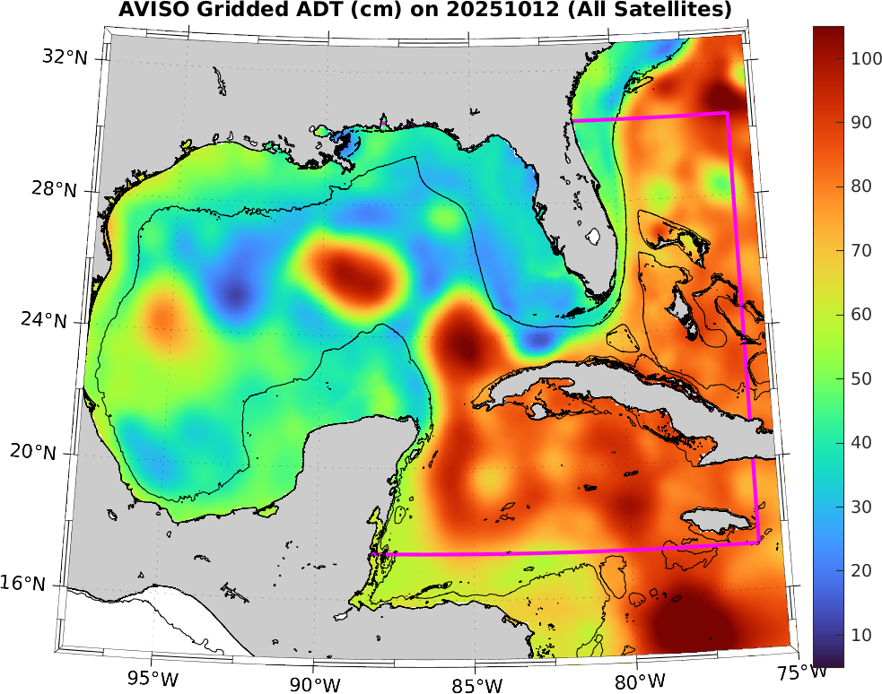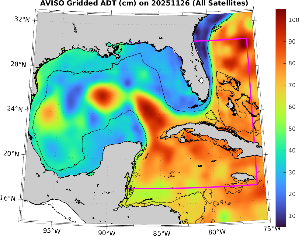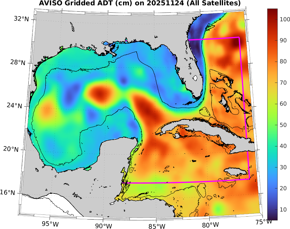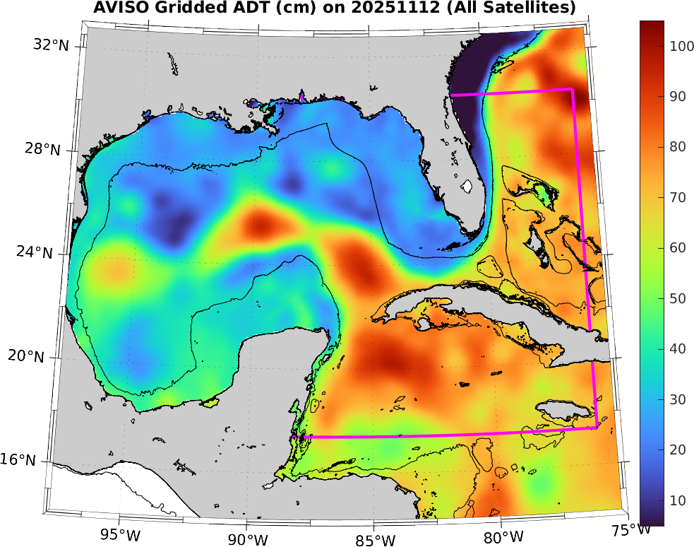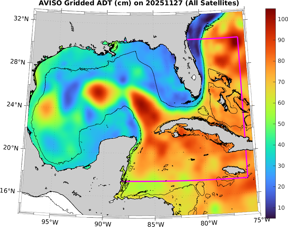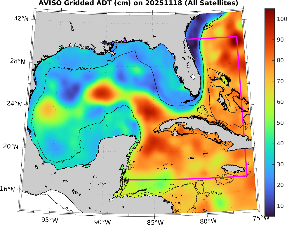 This OI-mapped product takes ADT data from the SWOT nadir altimeter, as well as from 7 other satellites: SARAL-DP/AltiKa, CryoSat-2, Haiyang-2A, Jason-3, Sentinel-3A, Sentinel-3B, and Sentinel-6A, and uses tracks from all days from 7 weeks before the synoptic date to the synoptic date. It may include other sources like Argo. This product is processed by DUACS and distributed by CMEMS. Model η and ∇η should, in theory, match the ADT shown here (in practice η may only match up to a constant).