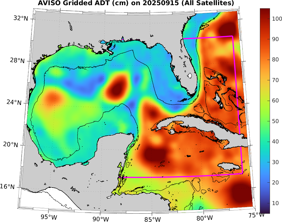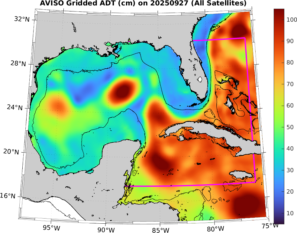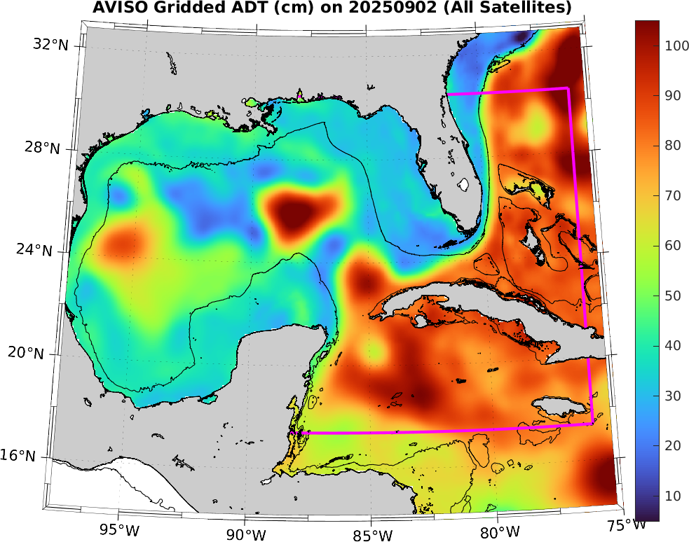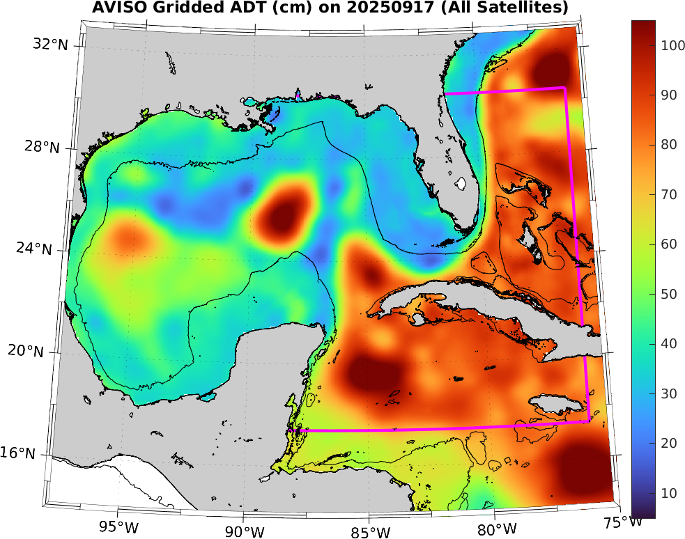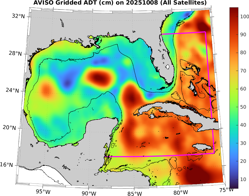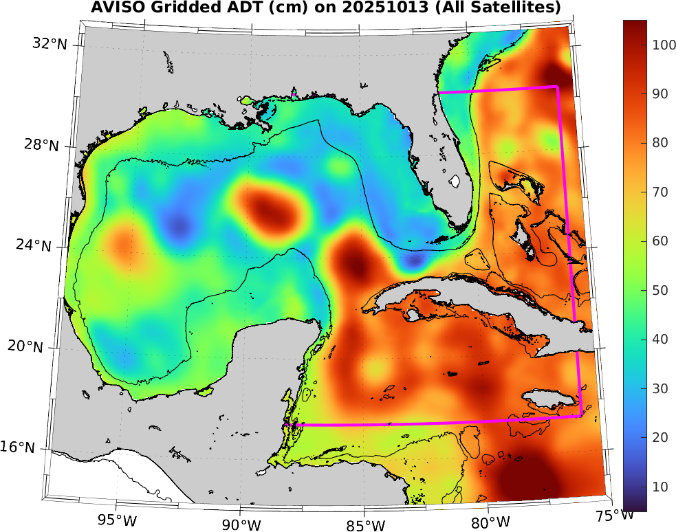 This OI-mapped product takes ADT data from the SWOT nadir altimeter, as well as from 7 other satellites: SARAL-DP/AltiKa, CryoSat-2, Haiyang-2A, Jason-3, Sentinel-3A, Sentinel-3B, and Sentinel-6A, and uses tracks from all days from 7 weeks before the synoptic date to the synoptic date. It may include other sources like Argo. This product is processed by DUACS and distributed by CMEMS. Model η and ∇η should, in theory, match the ADT shown here (in practice η may only match up to a constant).