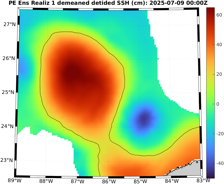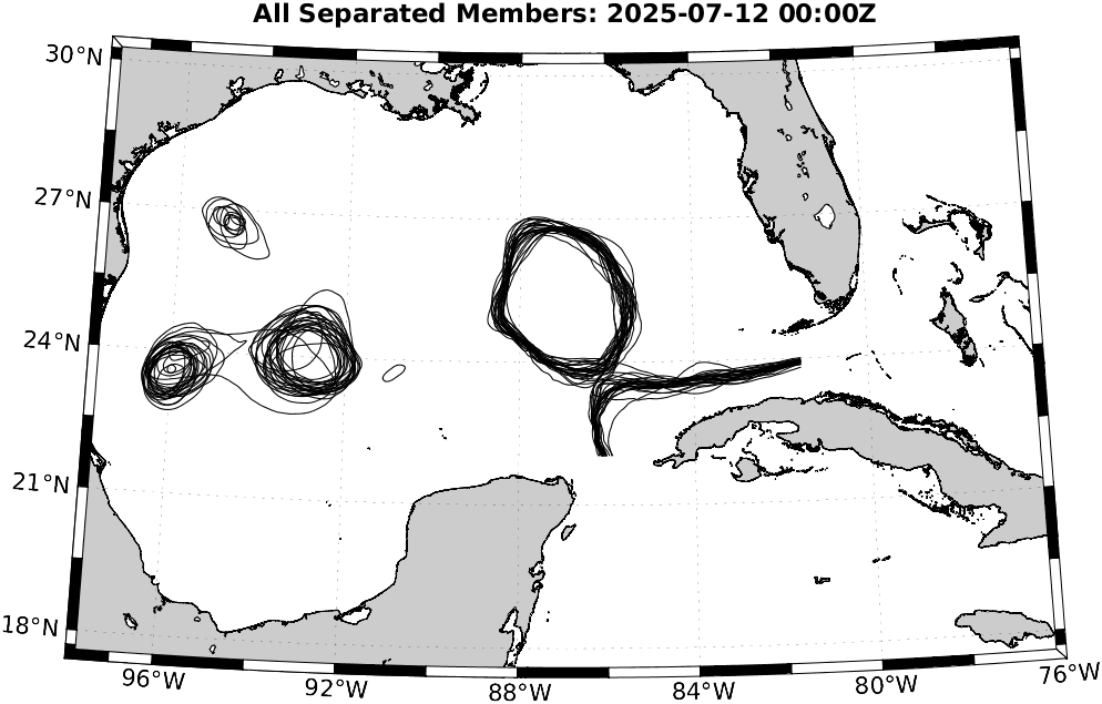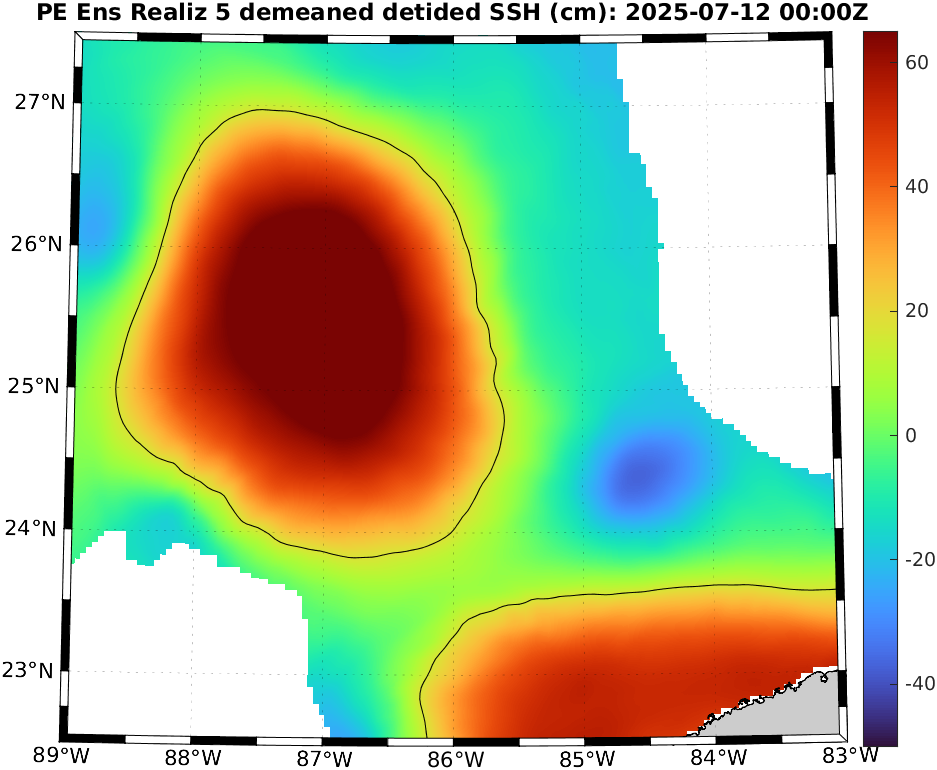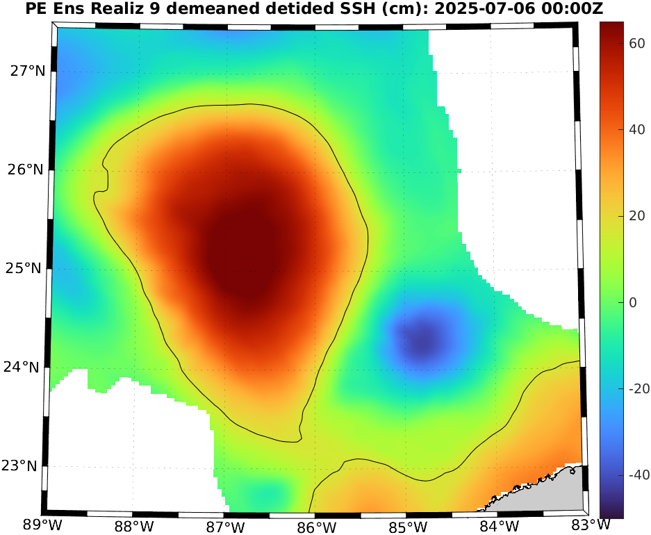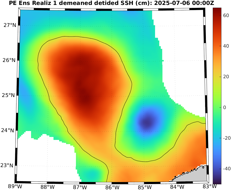 To define eddies, we used the 17 cm de-tided SSH contour in the deeper Gulf [Dukhovskoy et al., 2015]. Hence, for reach realization, we de-tide the SSH field and de-mean it over the region north of 22°N, west of 81.5°W, and deeper than 200 m (i.e., considering only the deep waters in the Gulf). We then extract the 17 cm contours of the resulting field, highlighting the locations of the LC and LCEs. To identify possible new LCE separation, we eliminate eddy remnants in the western Gulf by restricting to the region between 22.5°N and 27.5°N and between 89°W and 83°W. If a closed contour with an arclength of at least 200 km is fully contained in this region, this can indicate LCE detachment. We finally examine these realizations and count the number of LCE detachments.
