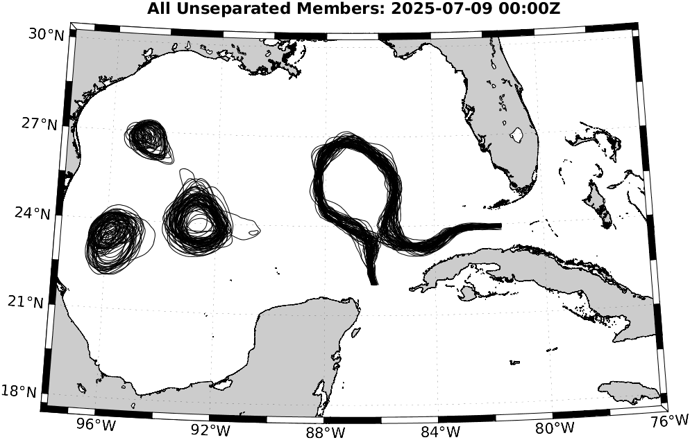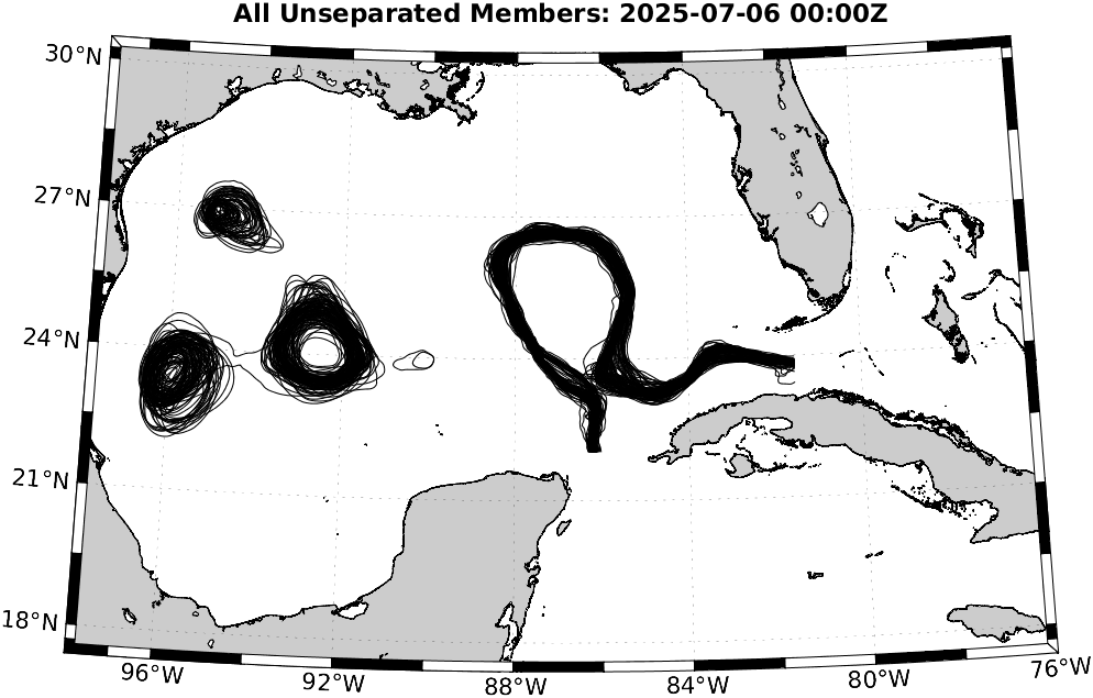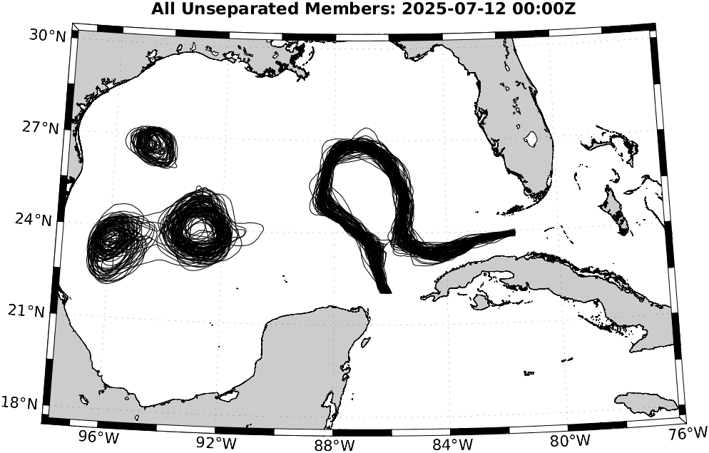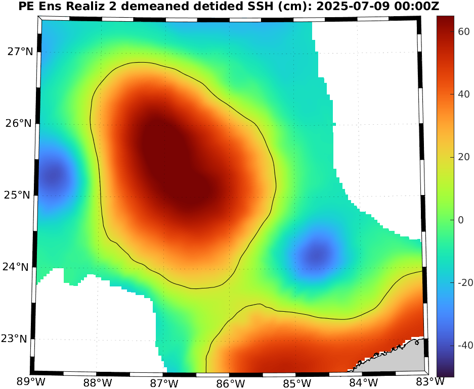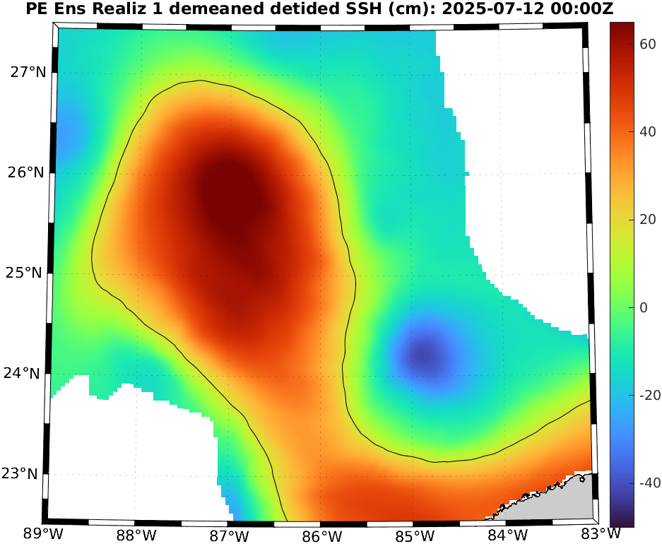 To define eddies, we used the 17 cm de-tided SSH contour in the deeper Gulf [Dukhovskoy et al., 2015]. Hence, for reach realization, we de-tide the SSH field and de-mean it over the region north of 22°N, west of 81.5°W, and deeper than 200 m (i.e., considering only the deep waters in the Gulf). We then extract the 17 cm contours of the resulting field, highlighting the locations of the LC and LCEs. To identify possible new LCE separation, we eliminate eddy remnants in the western Gulf by restricting to the region between 22.5°N and 27.5°N and between 89°W and 83°W. If a closed contour with an arclength of at least 200 km is fully contained in this region, this can indicate LCE detachment. We finally examine these realizations and count the number of LCE detachments.