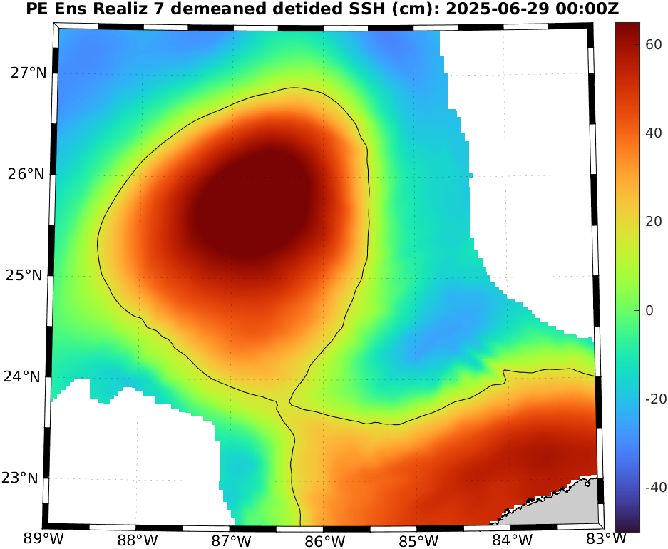 To define eddies, we used the 17 cm de-tided SSH contour in the deeper Gulf [Dukhovskoy et al., 2015]. Hence, for reach realization, we de-tide the SSH field and de-mean it over the region north of 22°N, west of 81.5°W, and deeper than 200 m (i.e., considering only the deep waters in the Gulf). We then extract the 17 cm contours of the resulting field, highlighting the locations of the LC and LCEs. To identify possible new LCE separation, we eliminate eddy remnants in the western Gulf by restricting to the region between 22.5°N and 27.5°N and between 89°W and 83°W. If a closed contour with an arclength of at least 200 km is fully contained in this region, this can indicate LCE detachment. We finally examine these realizations and count the number of LCE detachments.