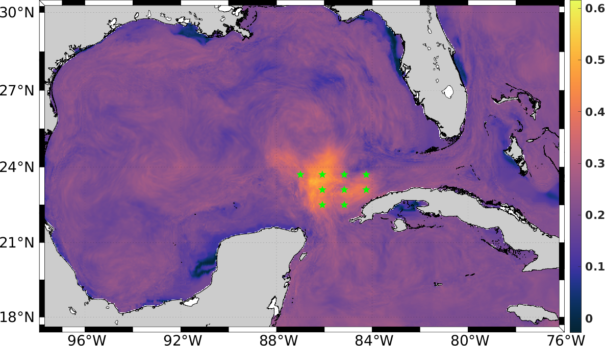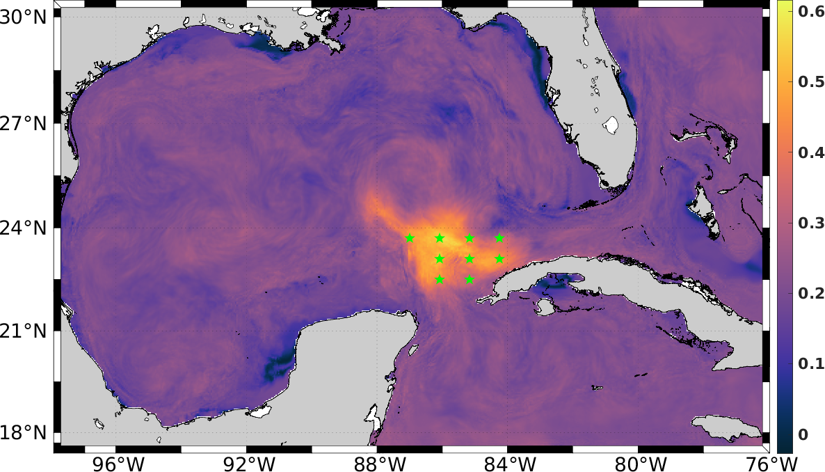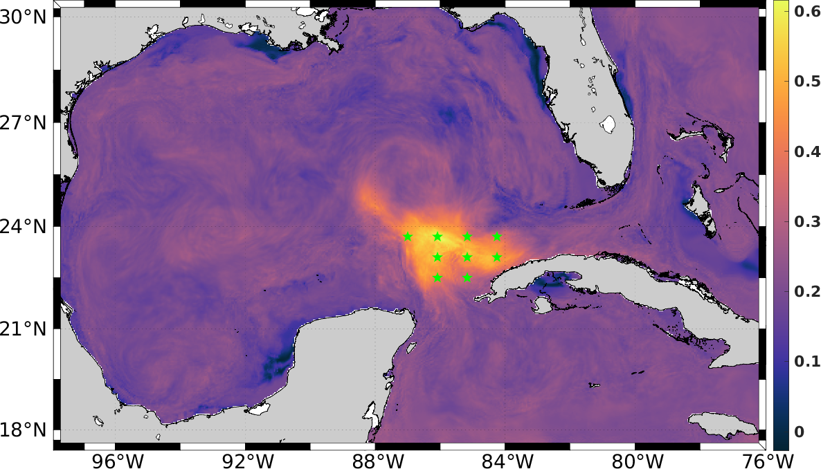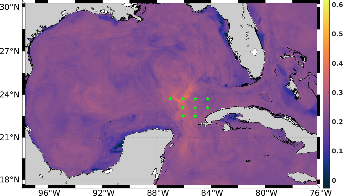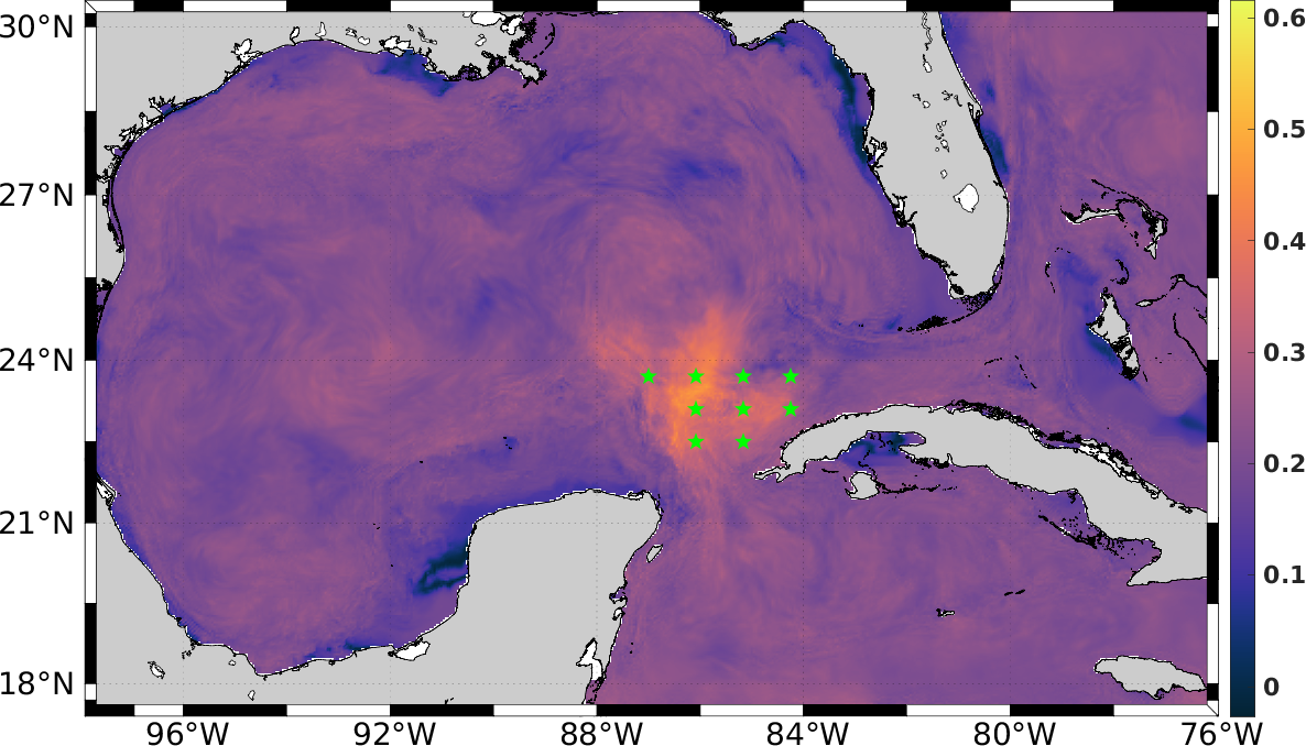 For the MI fields that we show in the table below, the goal is to predict the location of candidate future glider observations (temperature and salinity profiles) on different days (00Z July 6-13) that are the most informative about the target σT, on 00Z July 14, 2025, in the region of the forecast neck of the LC and its uncertainty.