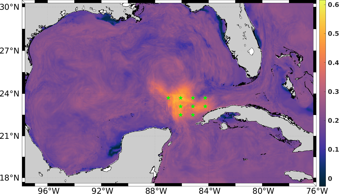 The locations with highest MI (bright yellow) on each day indicate where glider T and S profile observations are predicted to be most informative about the neck of the LC and its uncertainty at 00Z on July 14, 2025. The results indicate that early on sampling in region where the LCE may potentially separate from the LC is more important. As the measurement time gets closer to the verification time sampling in the LC outside of the potential LCE is more important.