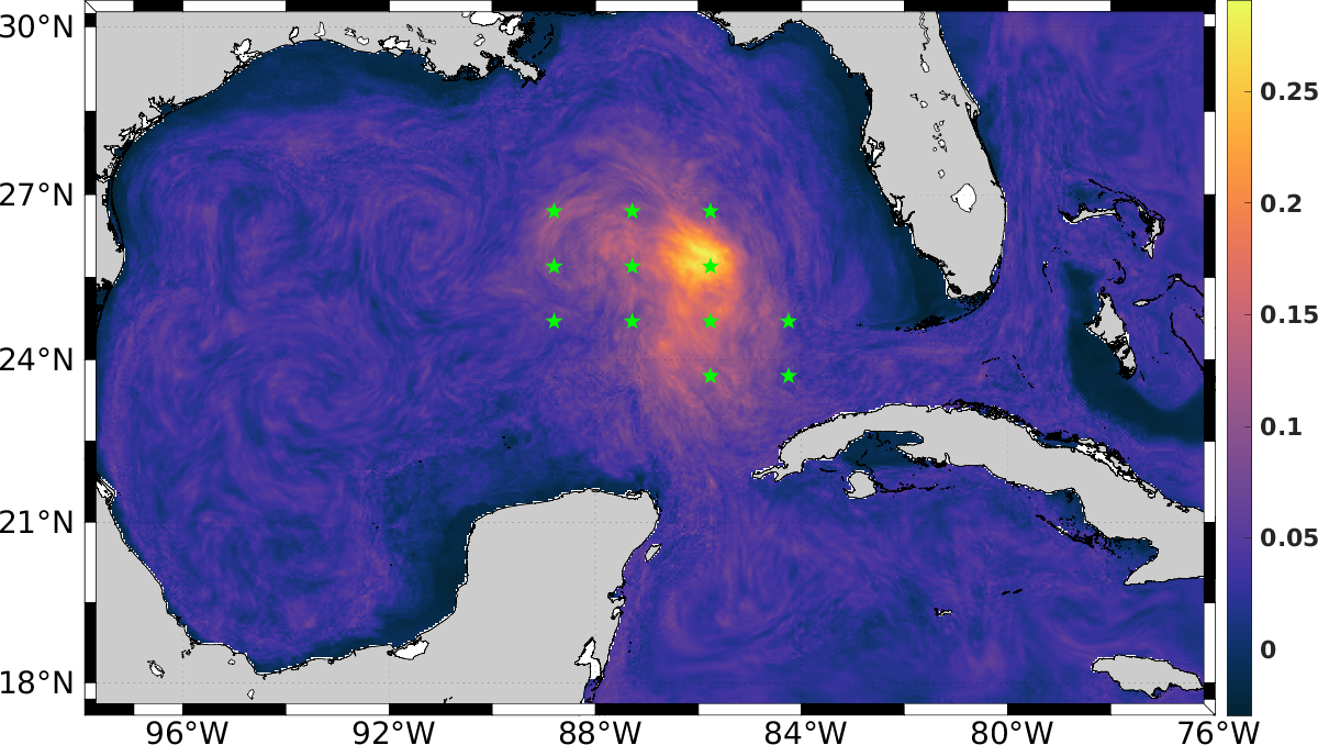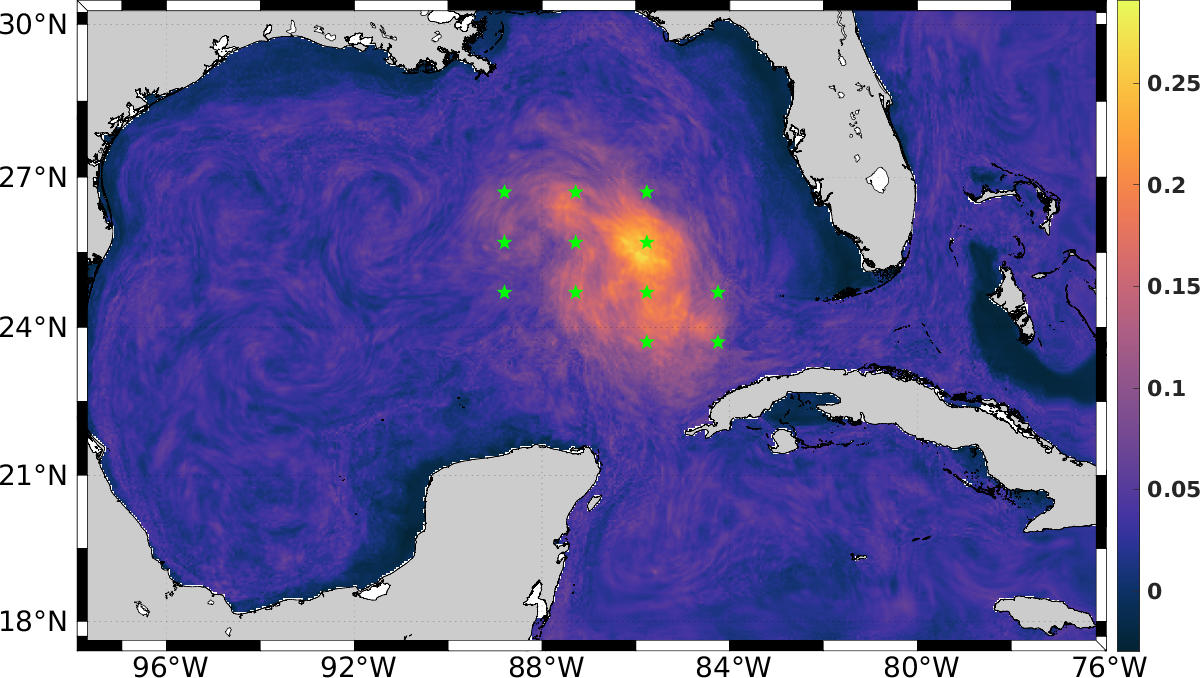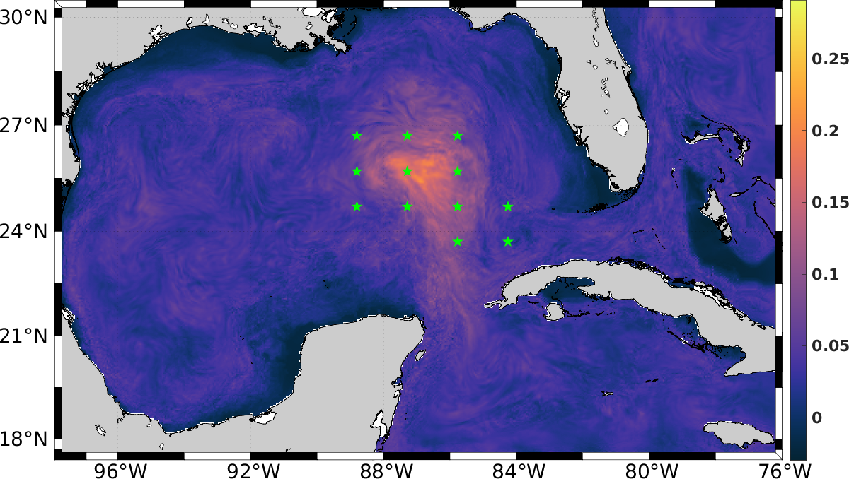 - The target (verification) variables are the σT fields in the region of the forecast LC and its uncertainty at 00Z on May 15, 2025. These fields are defined by σT profiles at all the locations shown by green stars taken together, at 00Z on May 15, 2025, at 150m, 300m, and 500m depths (in the region of the forecast LC and its uncertainty).