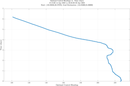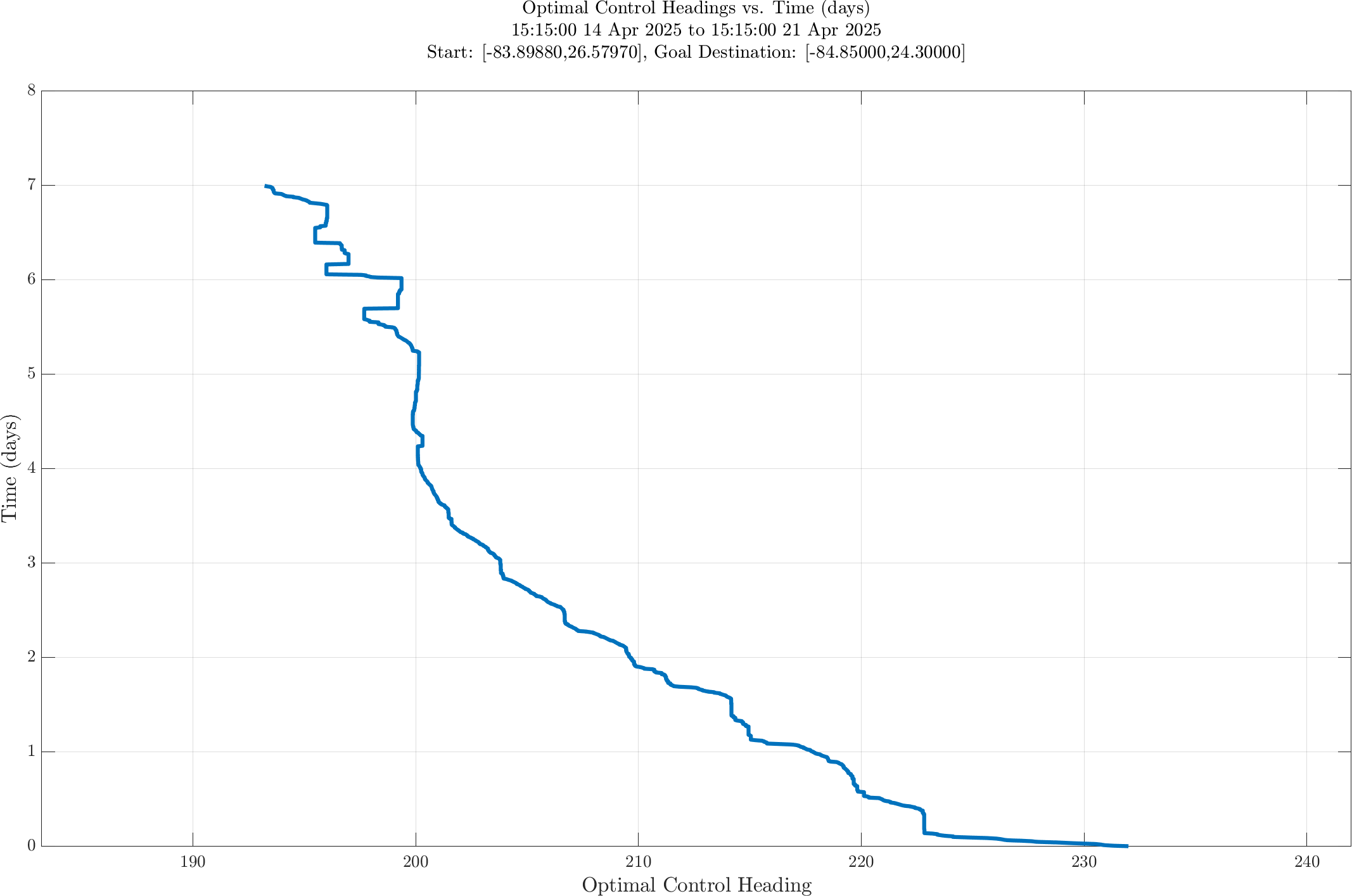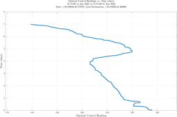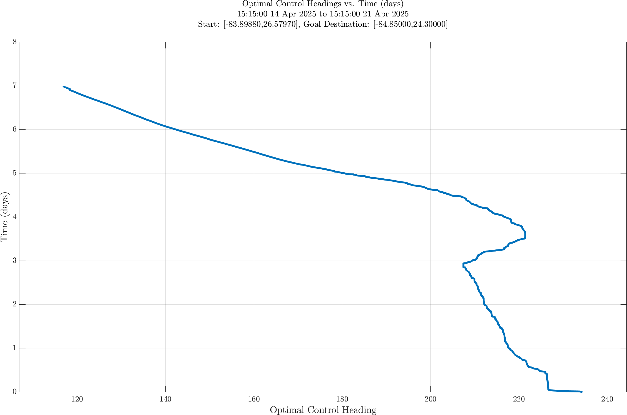 In the third panel, the optimal heading angle (degrees, measured clockwise from true north) vs. time is shown.