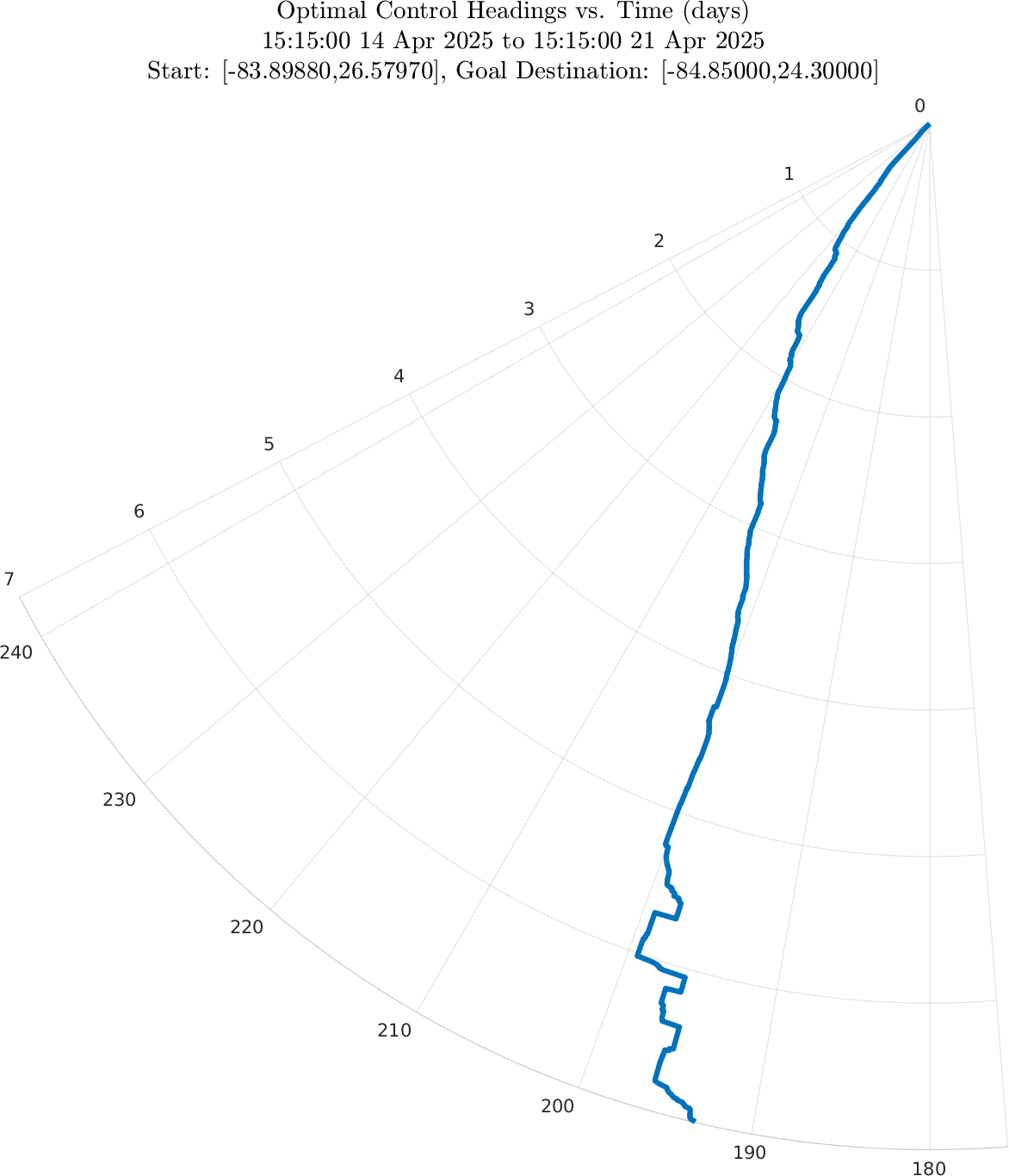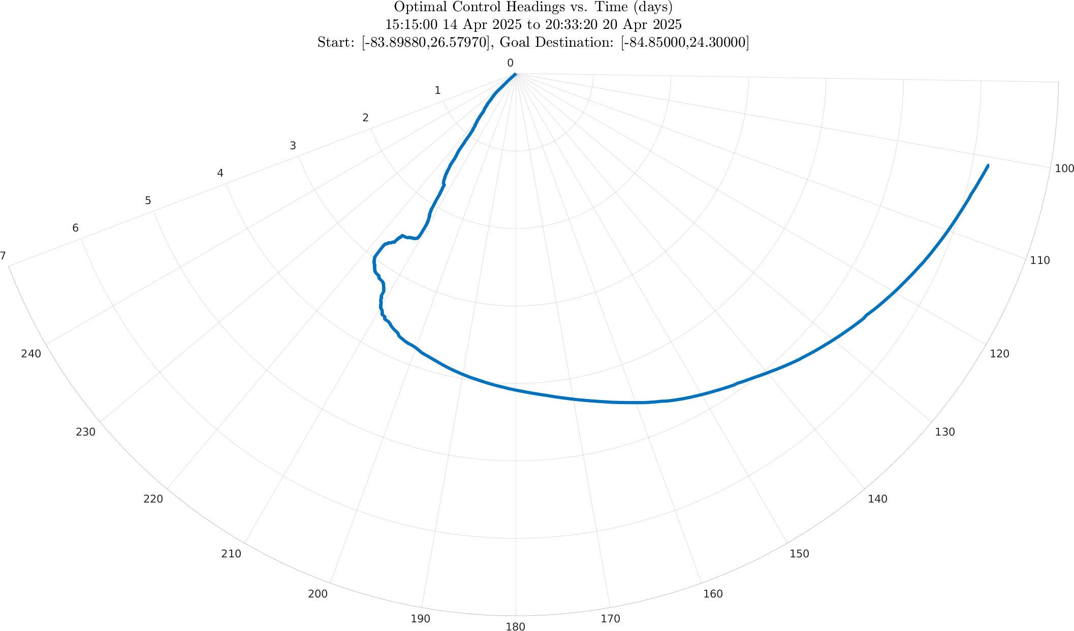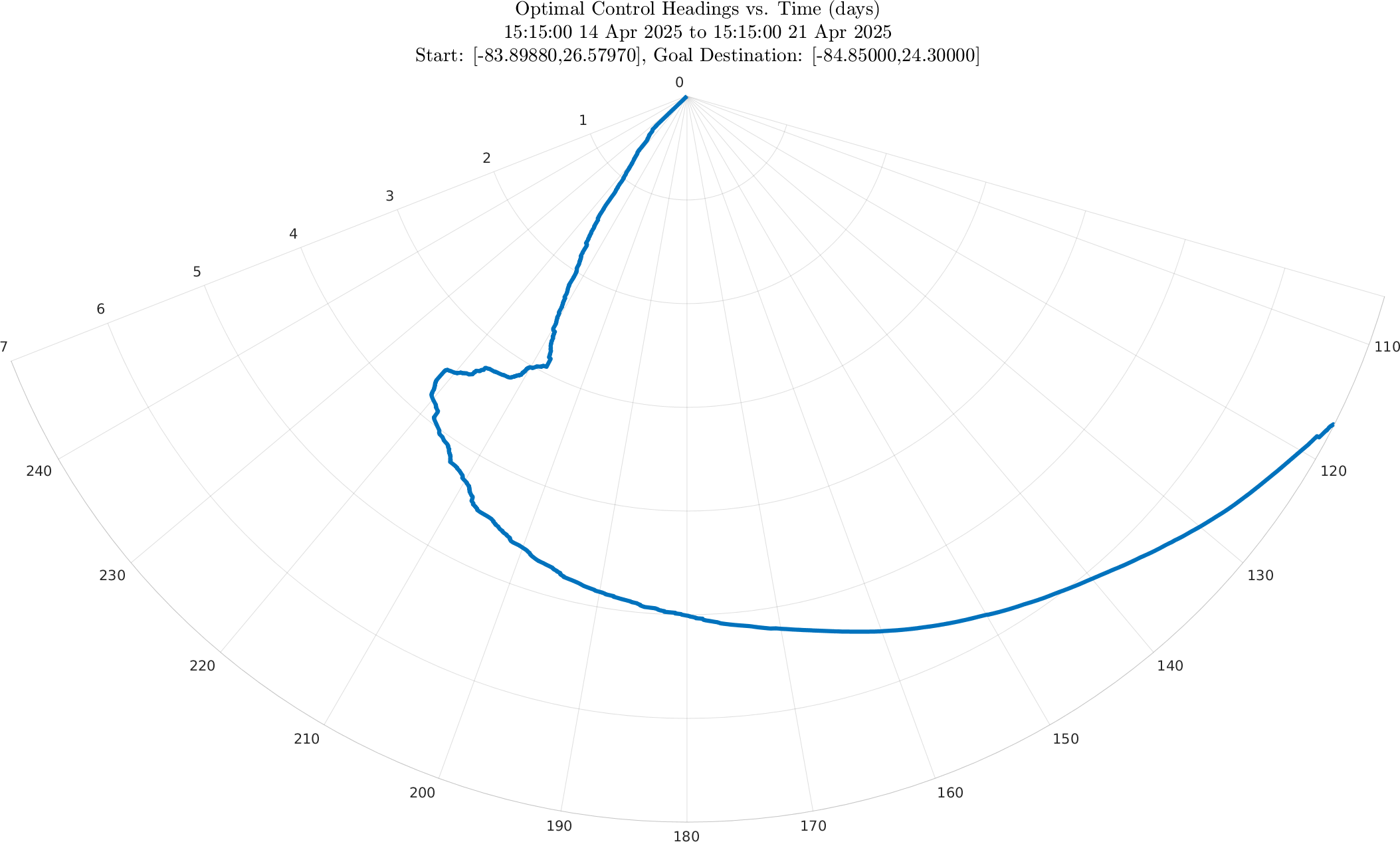 The fourth panel also shows the optimal heading angle with time, as a polar plot with time on the r-axis.
