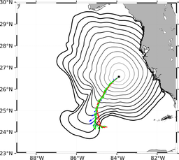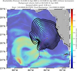 In this forecast, we consider glider RU38's actual starting location of 26.5797°N, 83.8988°W on 14 Apr 1515Z. The final target point for the time-optimal path forecast is the center of the Tortugas Eddy provided by the MSEAS ocean forecast on April 22 0Z.