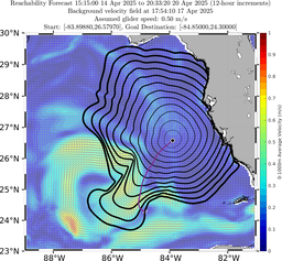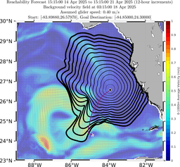 In the first panel, the black contours shown are reachability front forecasts, at 6 hour intervals (with increasing line thickness for later times). The reachability front is the boundary of the largest set (the reachable set) that the glider can reach within that duration. It is computed by numerically solving our exact governing PDE for this time-optimal reachability front. The time-optimal path from the starting postion to the desired recovery position is shown by the purple curve.