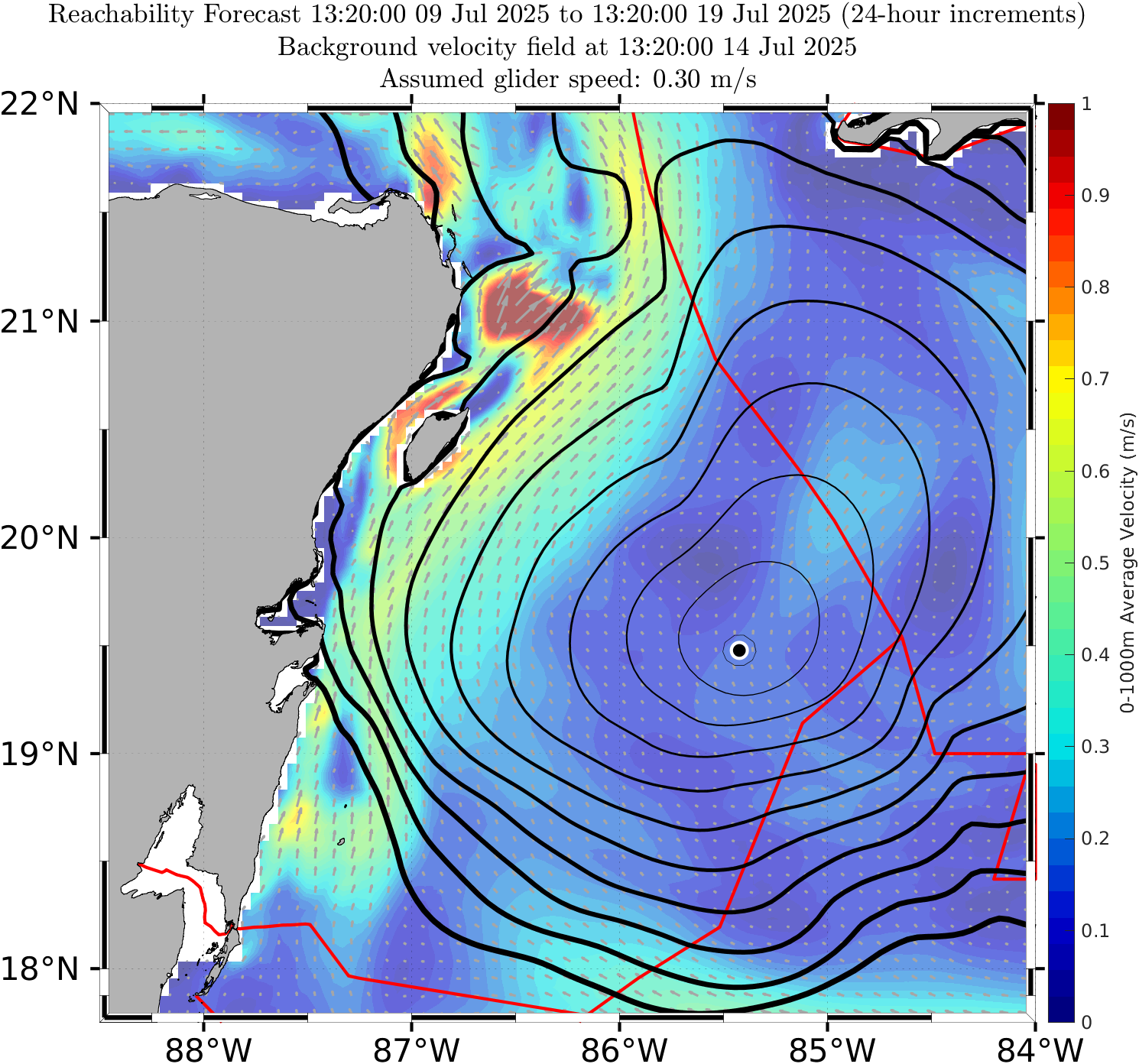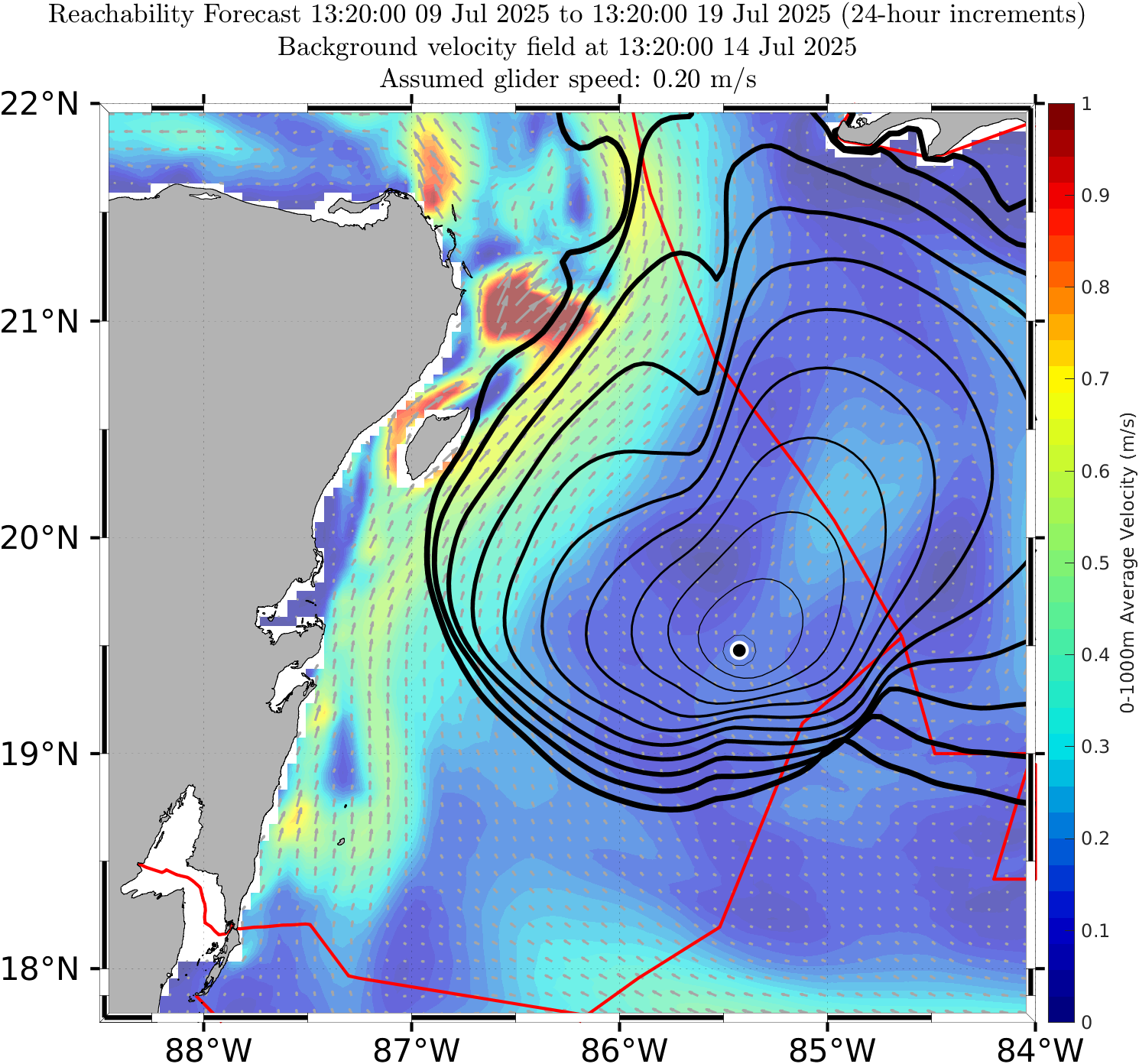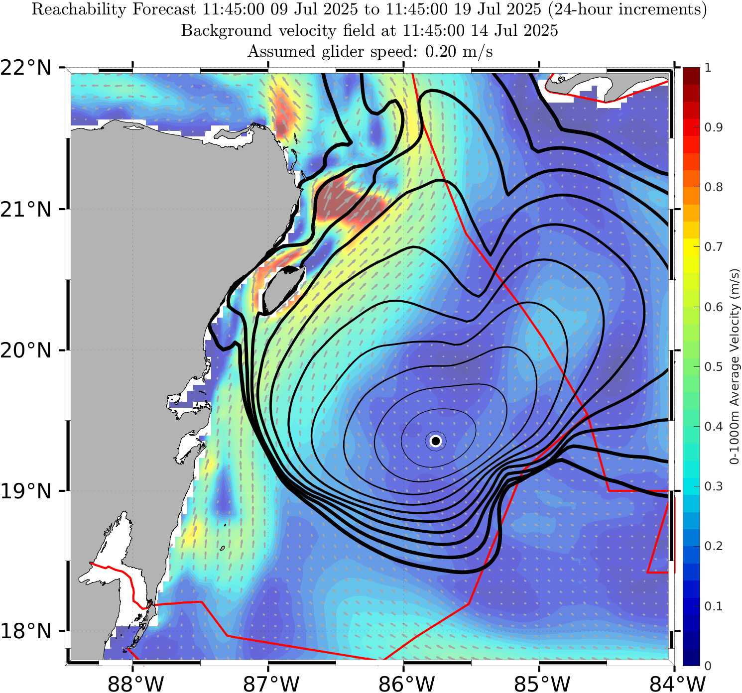 The black contours shown are reachability front forecasts, at 24 hour intervals (0hr to 240hr forecasts, with increasing line thickness for later times). The reachability front is the boundary of the largest set (the reachable set) that the glider can reach within that duration. It is computed by numerically solving our exact governing PDE for this time-optimal reachability front.