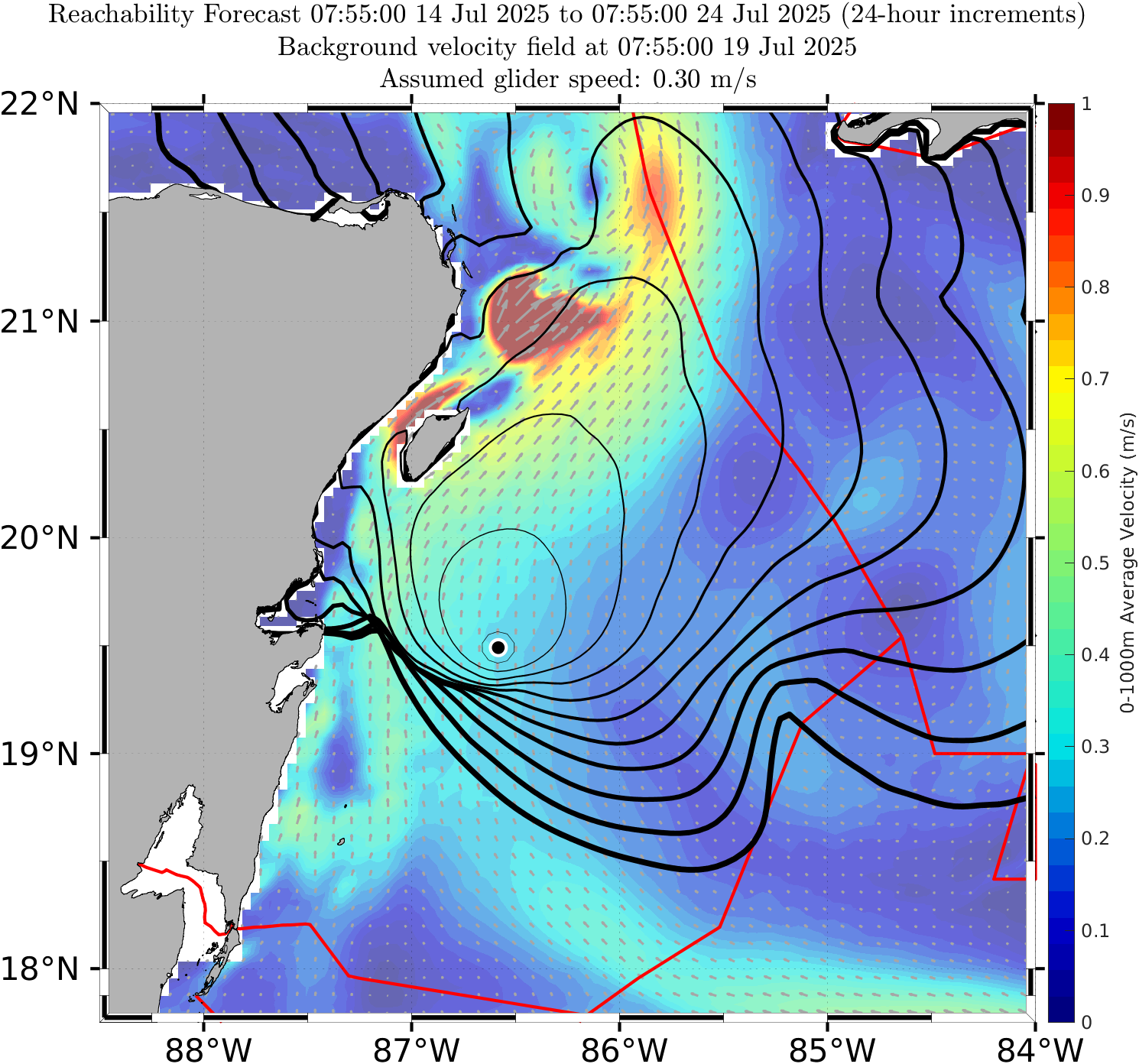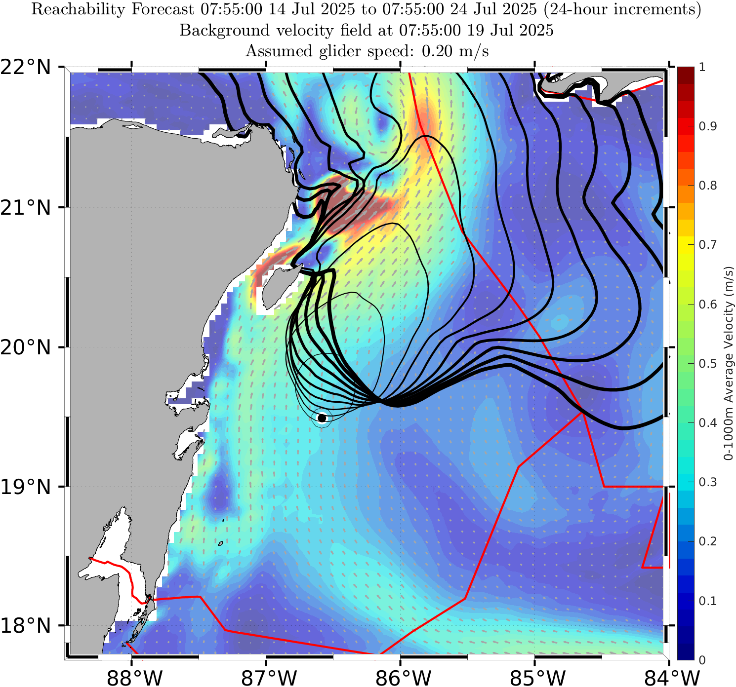 The black contours shown are reachability front forecasts, at 24 hour intervals (0hr to 240hr forecasts, with increasing line thickness for later times). The reachability front is the boundary of the largest set (the reachable set) that the glider can reach within that duration. It is computed by numerically solving our exact governing PDE for this time-optimal reachability front.