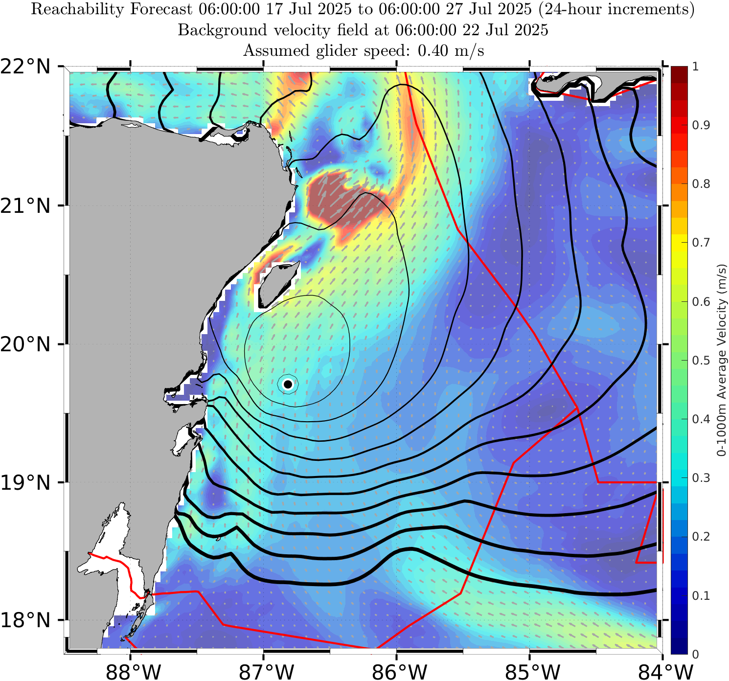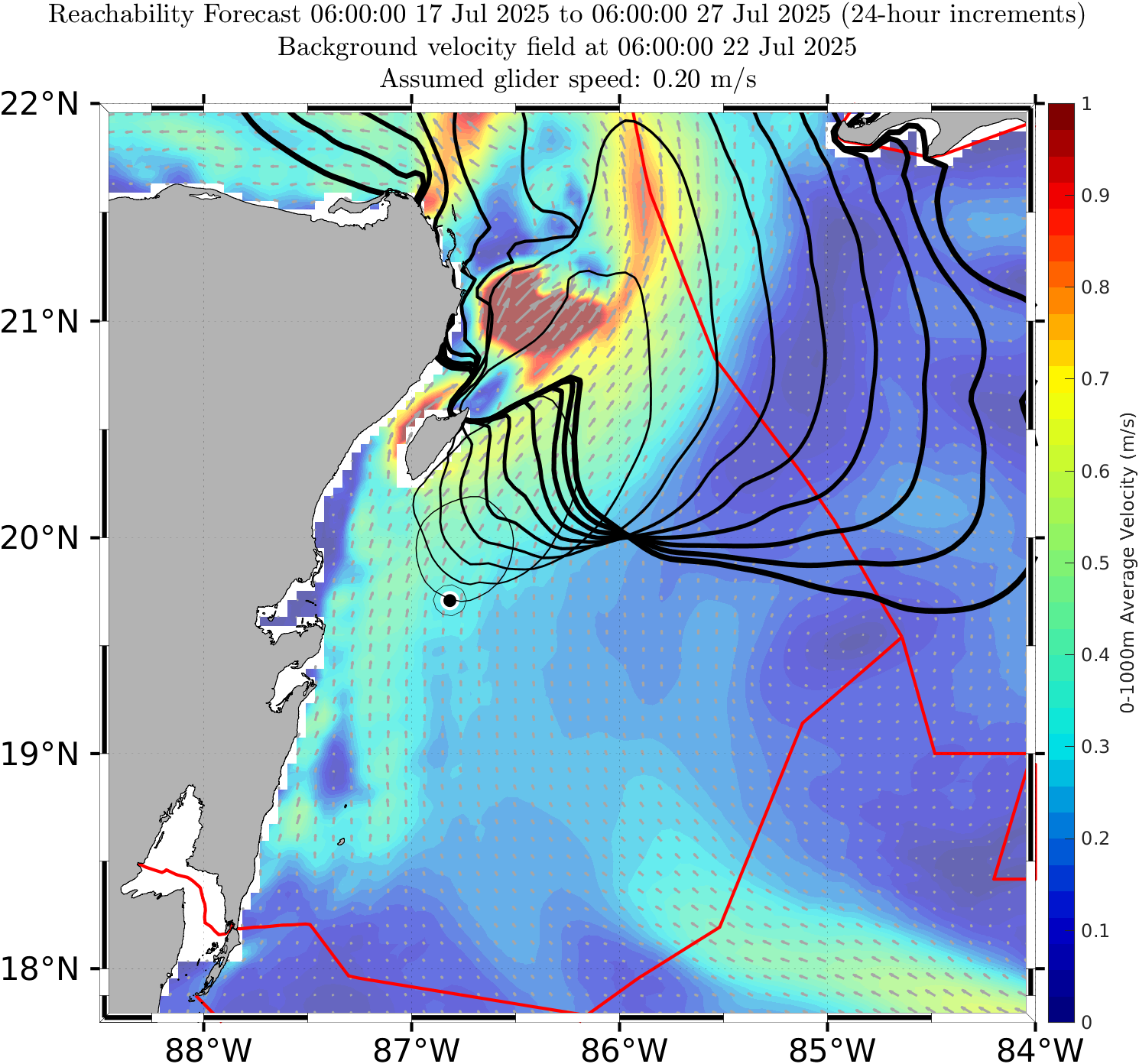 The black contours shown are reachability front forecasts, at 24 hour intervals (0hr to 240hr forecasts, with increasing line thickness for later times). The reachability front is the boundary of the largest set (the reachable set) that the glider can reach within that duration. It is computed by numerically solving our exact governing PDE for this time-optimal reachability front.
