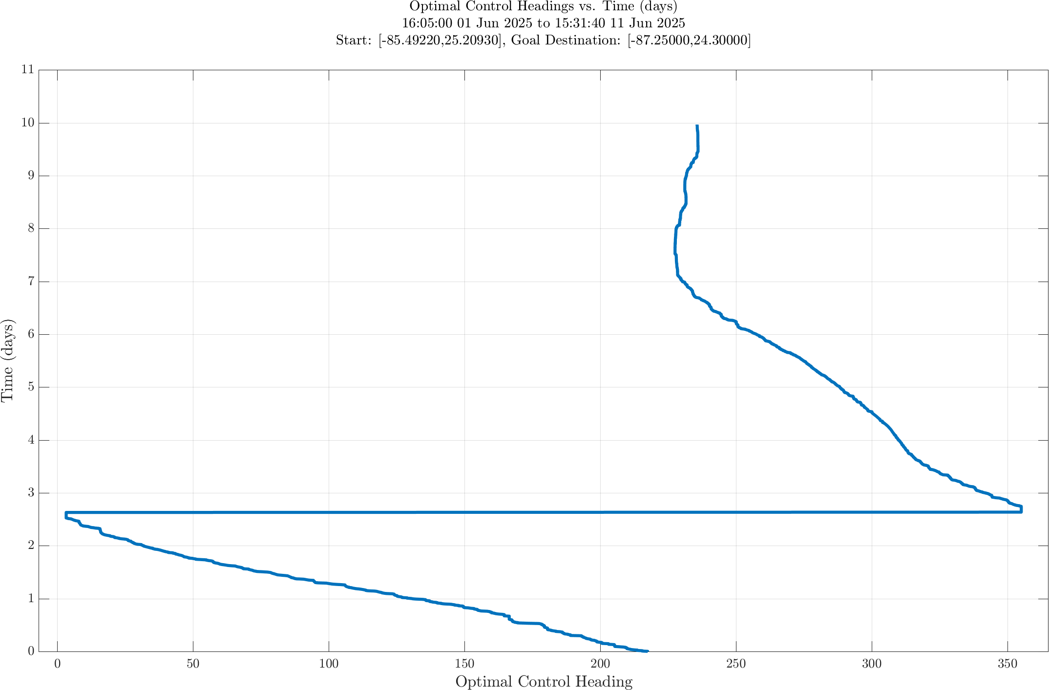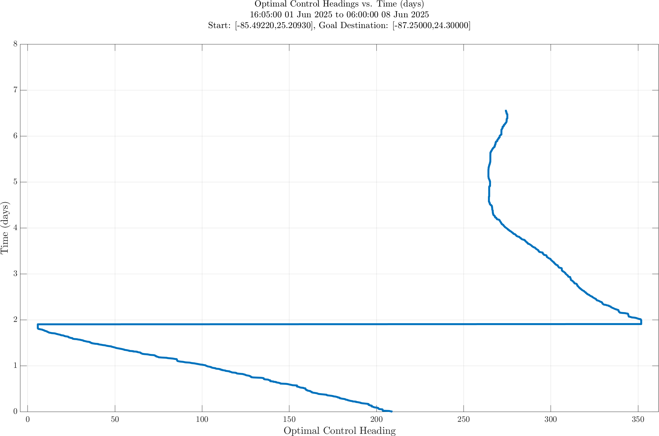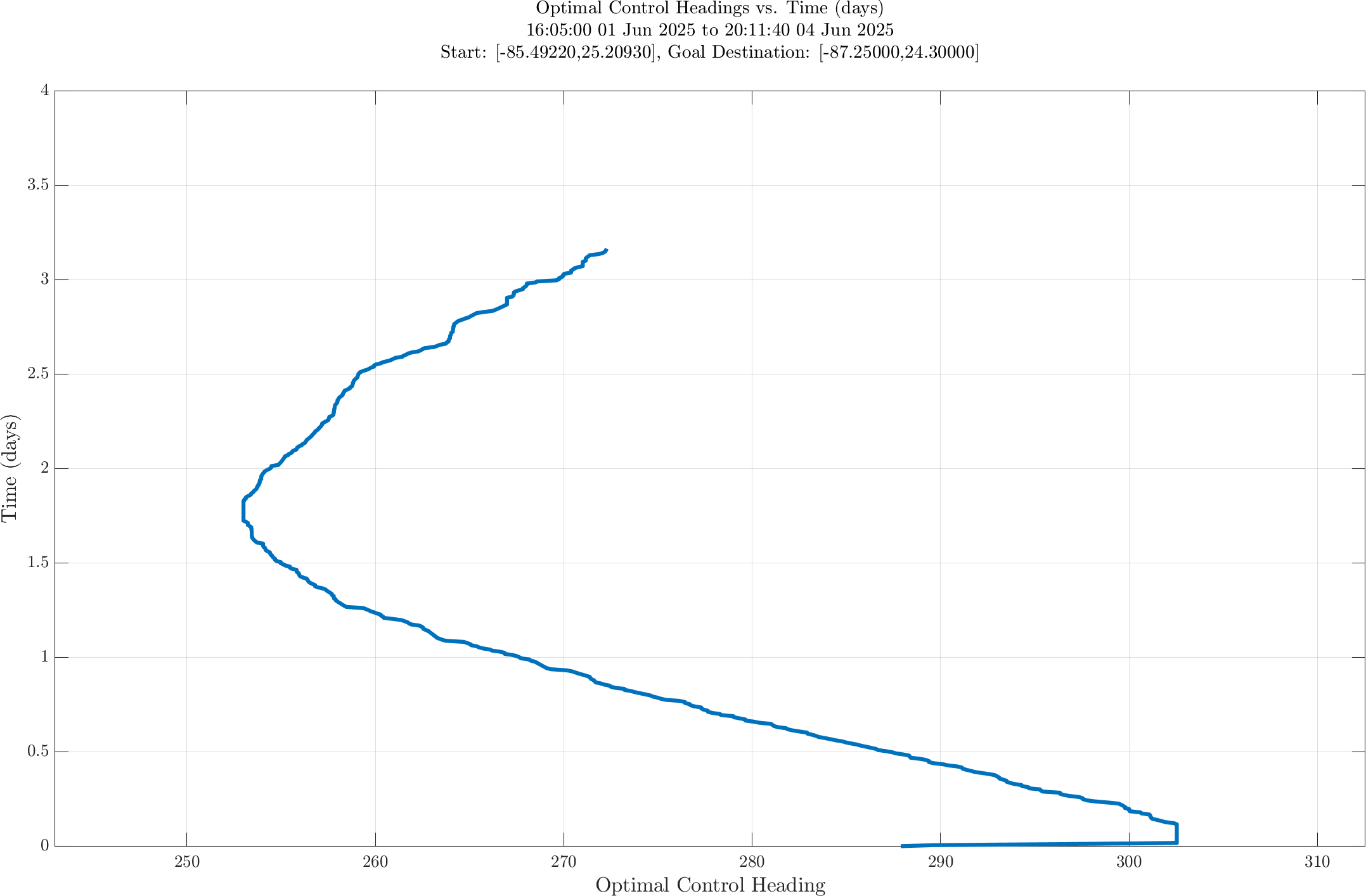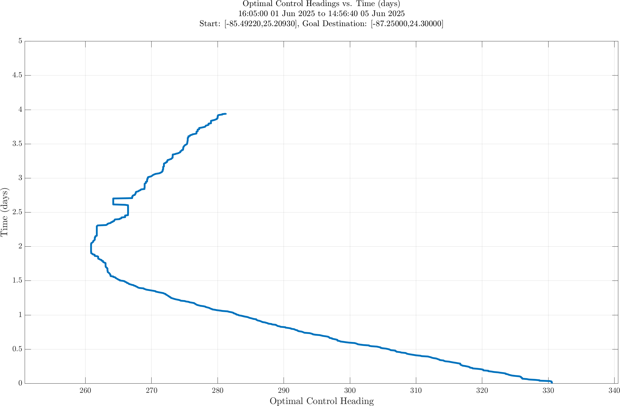In the third panel, the optimal heading angle (degrees, measured clockwise from true north) vs. time is shown.
