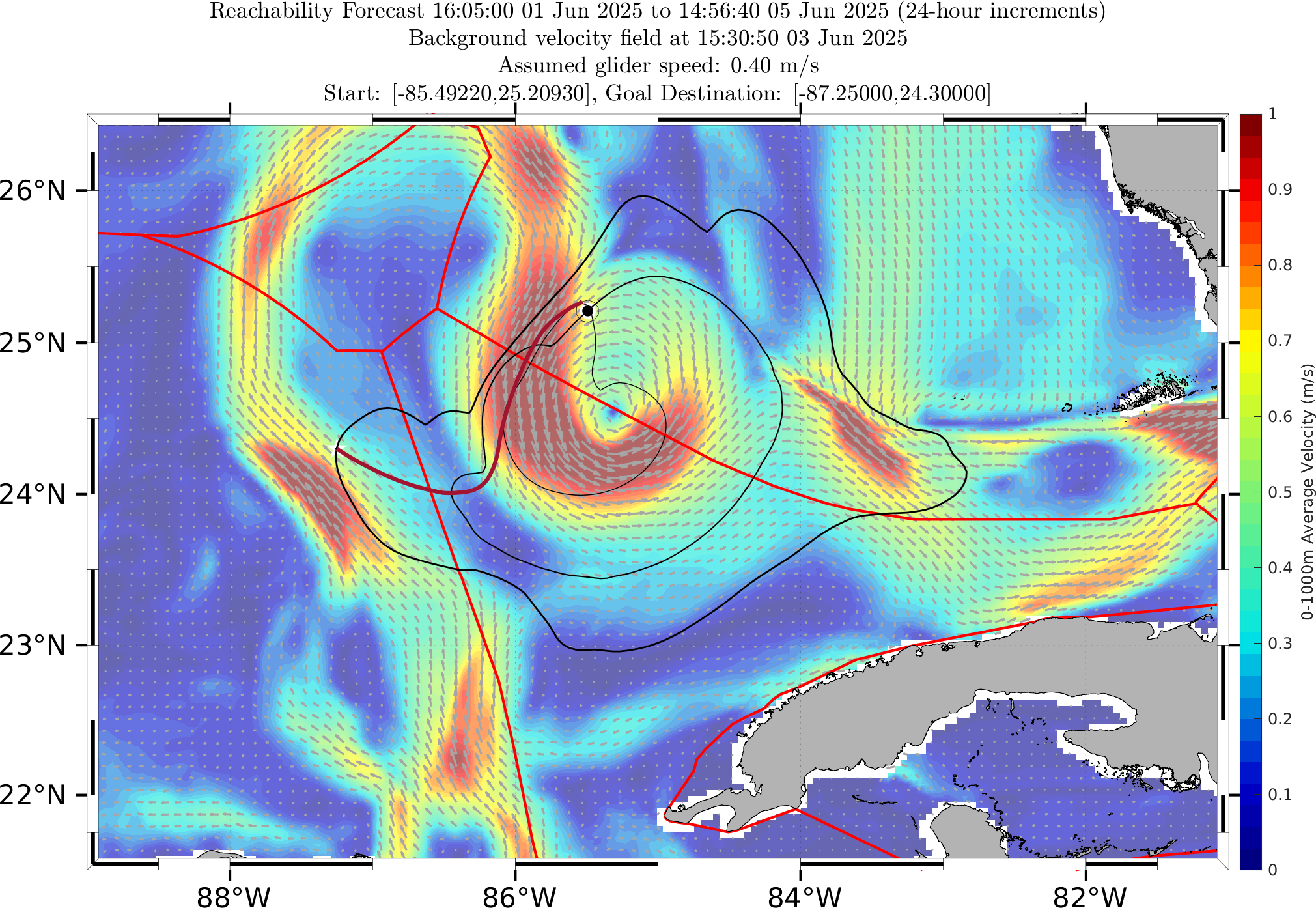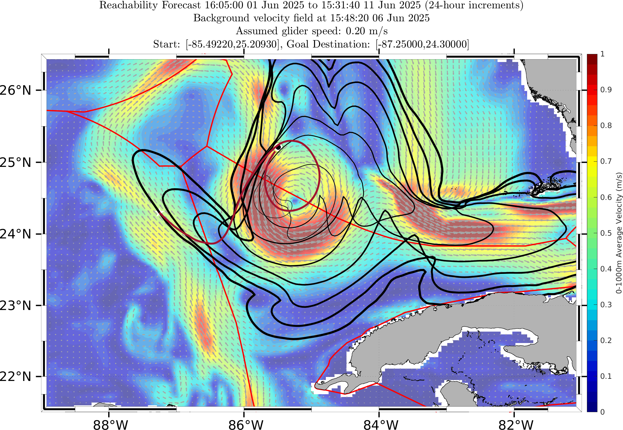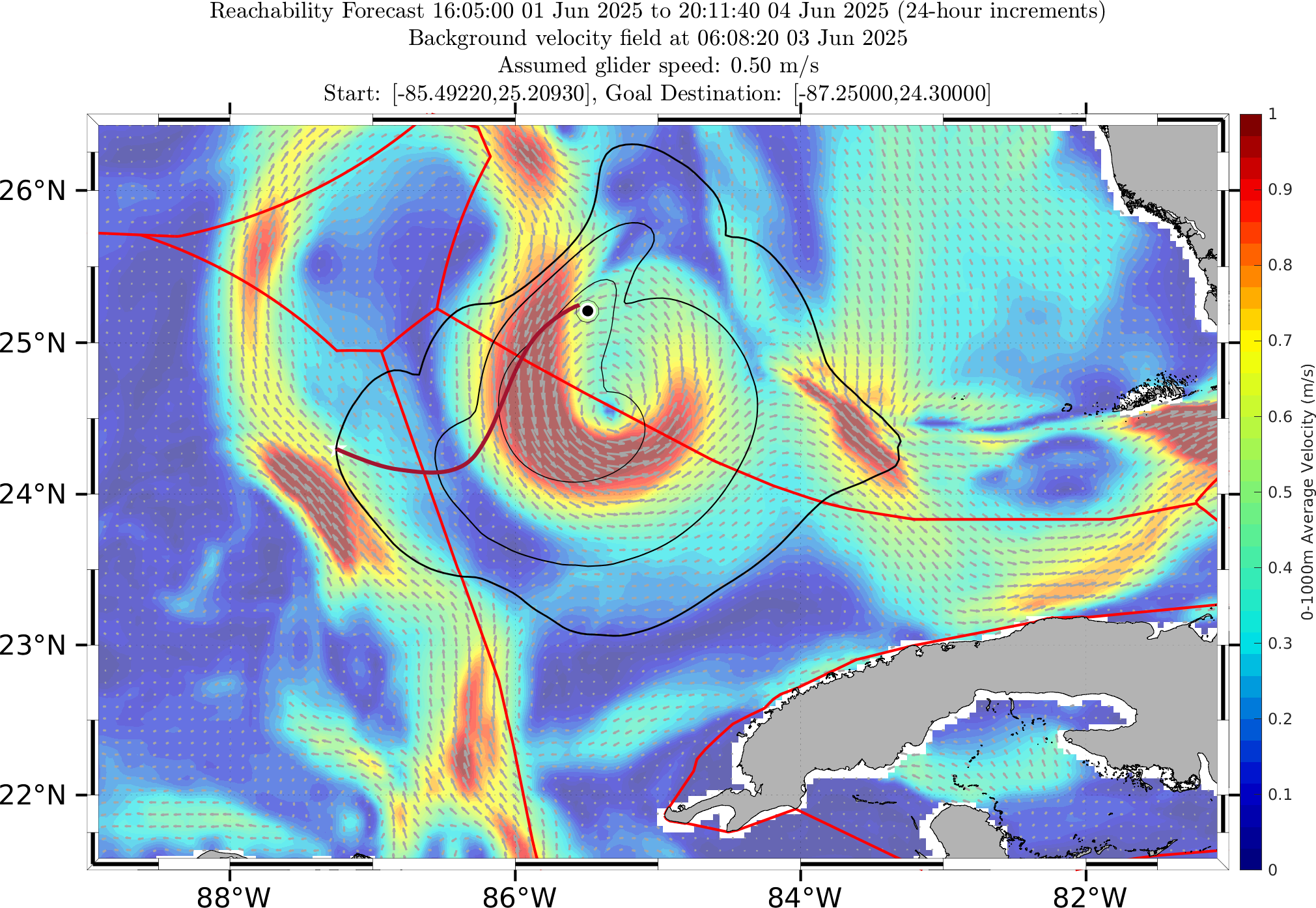 In this forecast, we consider glider RU38's actual starting location of 25.2093°N, 85.4922°W on 01 Jun 1115Z. The final target point for the time-optimal path forecast is the western branch of the LC provided by the MSEAS ocean forecast on Jun 12 0Z.