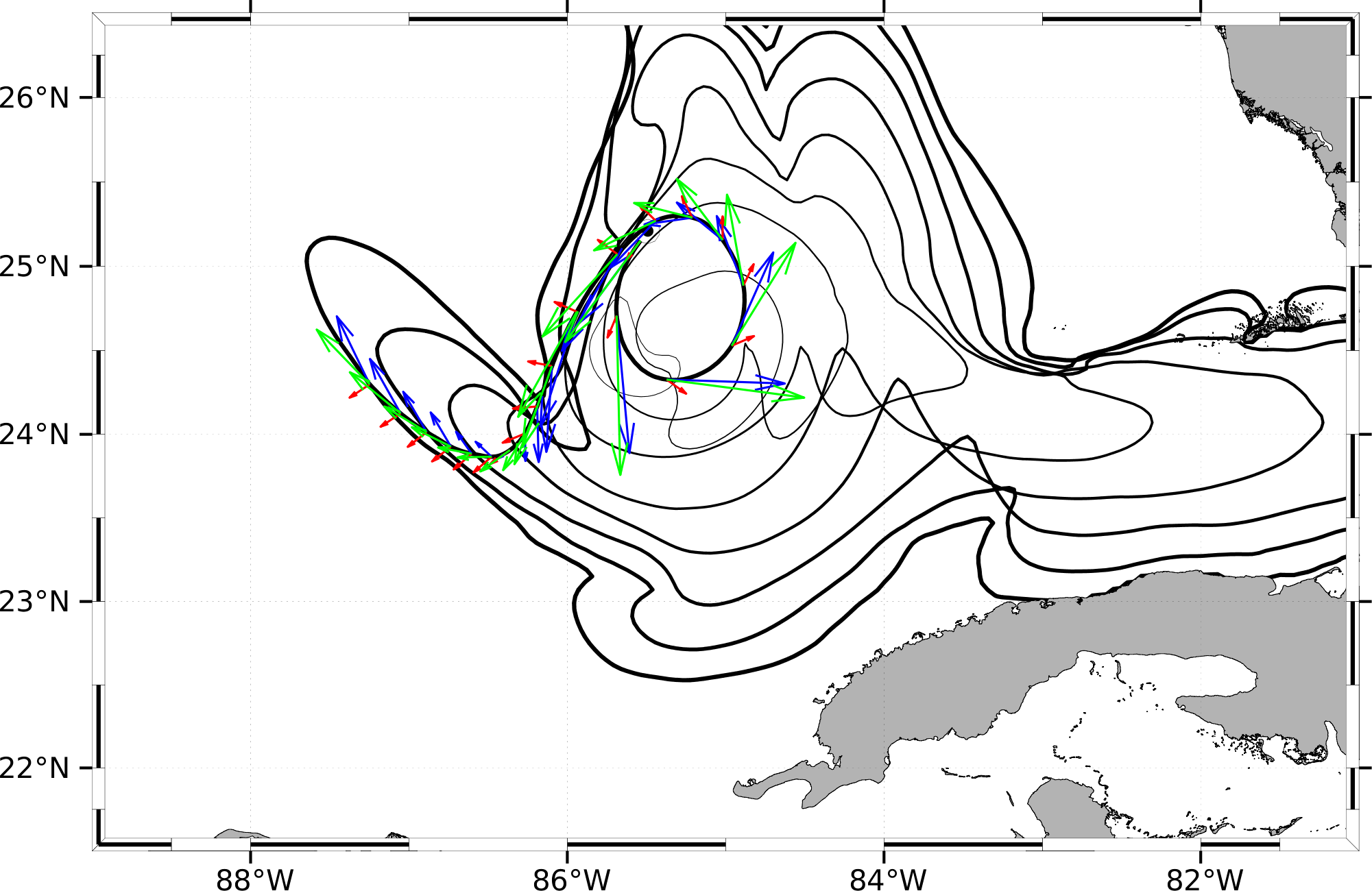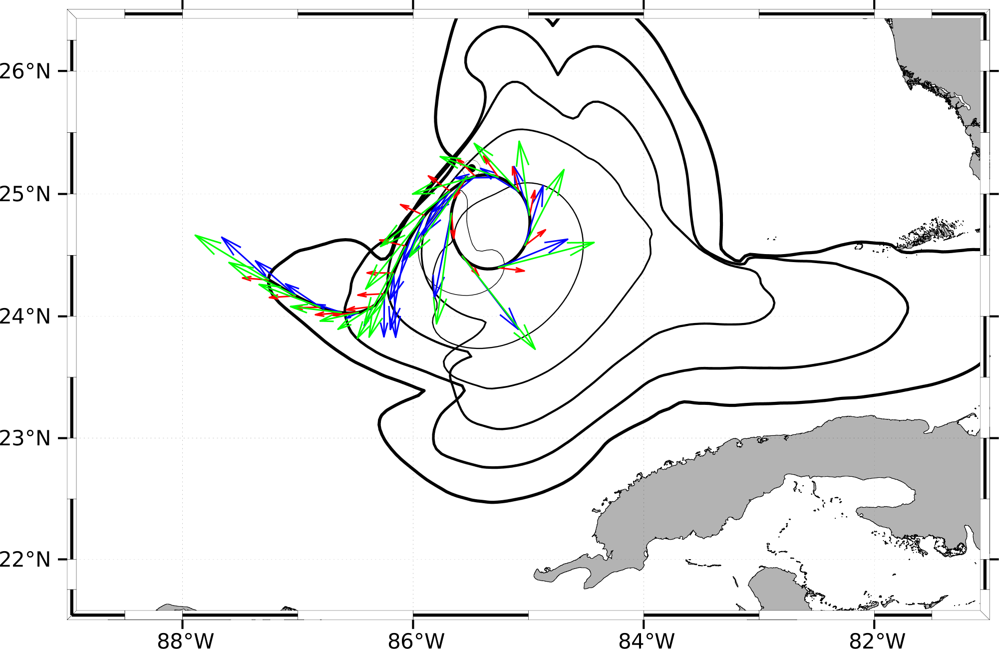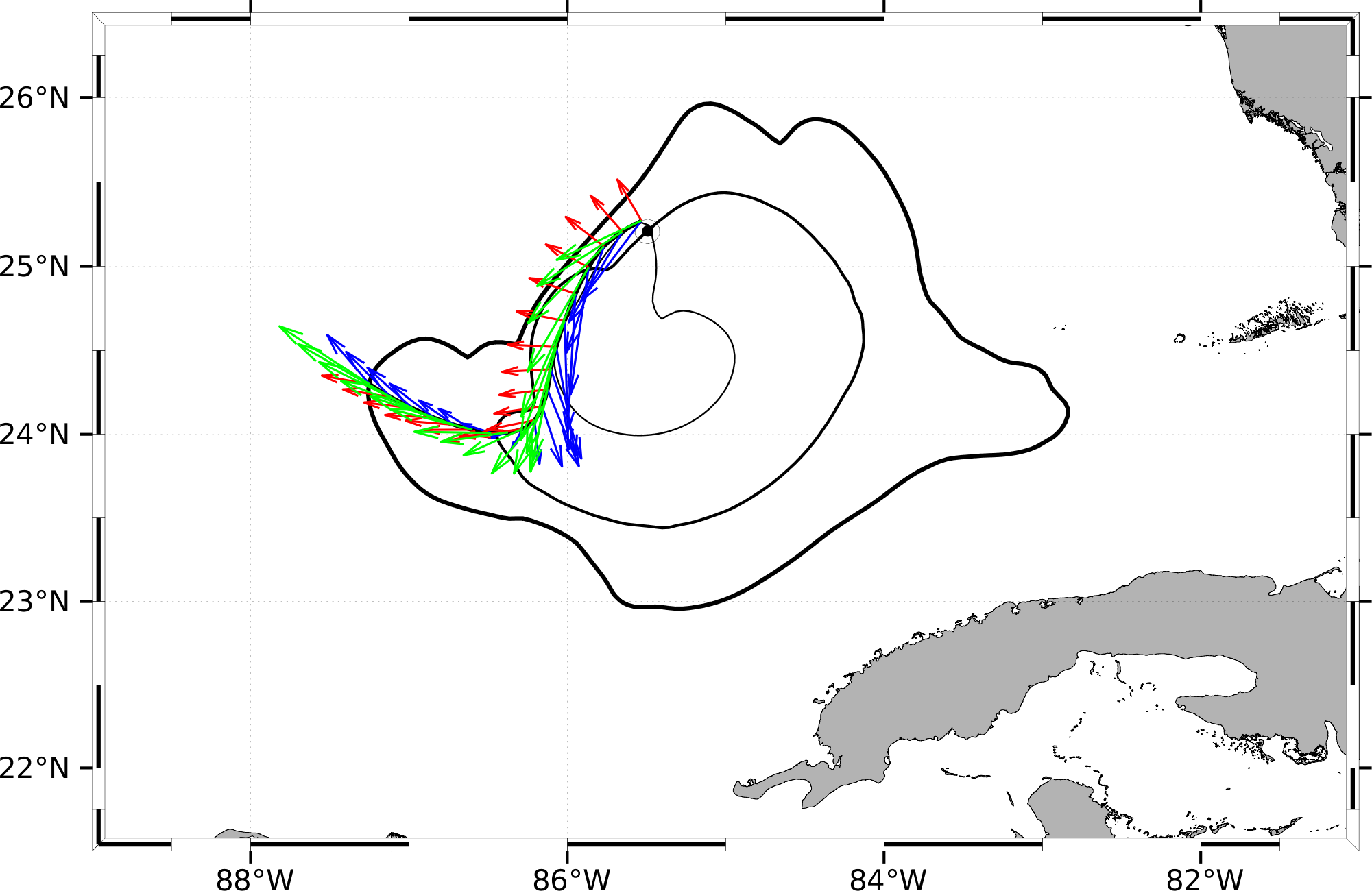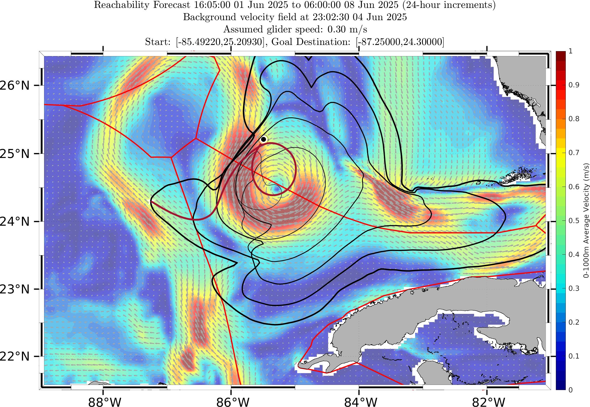 In this forecast, we consider glider RU38's actual starting location of 25.2093°N, 85.4922°W on 01 Jun 1115Z. The final target point for the time-optimal path forecast is the western branch of the LC provided by the MSEAS ocean forecast on Jun 12 0Z.